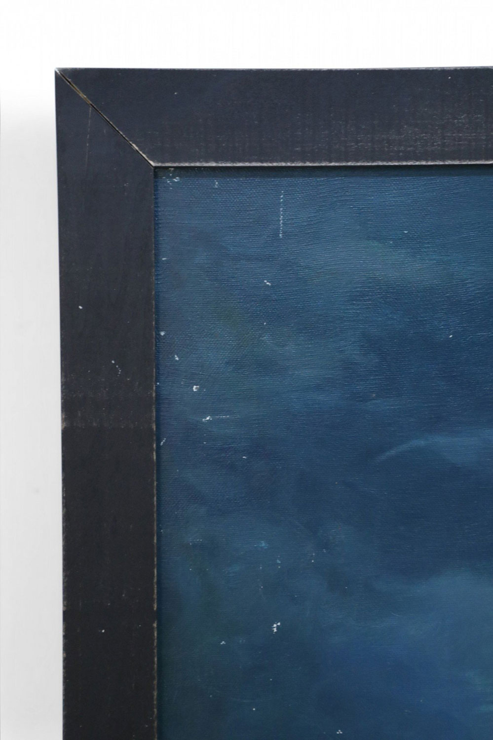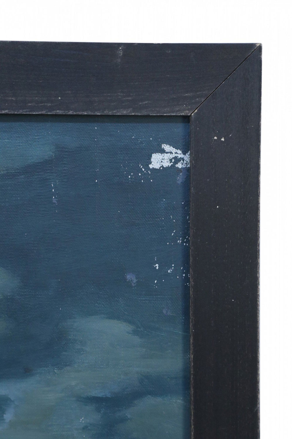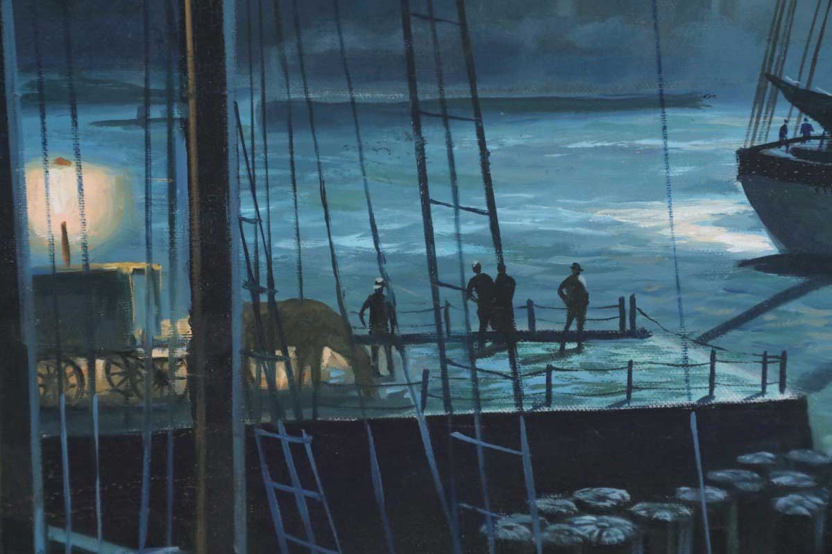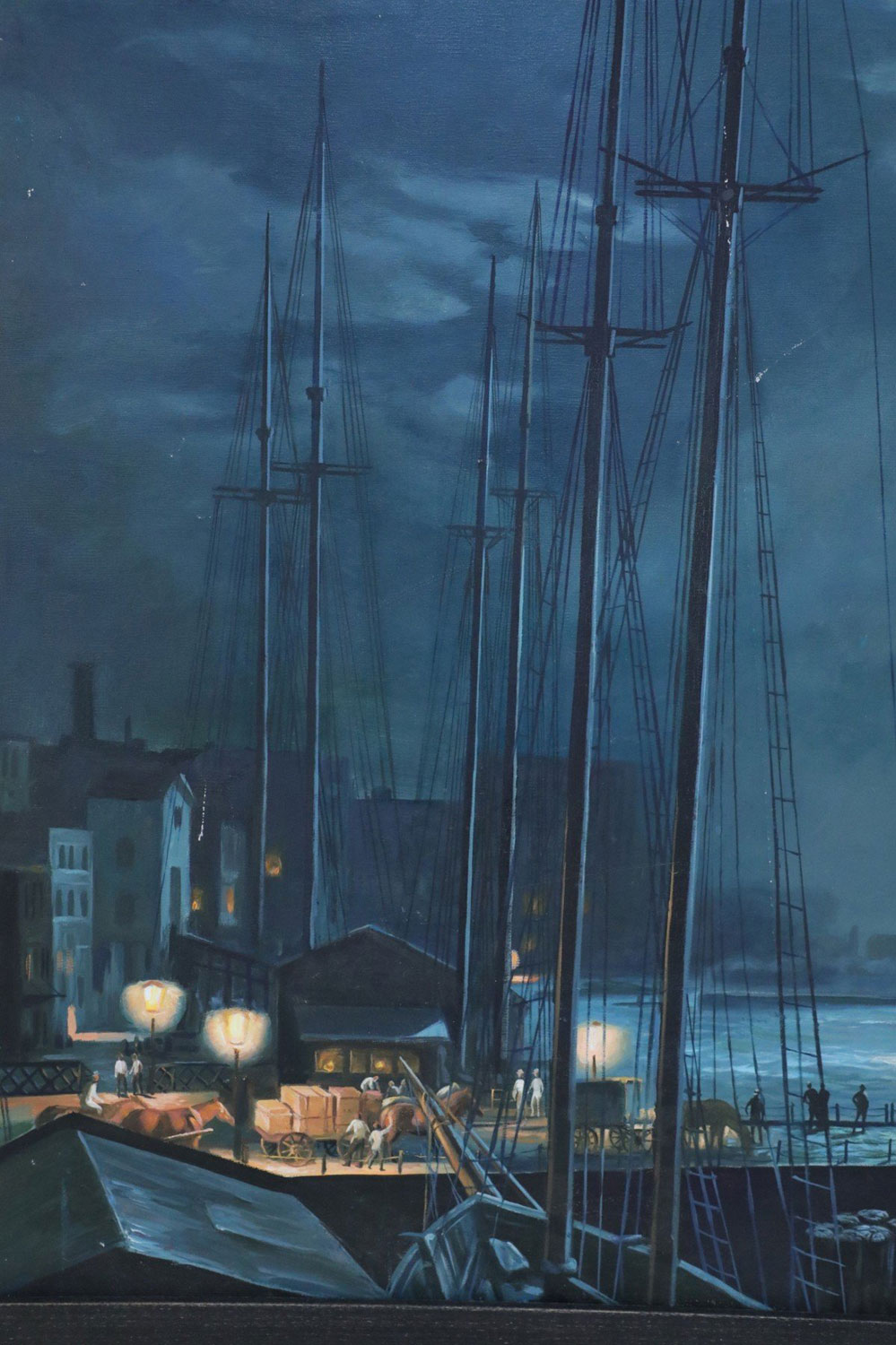 Mid-Century seascape oil painting depicting a dock scene with ships coming in to port while dockworkers unload cargo by lantern light in a black painted wooden frame.