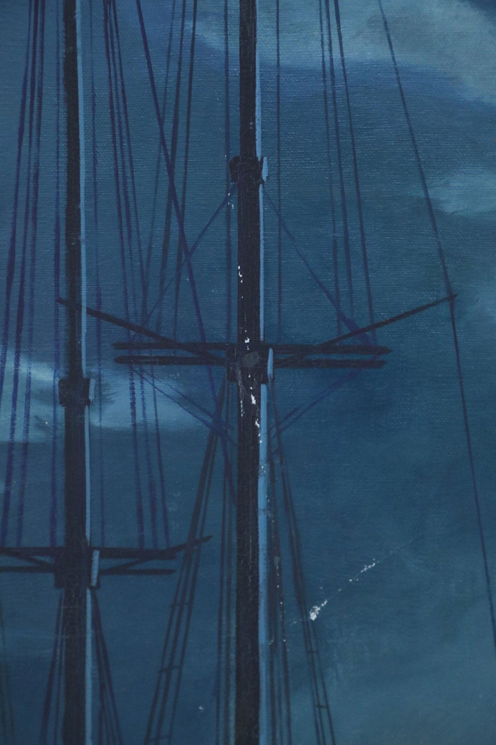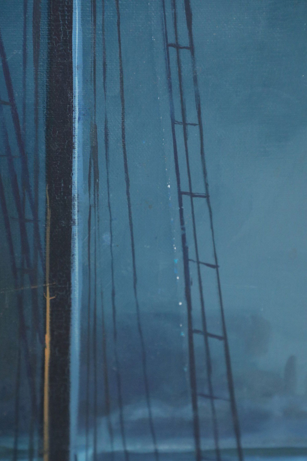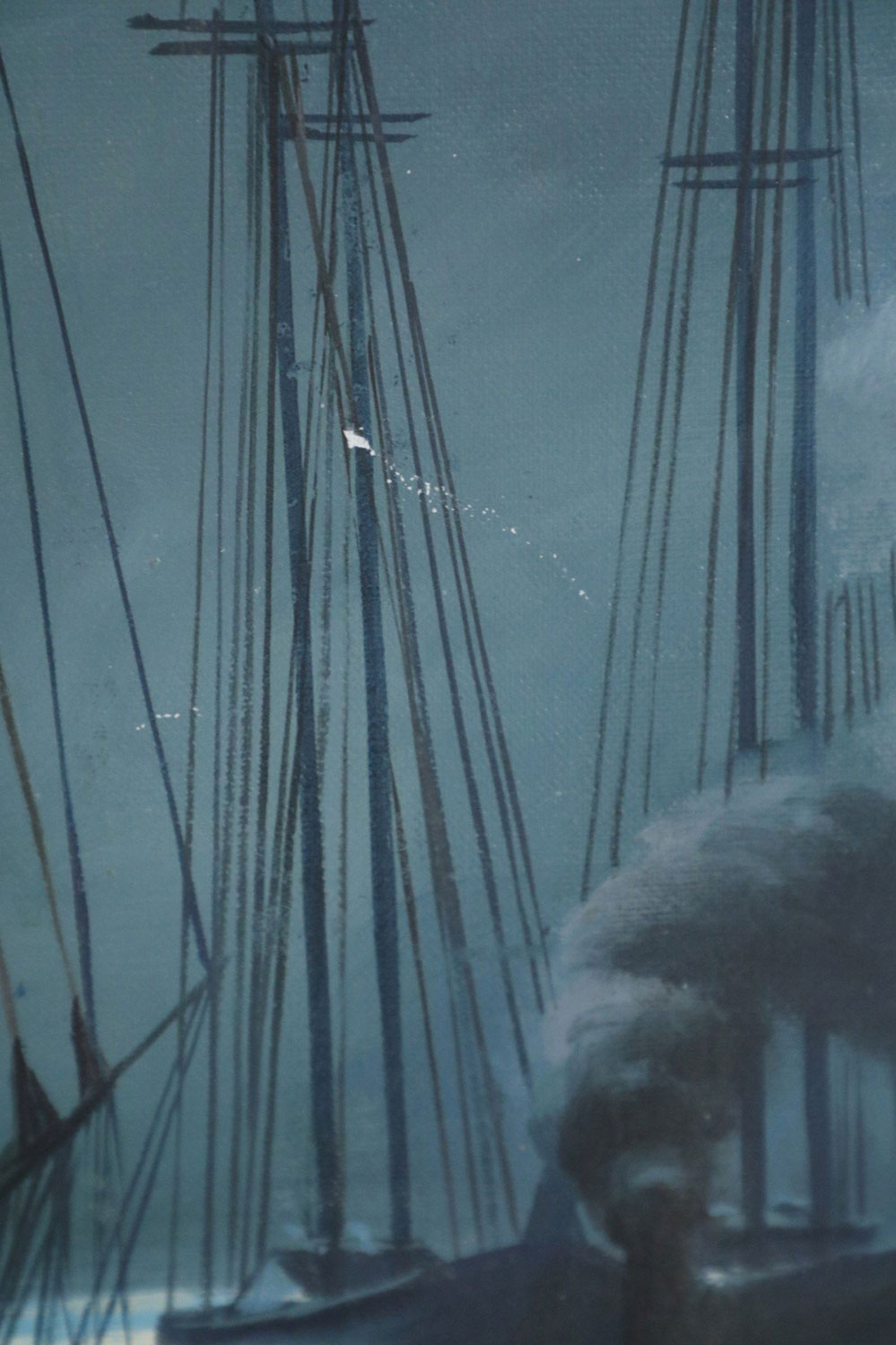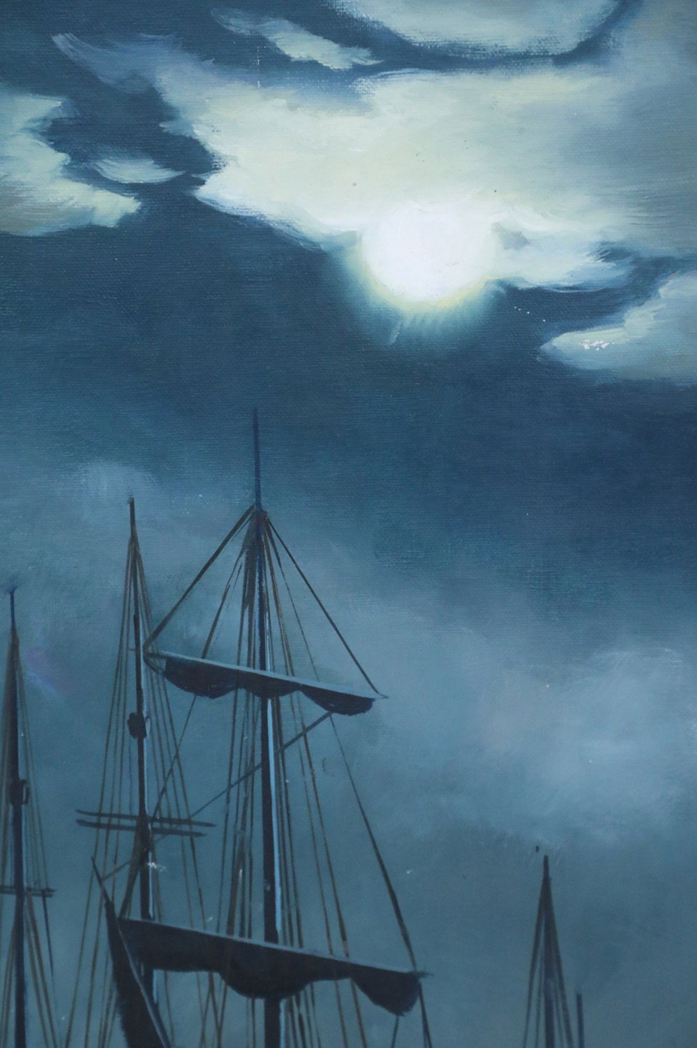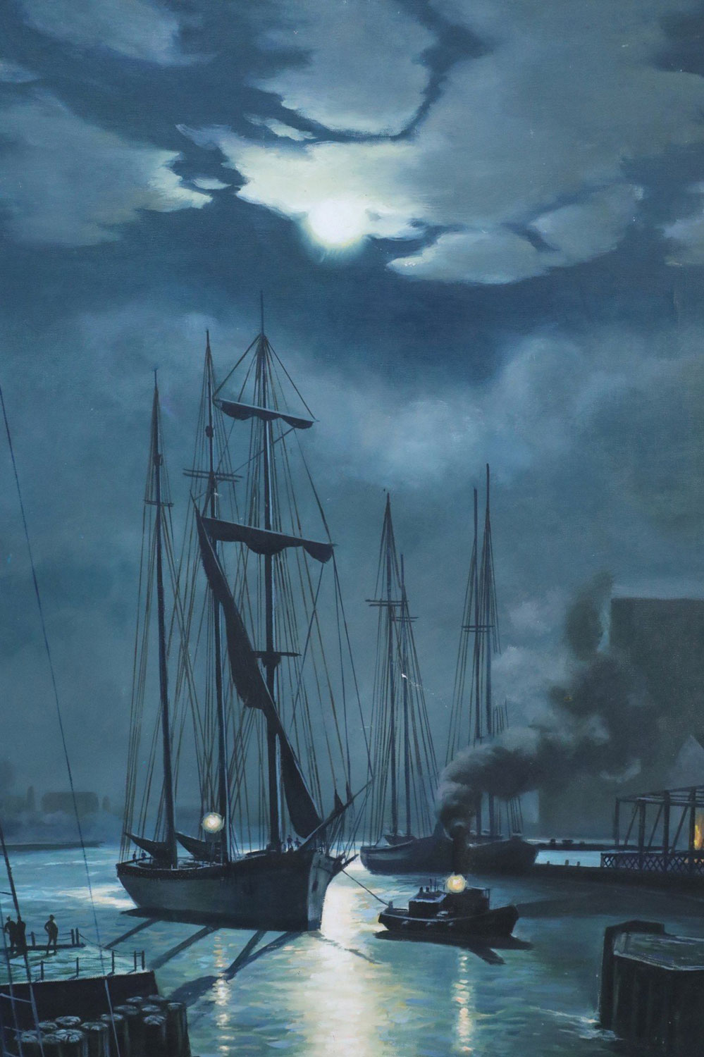 Framed Seascape Oil Painting of Ships Coming in to Dock at Night