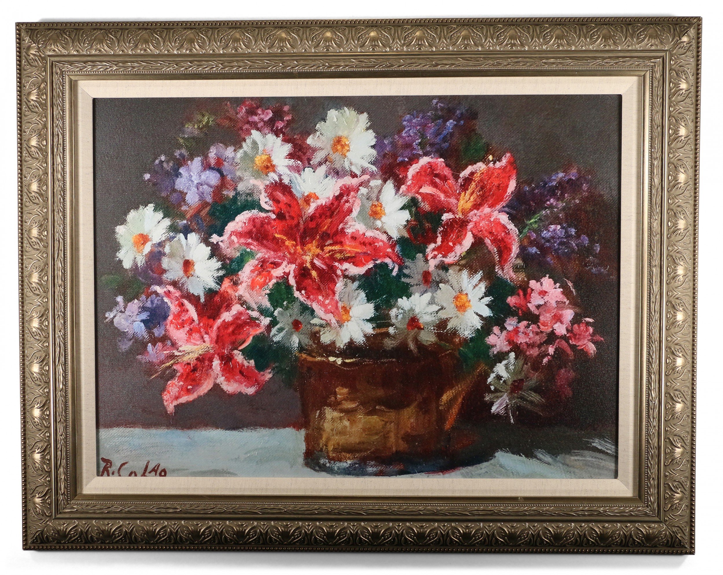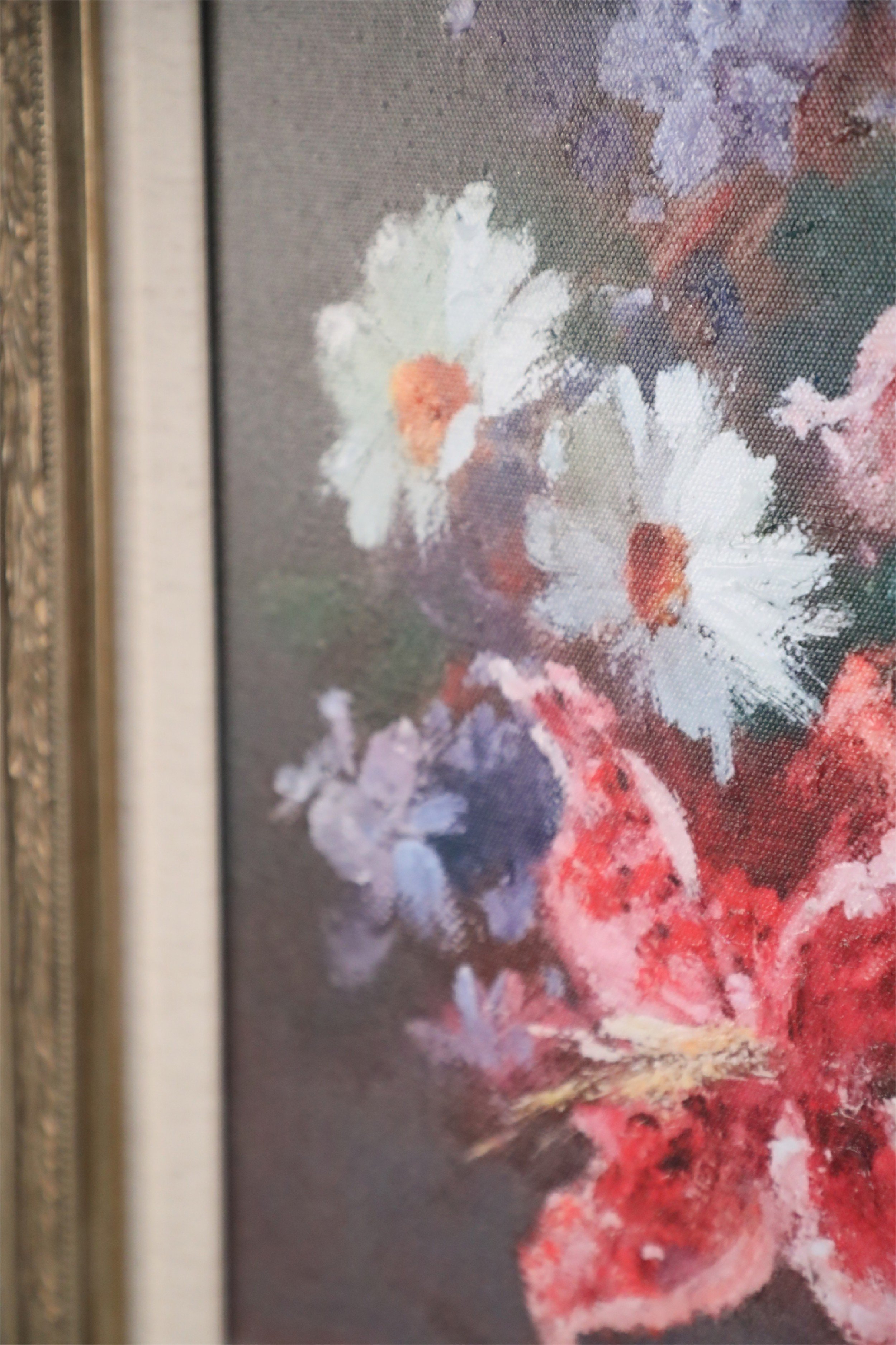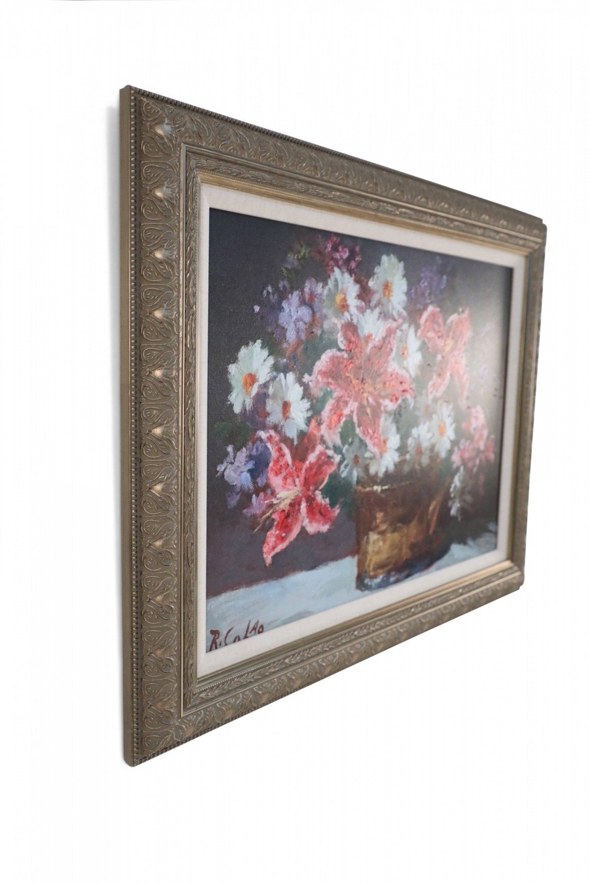 Contemporary canvas print of a still life painting depicting pink lilies and white daisies in a copper vase in a rectangular carved antique silver wooden frame with linen liner.