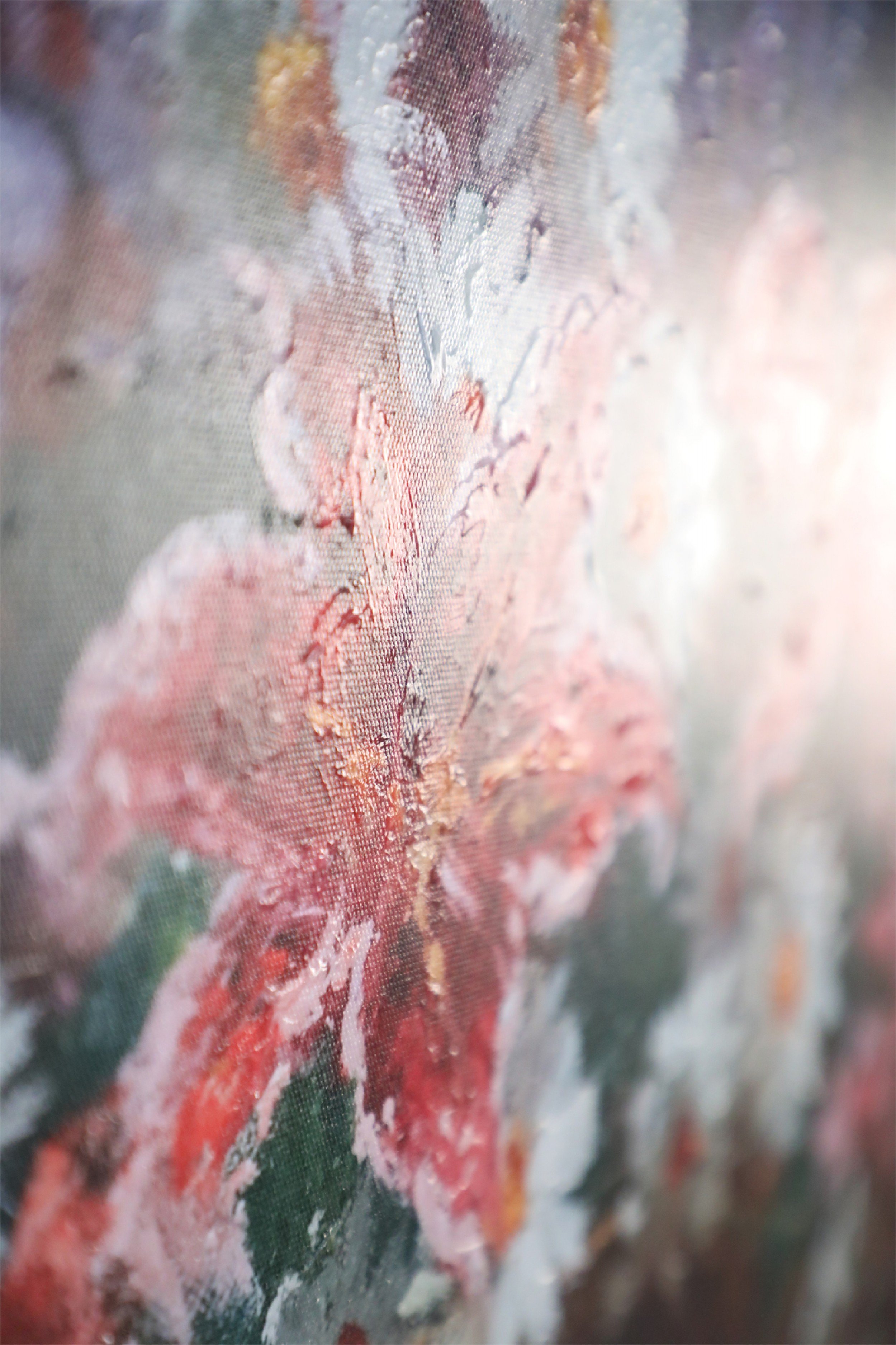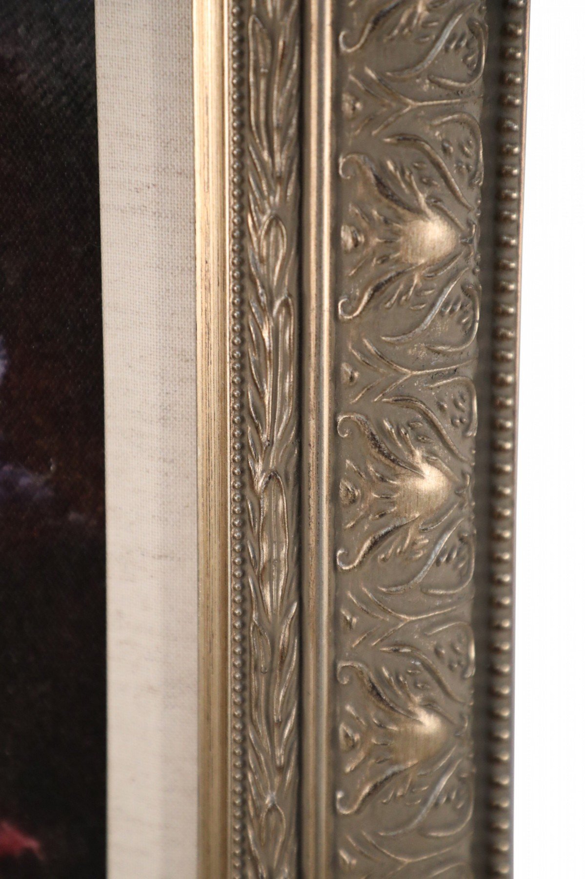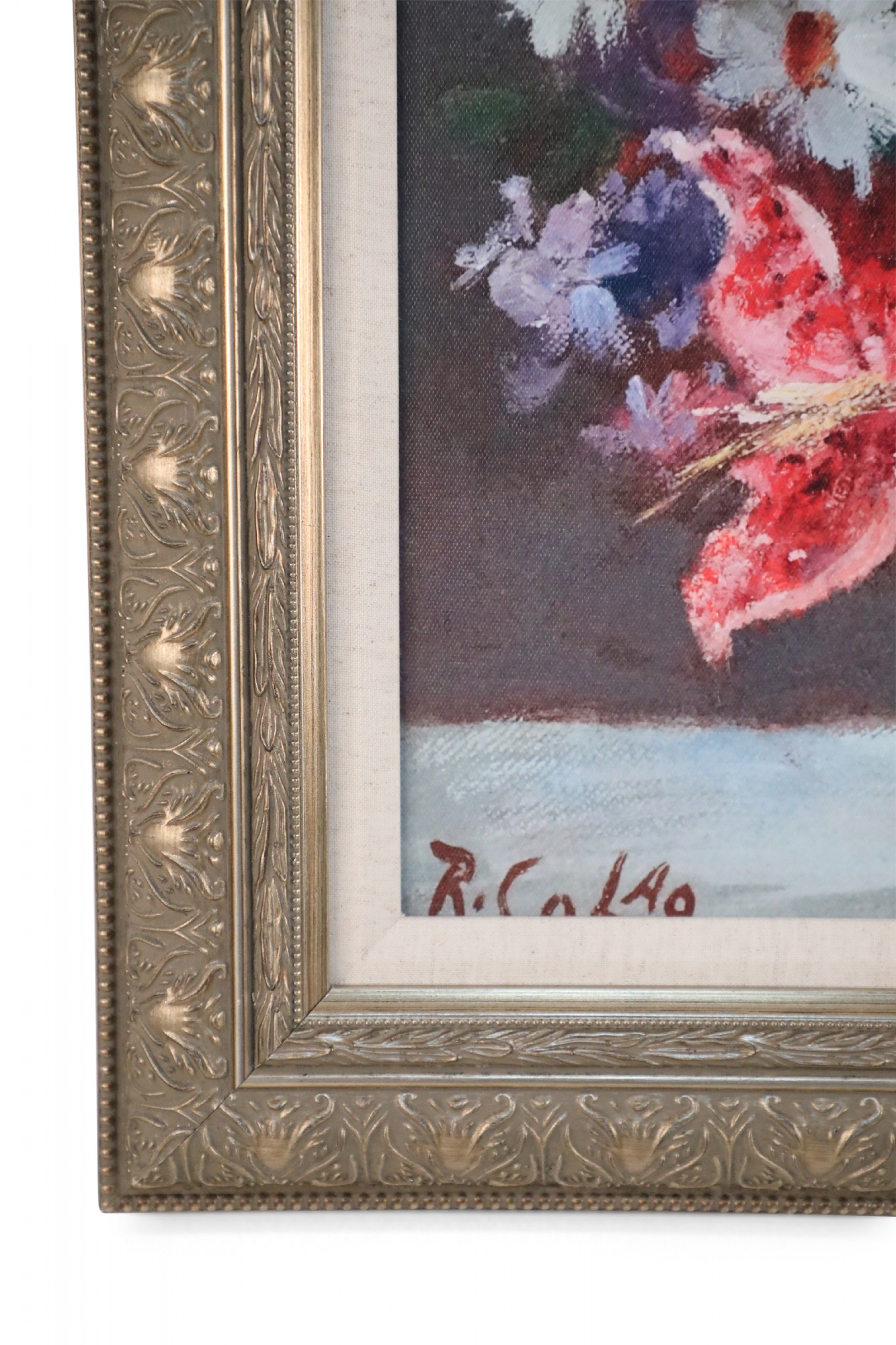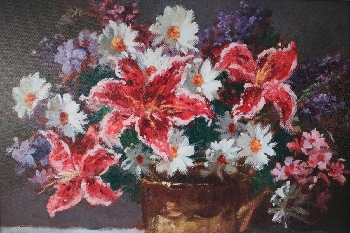 Contemporary canvas print of a still life painting depicting pink lilies and white daisies in a copper vase in a rectangular carved antique silver wooden frame with linen liner.