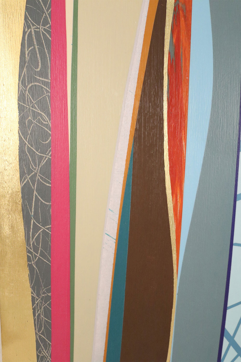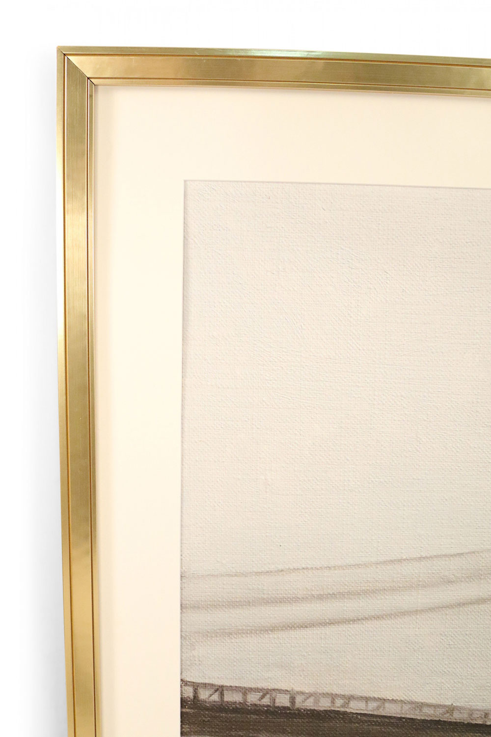 Contemporary watercolor painting of an urban bridge in fog in a gilt metal rectangular frame with a beige mat.