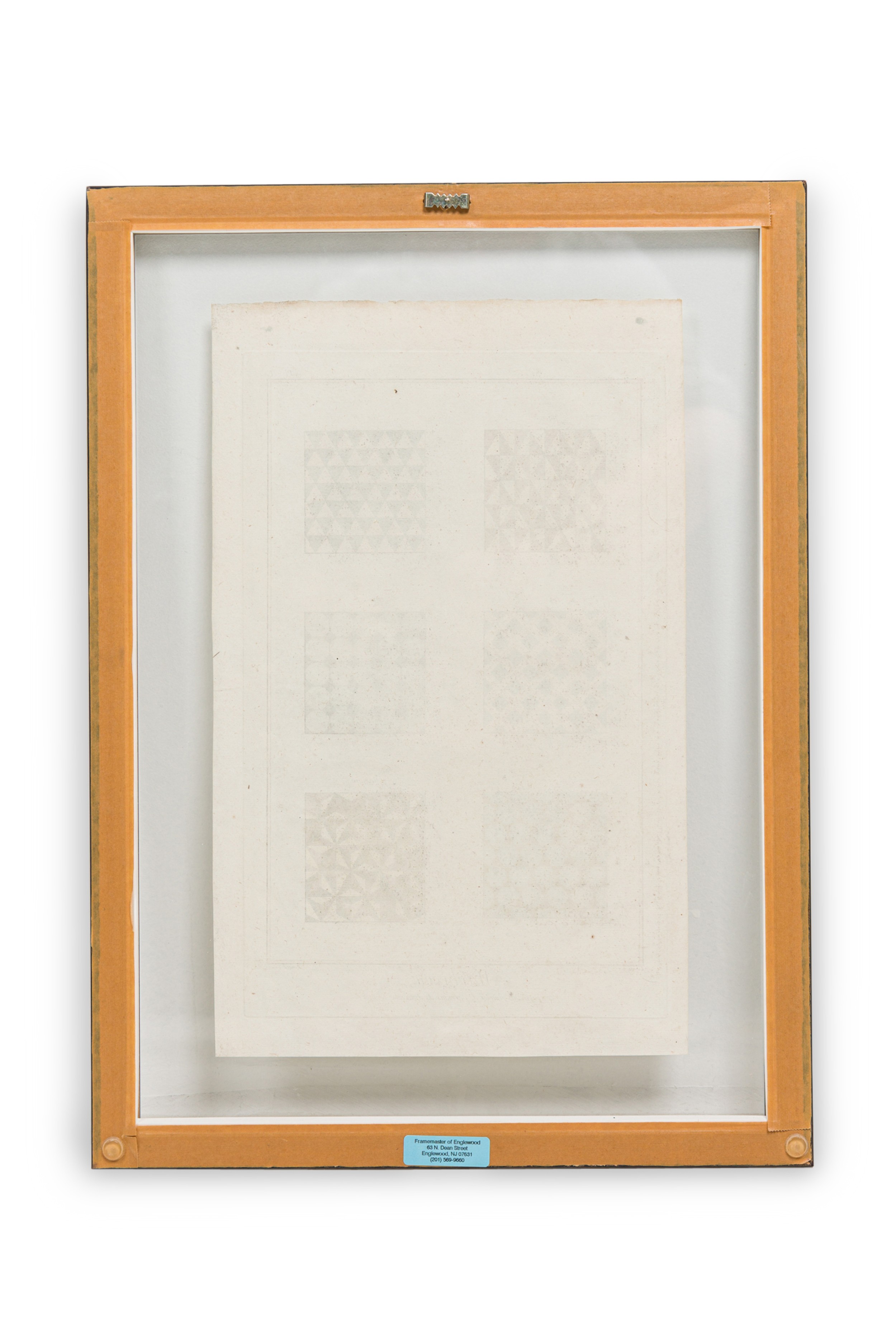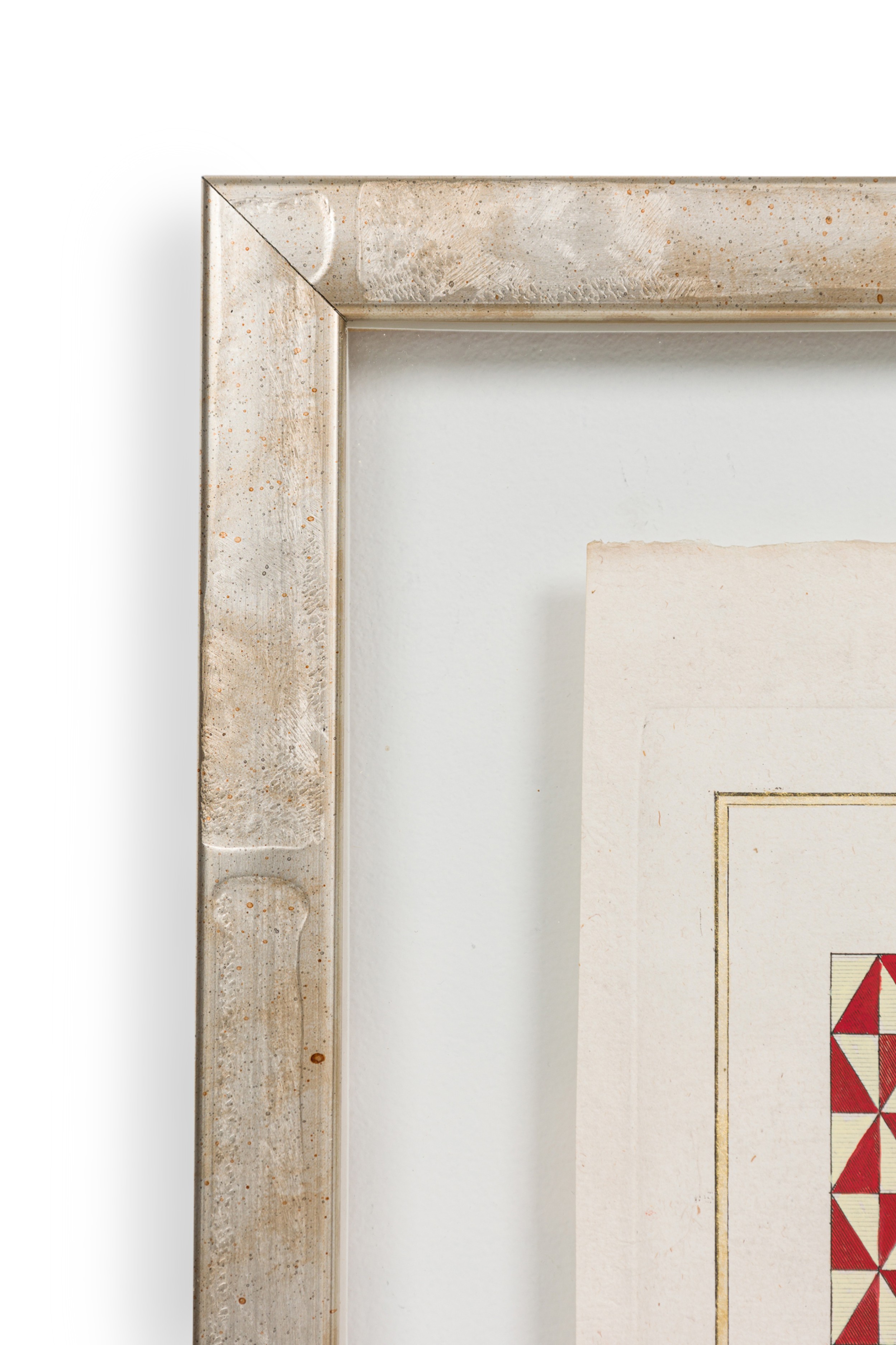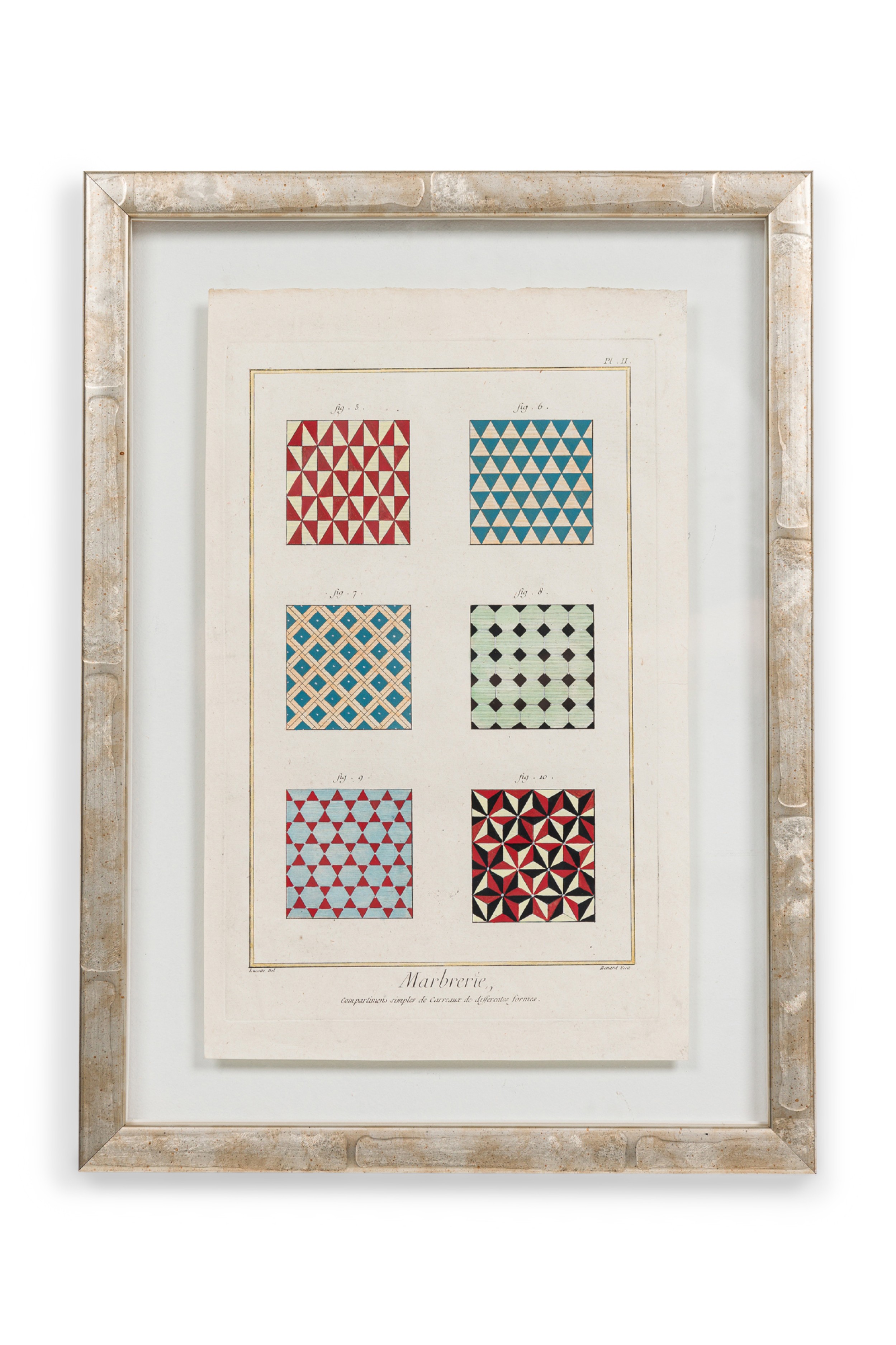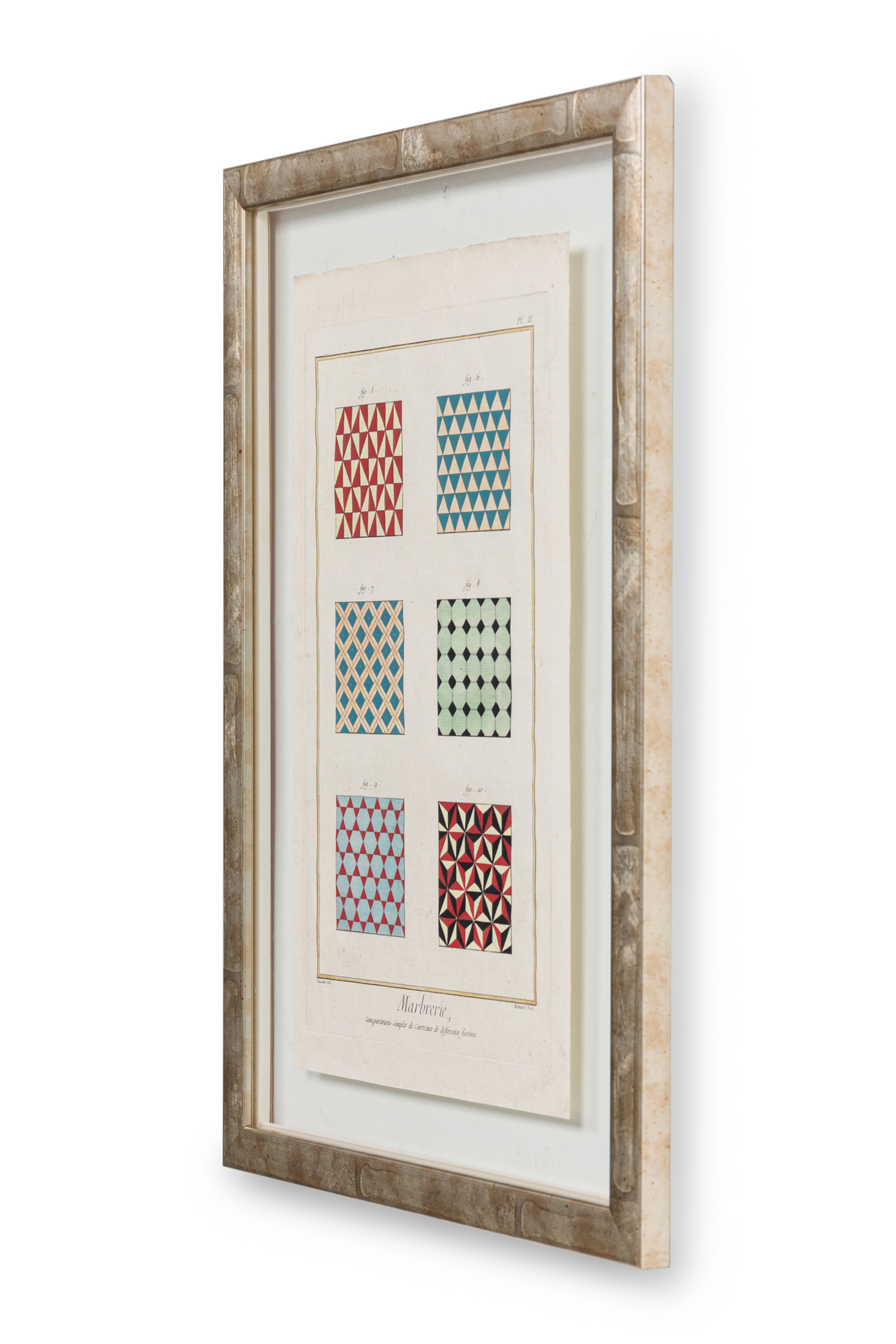 French Baroque style hand painted multicolored print of six figures of varying patterns for marble tiles in a silver frame (Matching prints available NWL6148A-F)
