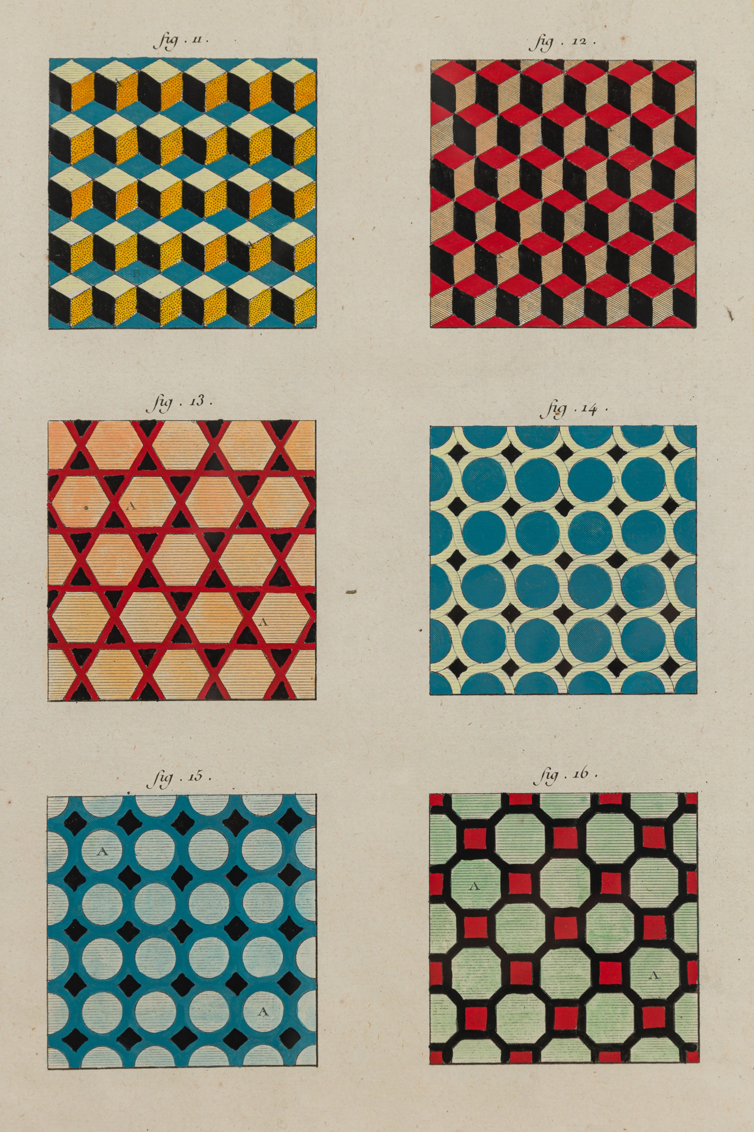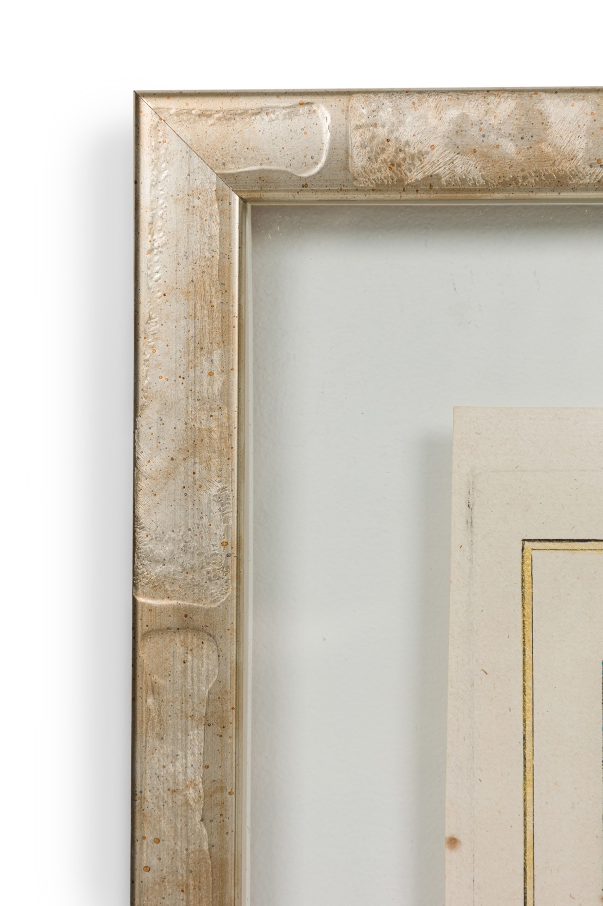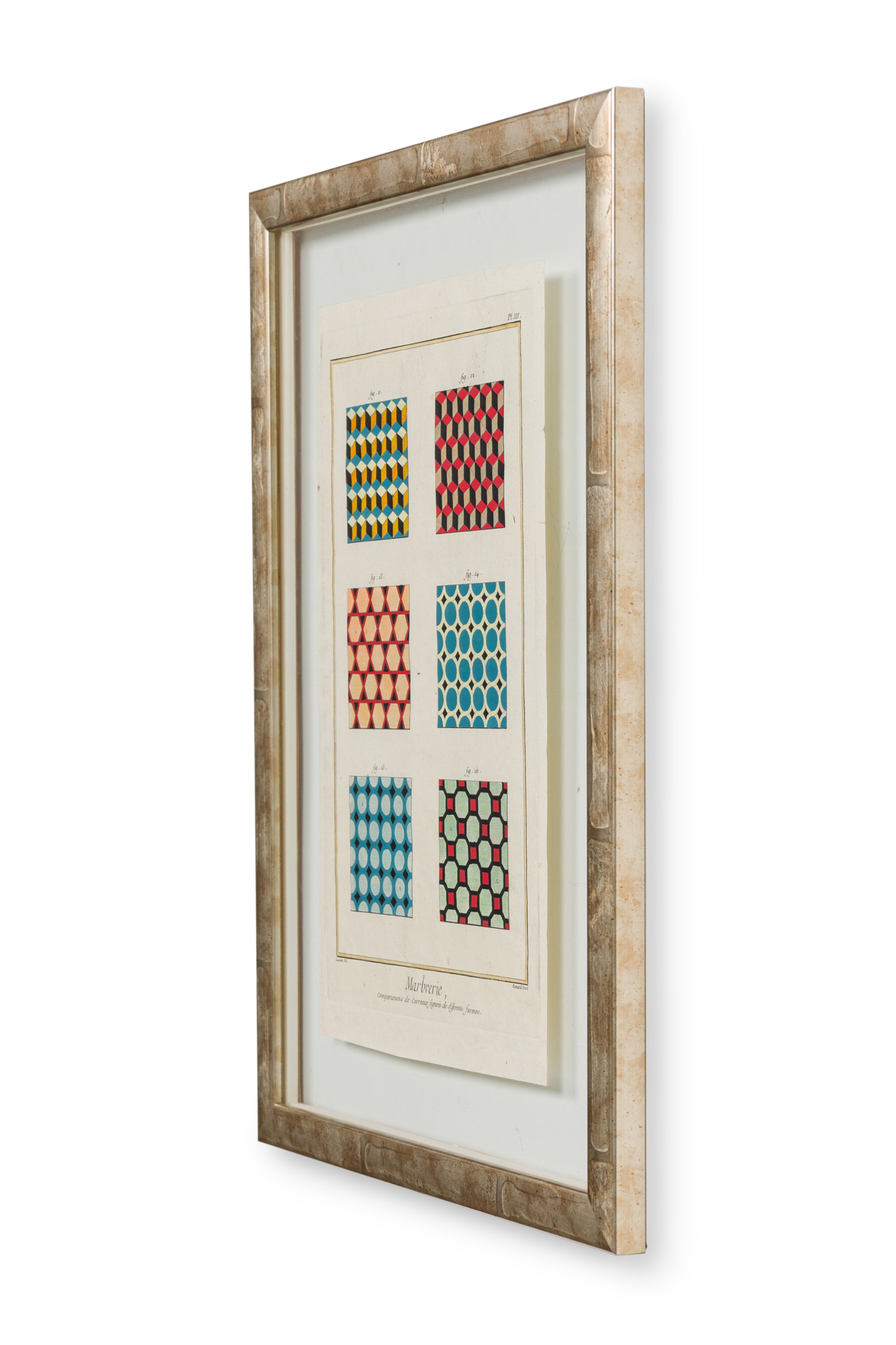 French Baroque style hand painted multicolored print of six figures of varying patterns for marble tiles in a silver frame (Matching prints available NWL6148A-F)