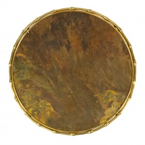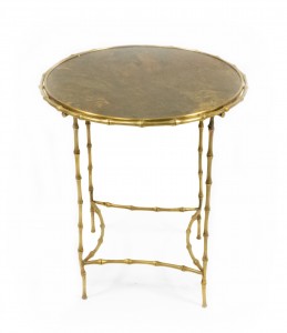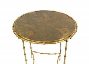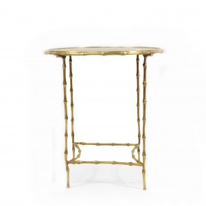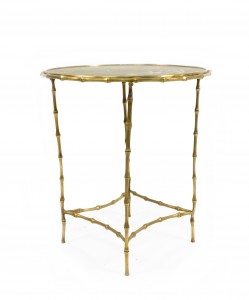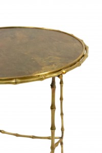French Mid-Century round brass end table with faux bamboo top rim and legs connected with a stretcher (MAISON BAGUES)