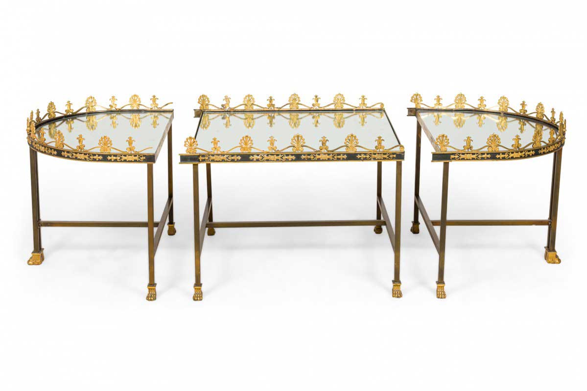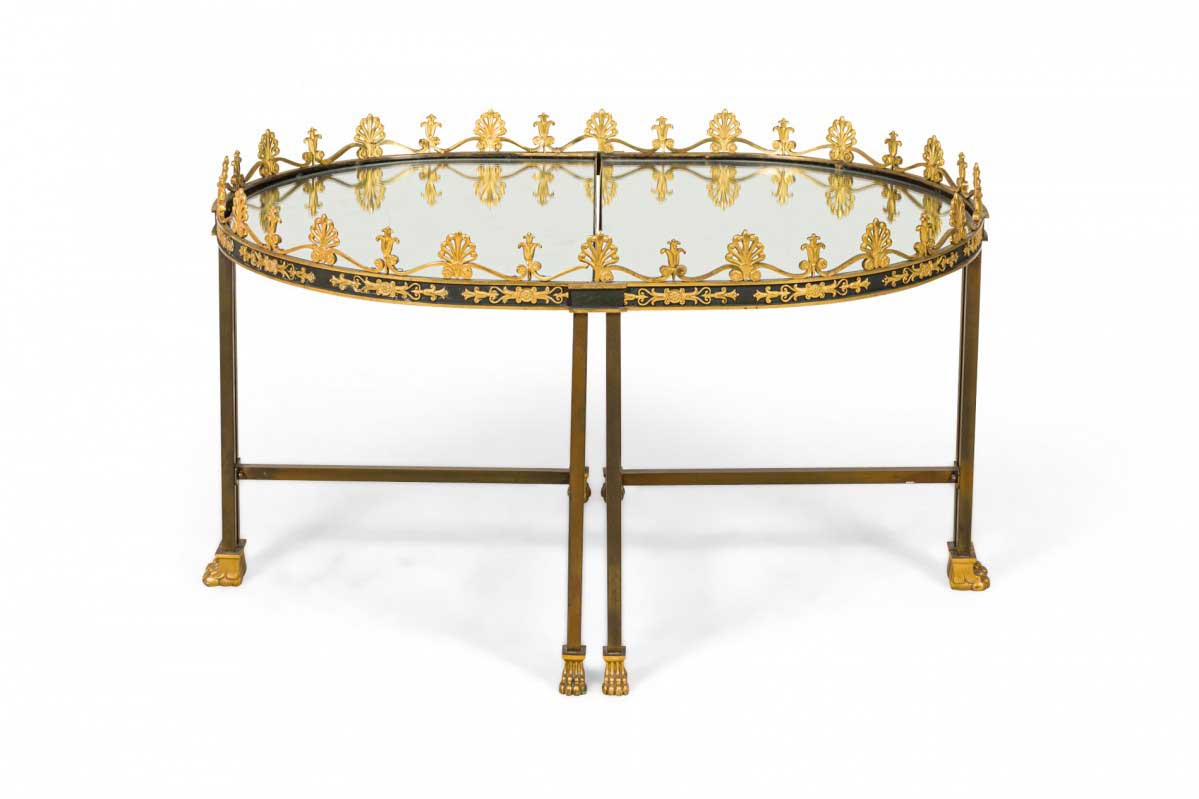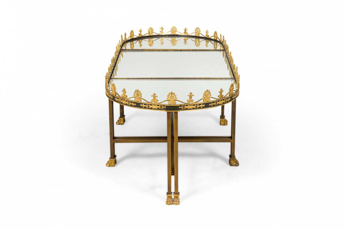 French Empire style (19/20th Century) three-piece coffee table (Surtout De Plateau) with a mirrored surface supported on a bronze base with a stretcher having gilt bronze trim and gallery.