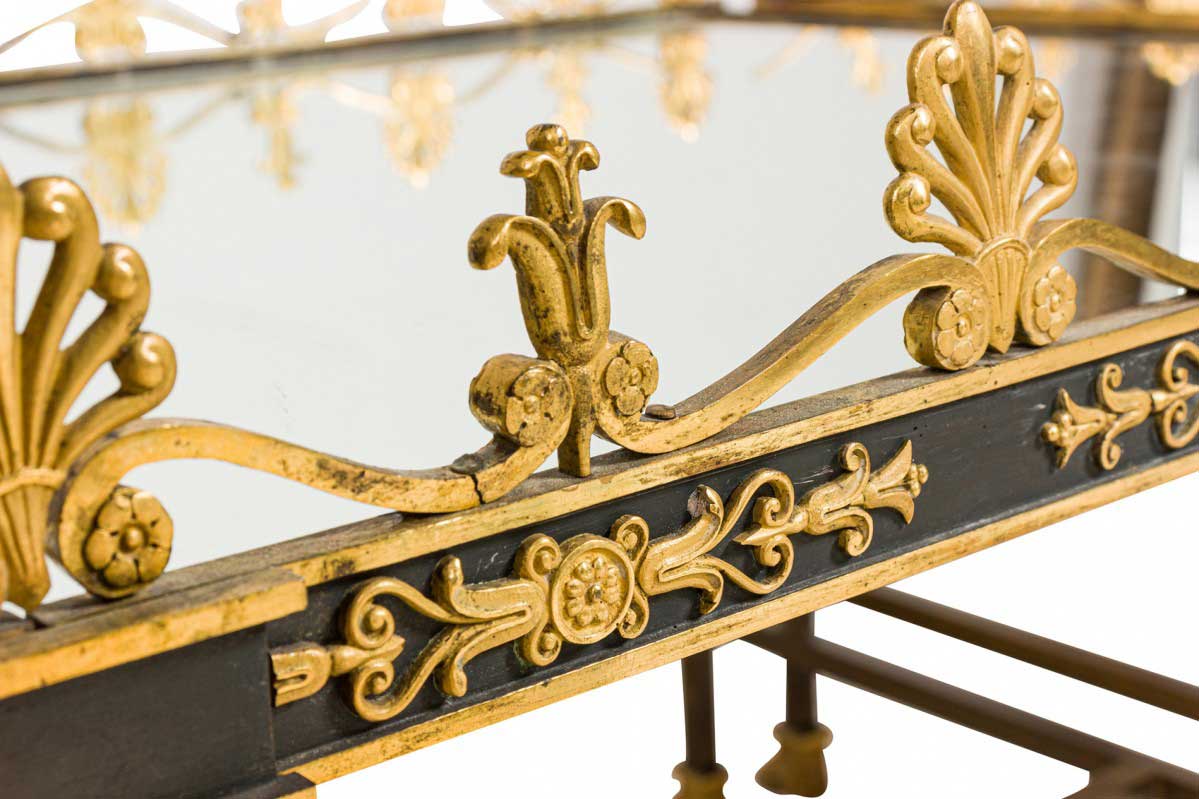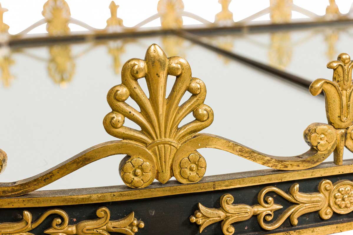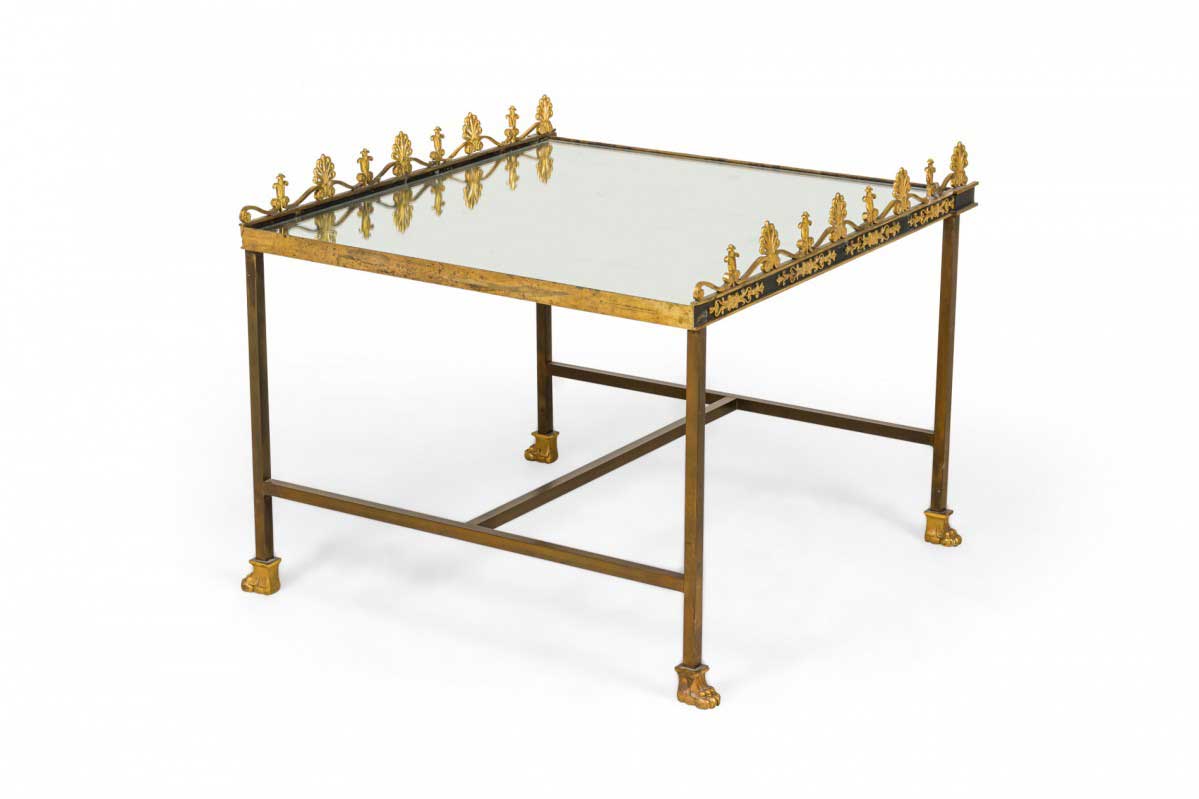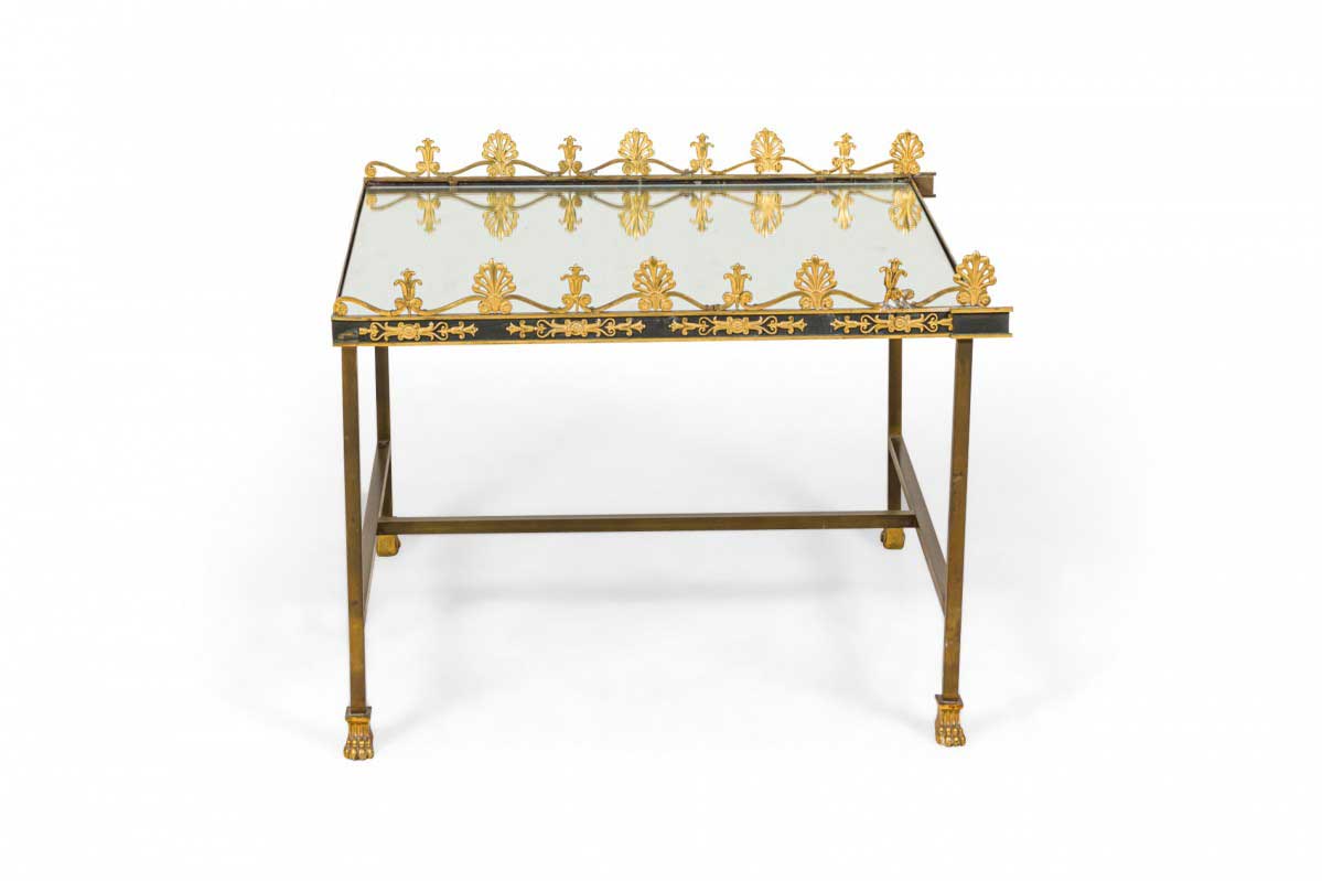French Empire style (19/20th Century) three-piece coffee table (Surtout De Plateau) with a mirrored surface supported on a bronze base with a stretcher having gilt bronze trim and gallery.