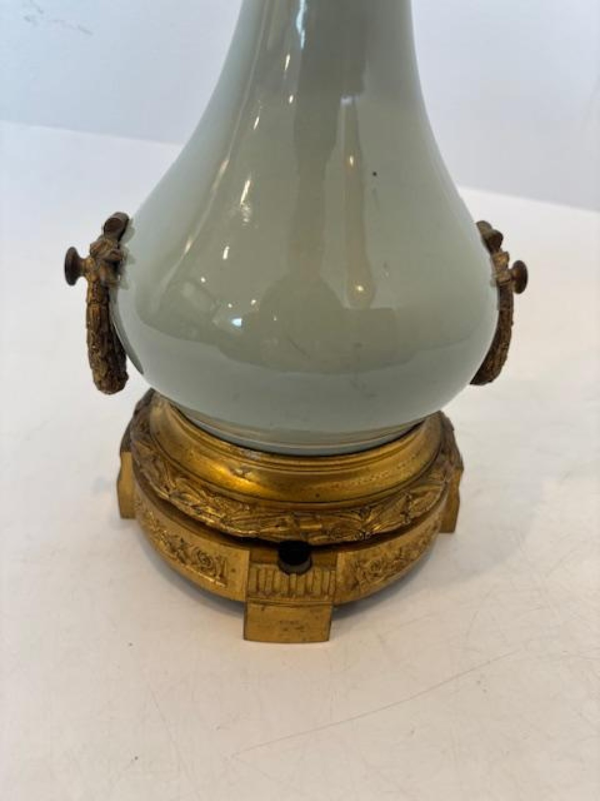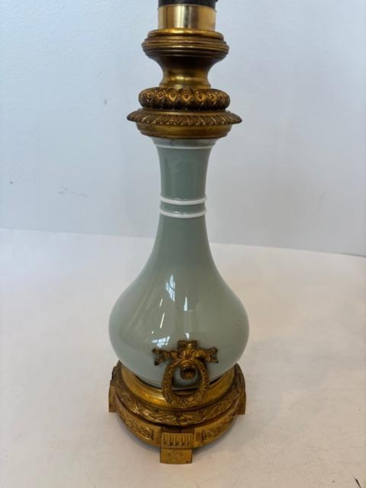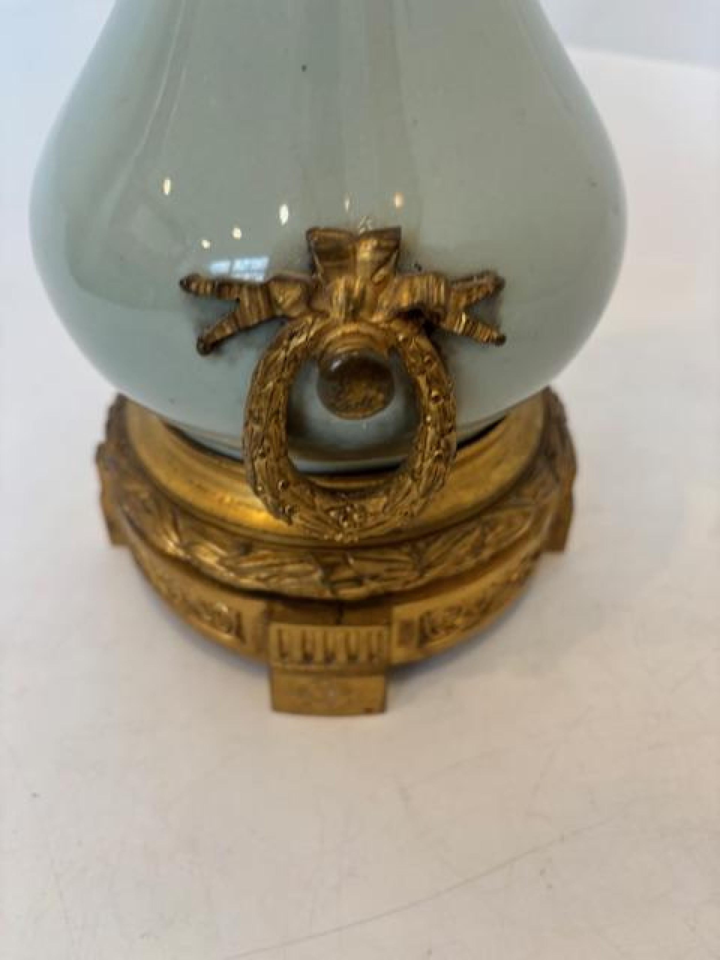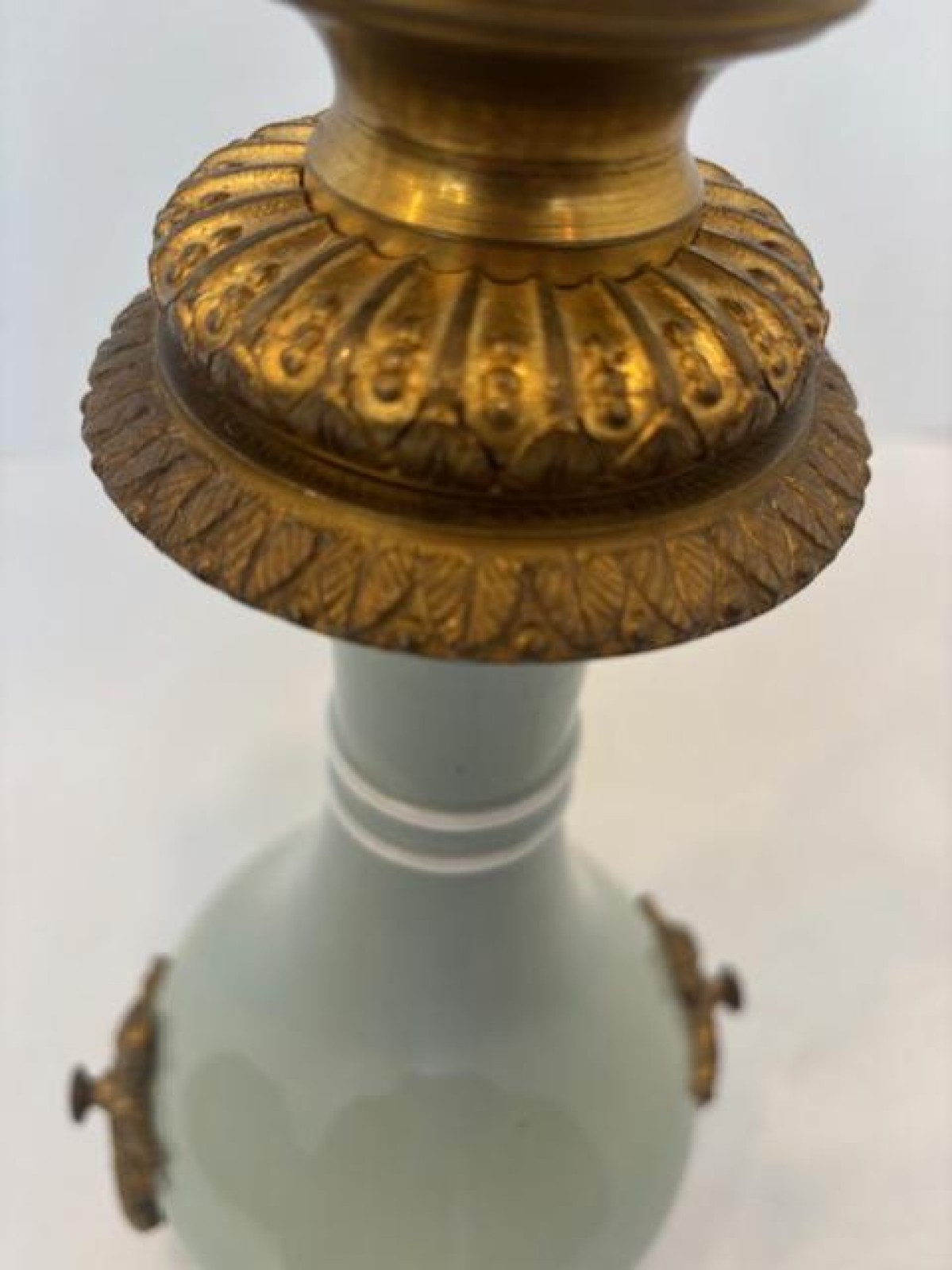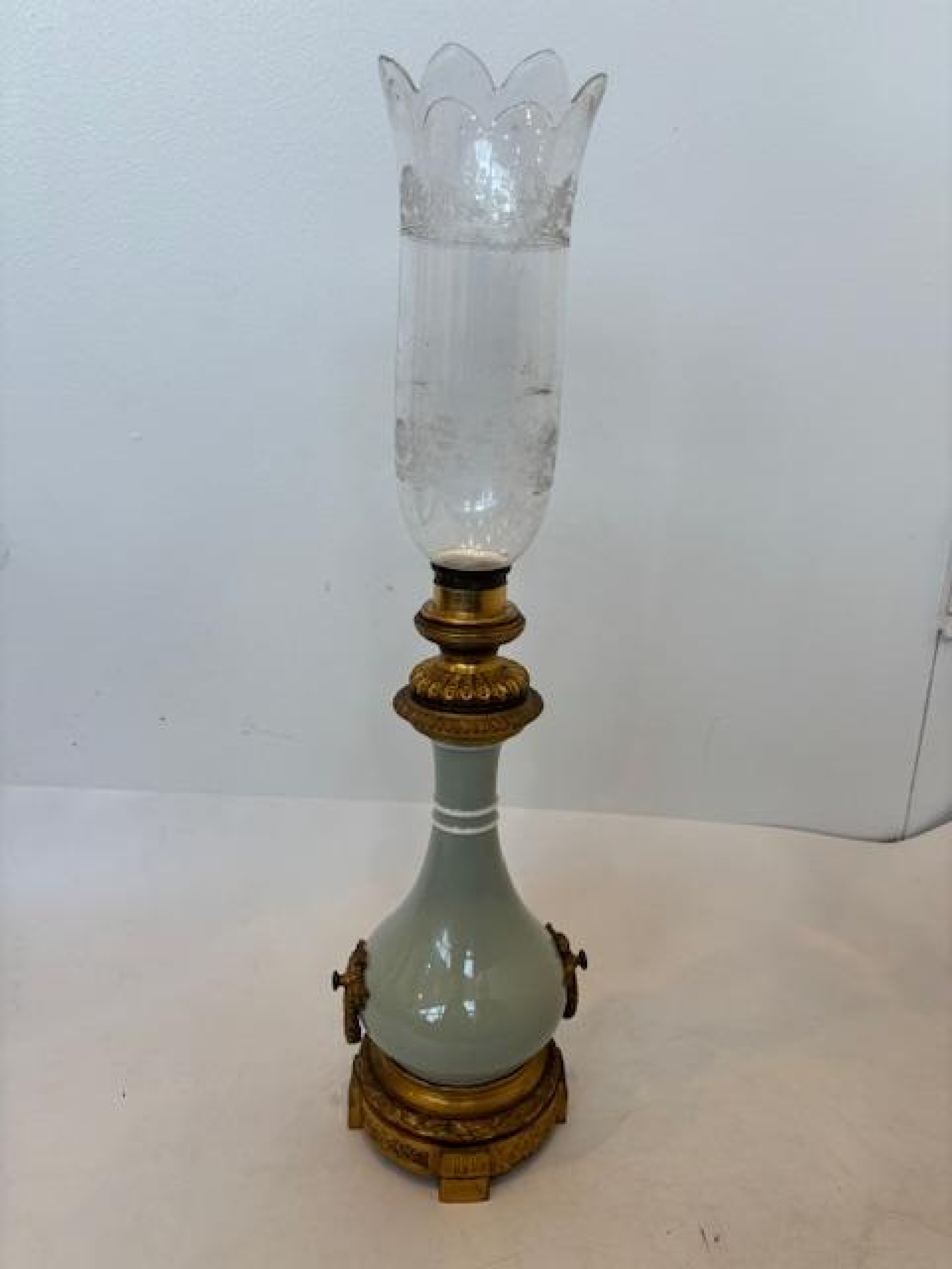 French Victorian celadon porcelain oil lamp with gilt metal mounts supporting a frosted glass fount over an etched glass bowl and centered hurricane shade