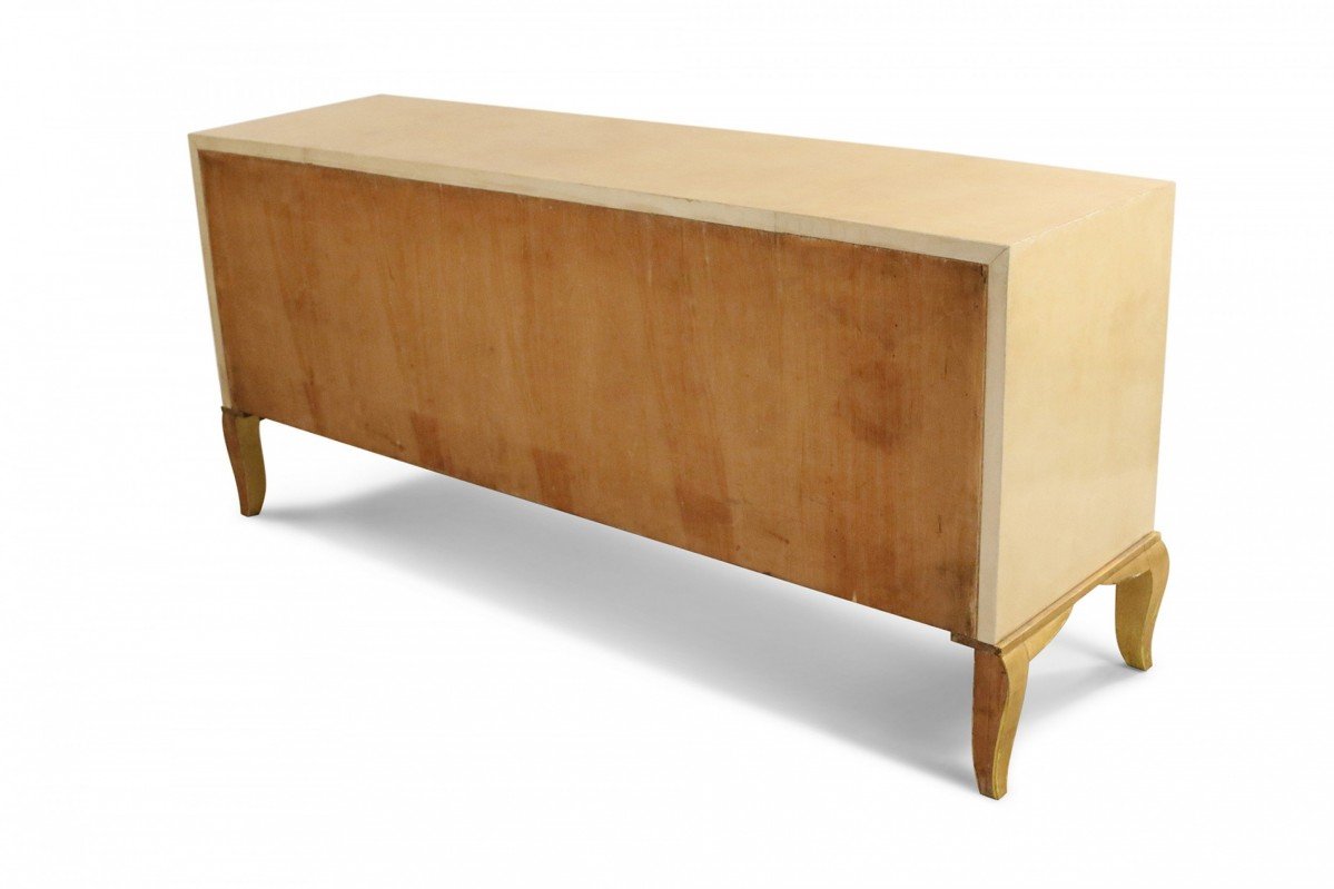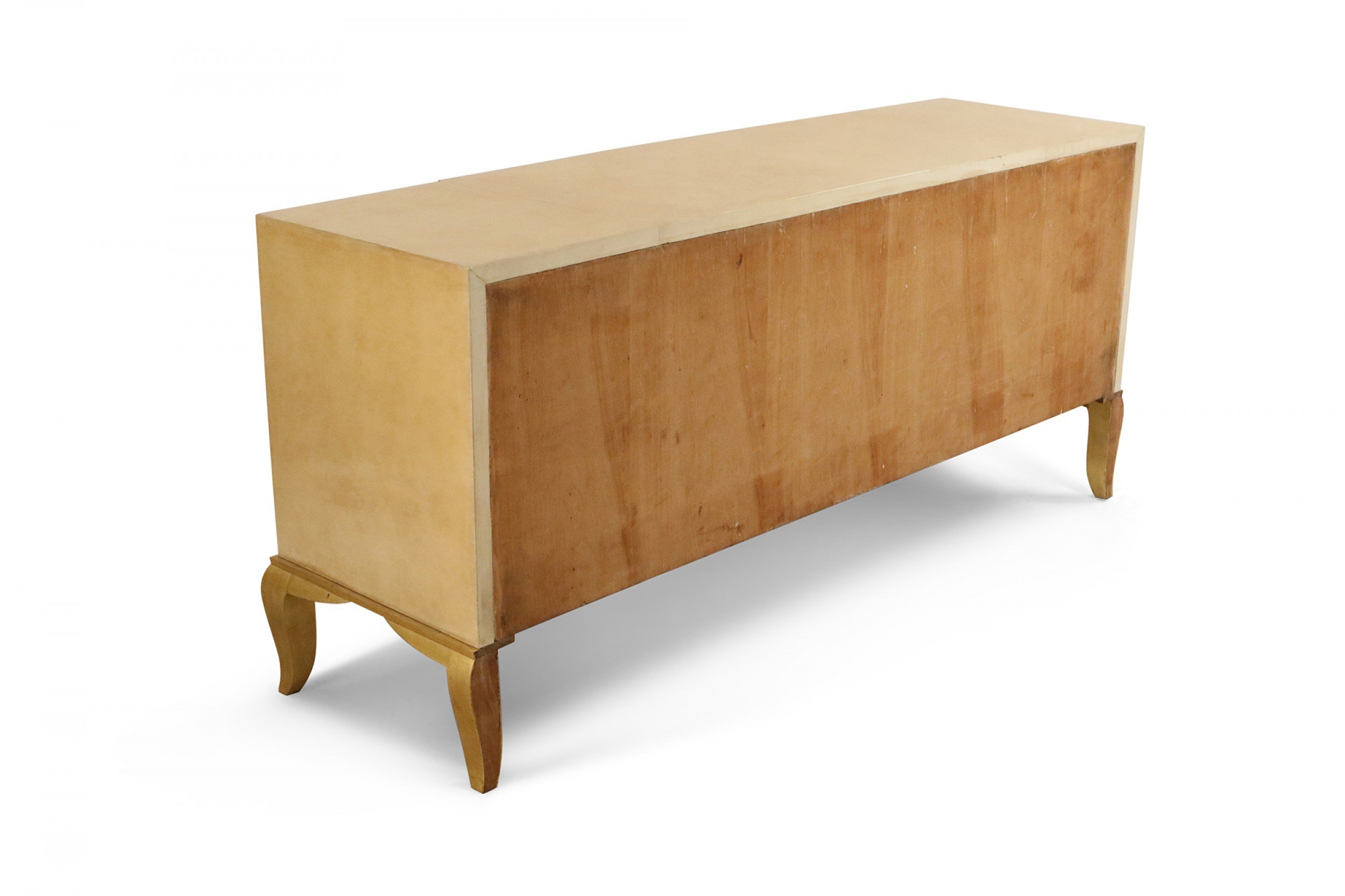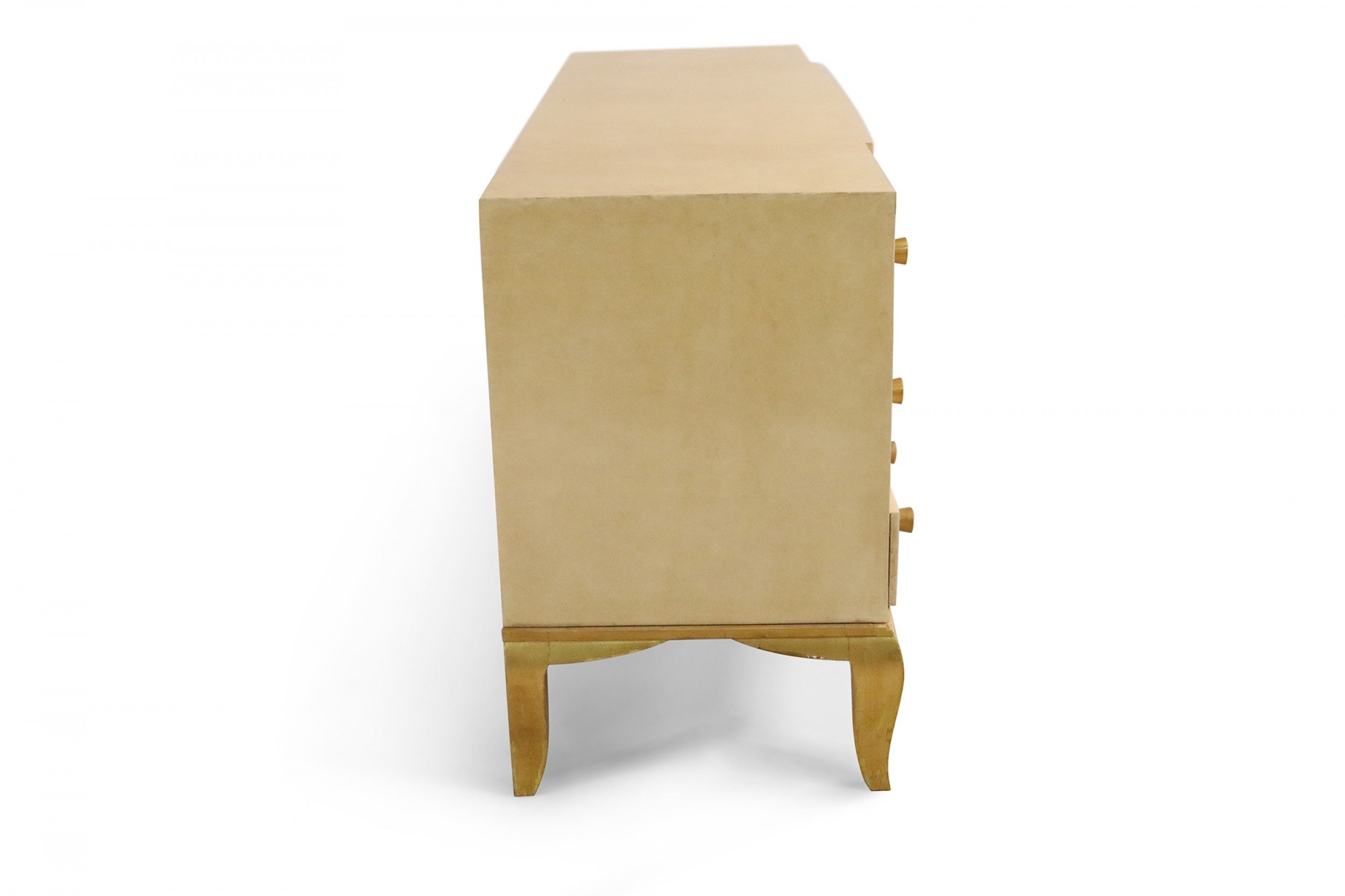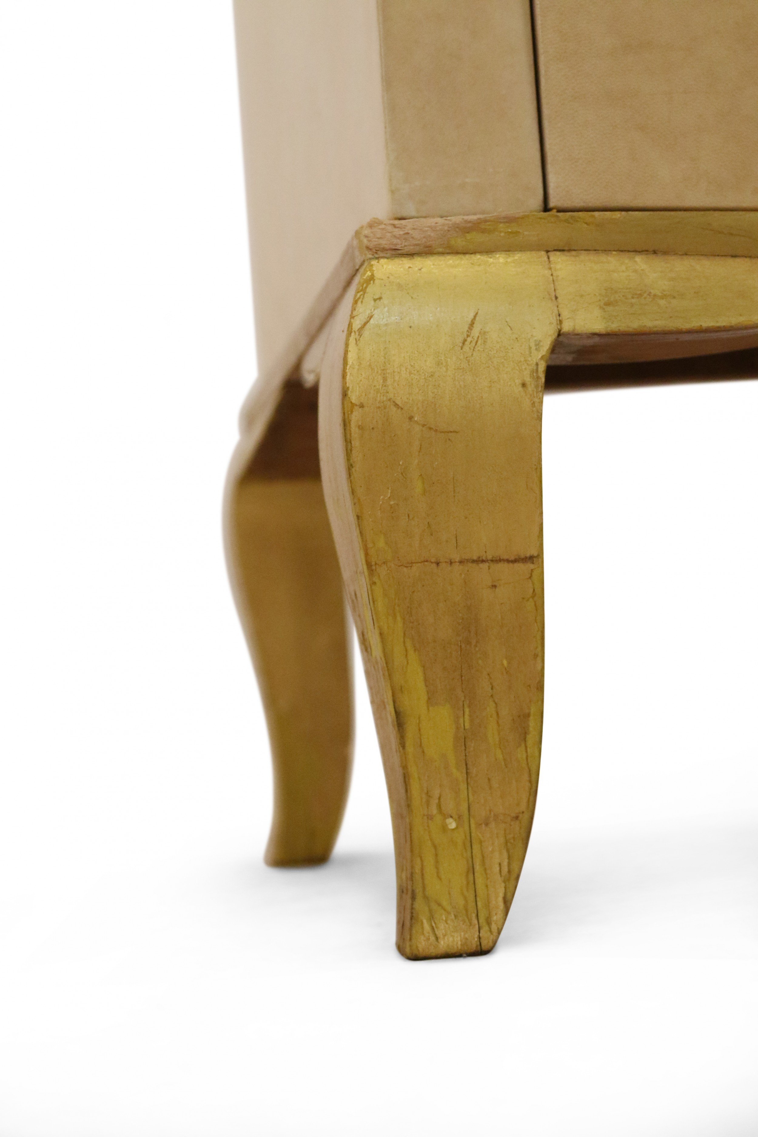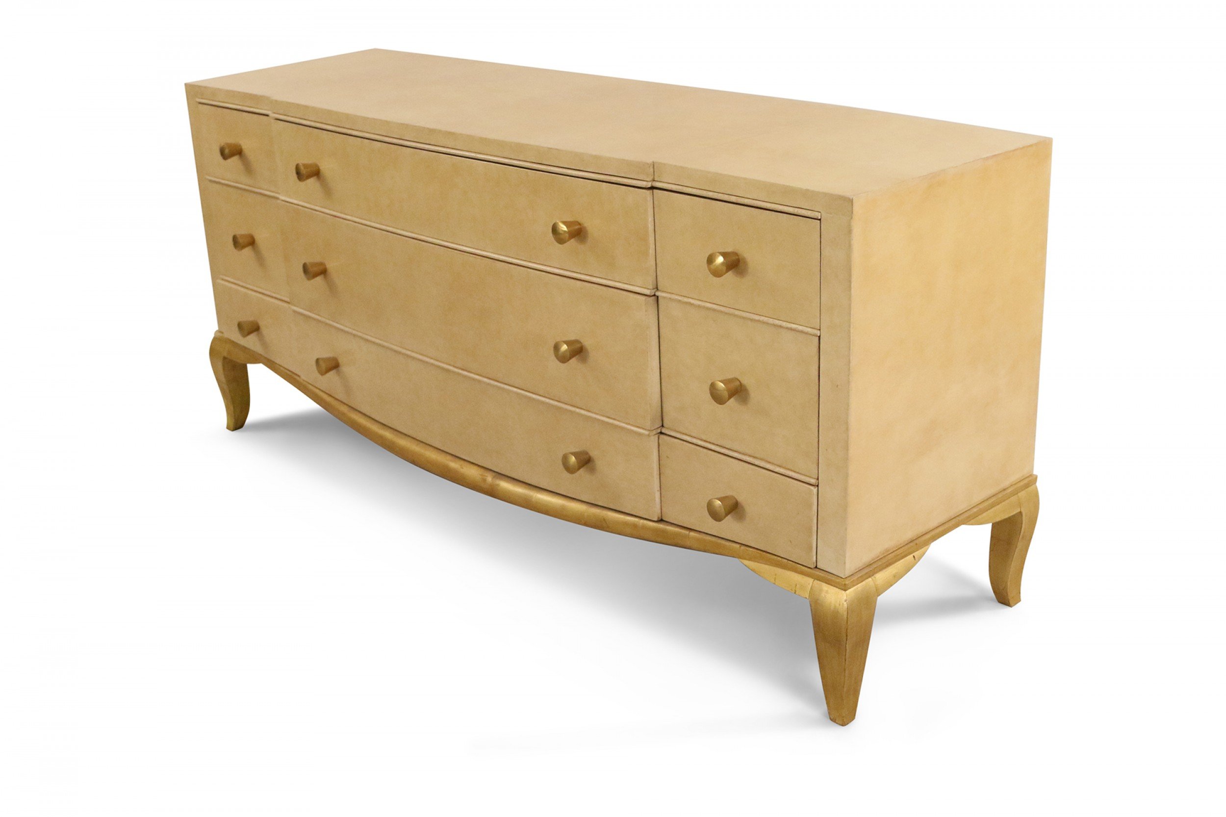 French Mid-Century parchment veneer chest of drawers with three wide central drawers and three smaller drawers on each side having oval brass drawer pulls on cabriole giltwood legs