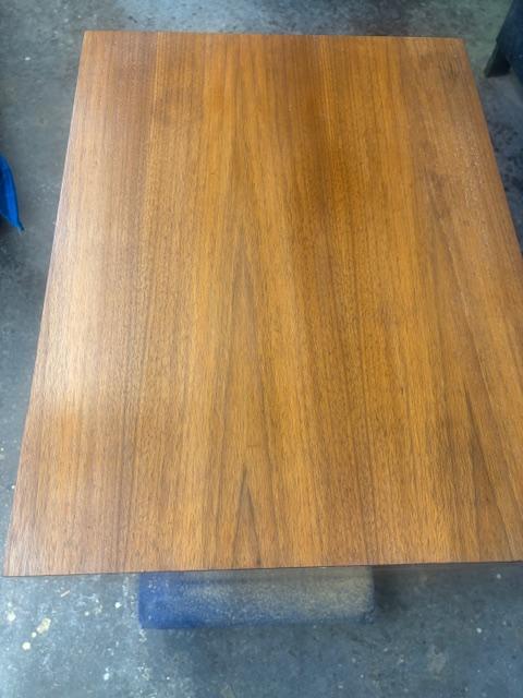 American Mid-Century 4-drawer walnut veneer bedside table / commode with M-shaped silver metal handles, resting on four square wooden legs. (Similar piece: DUF0317B)