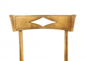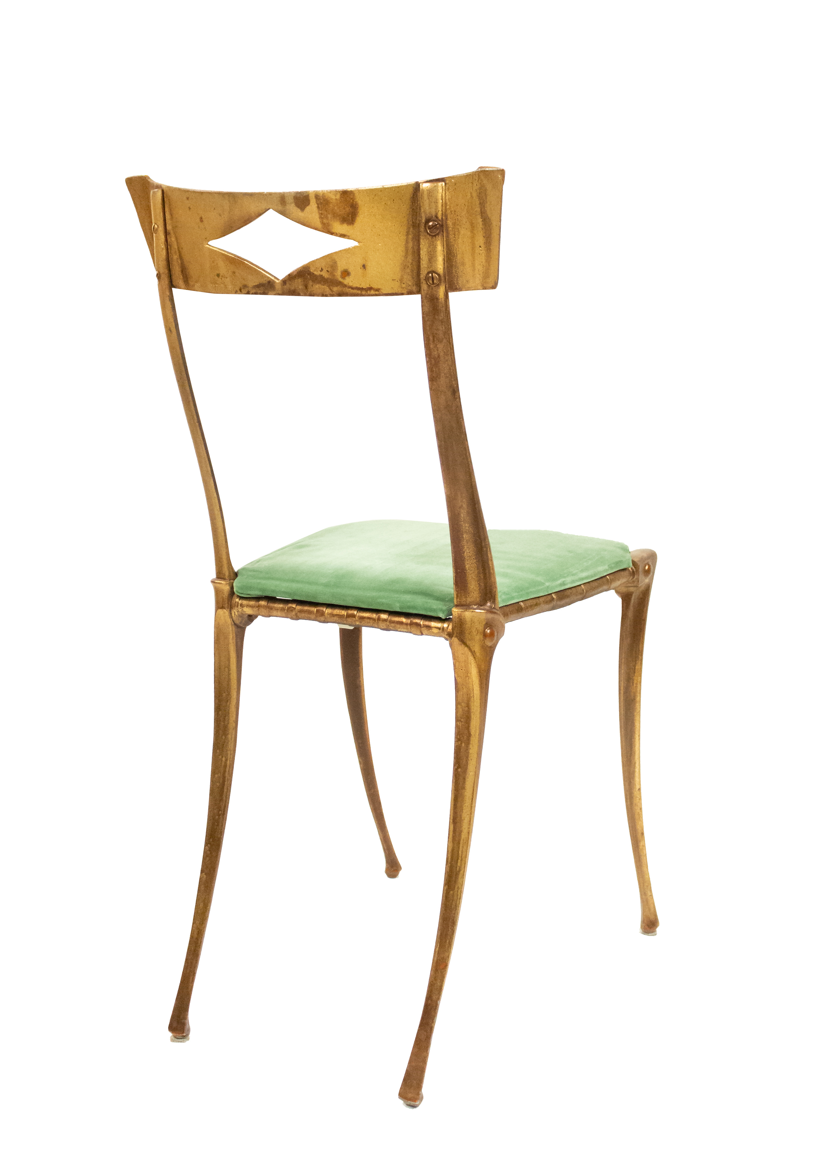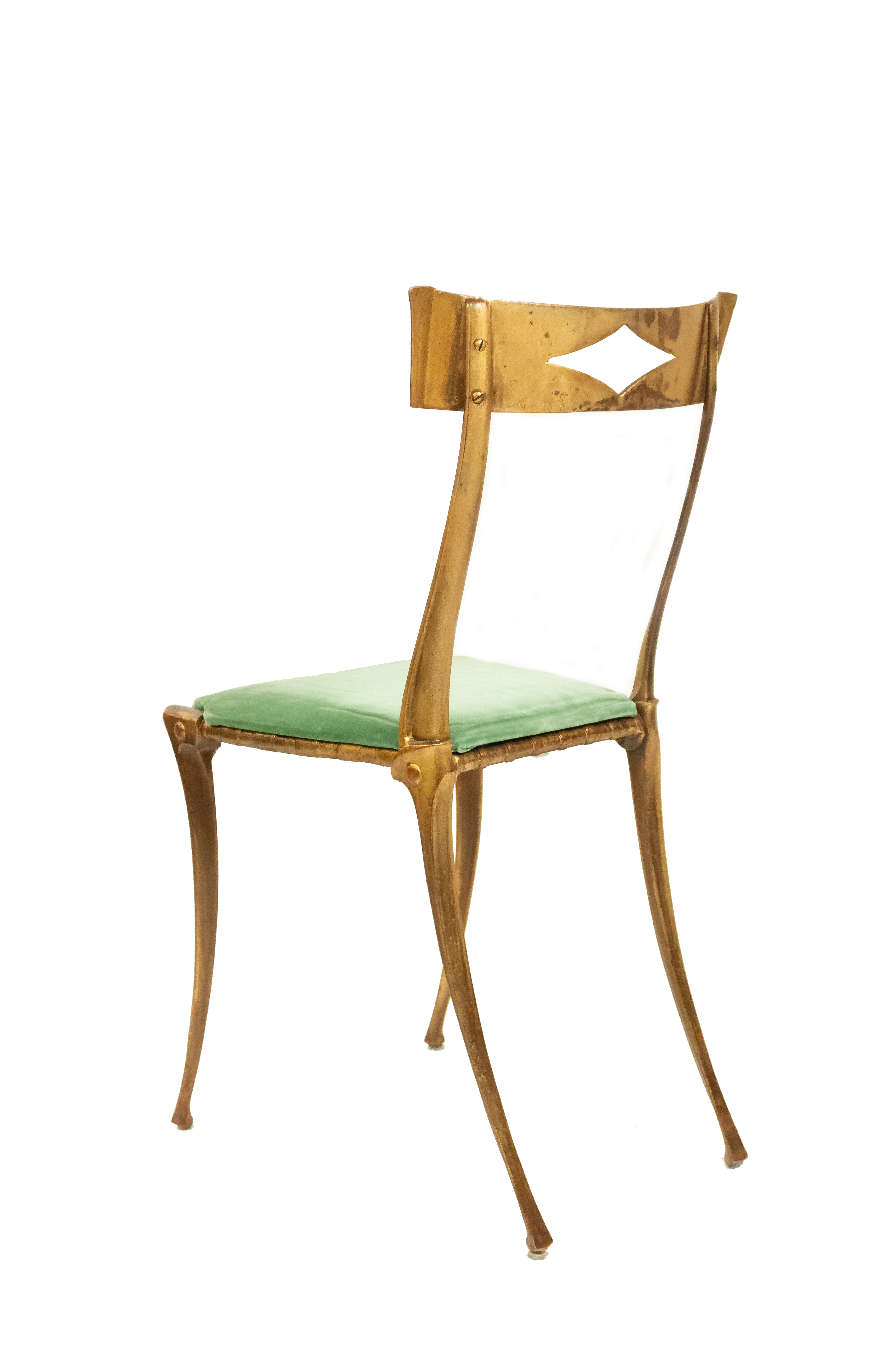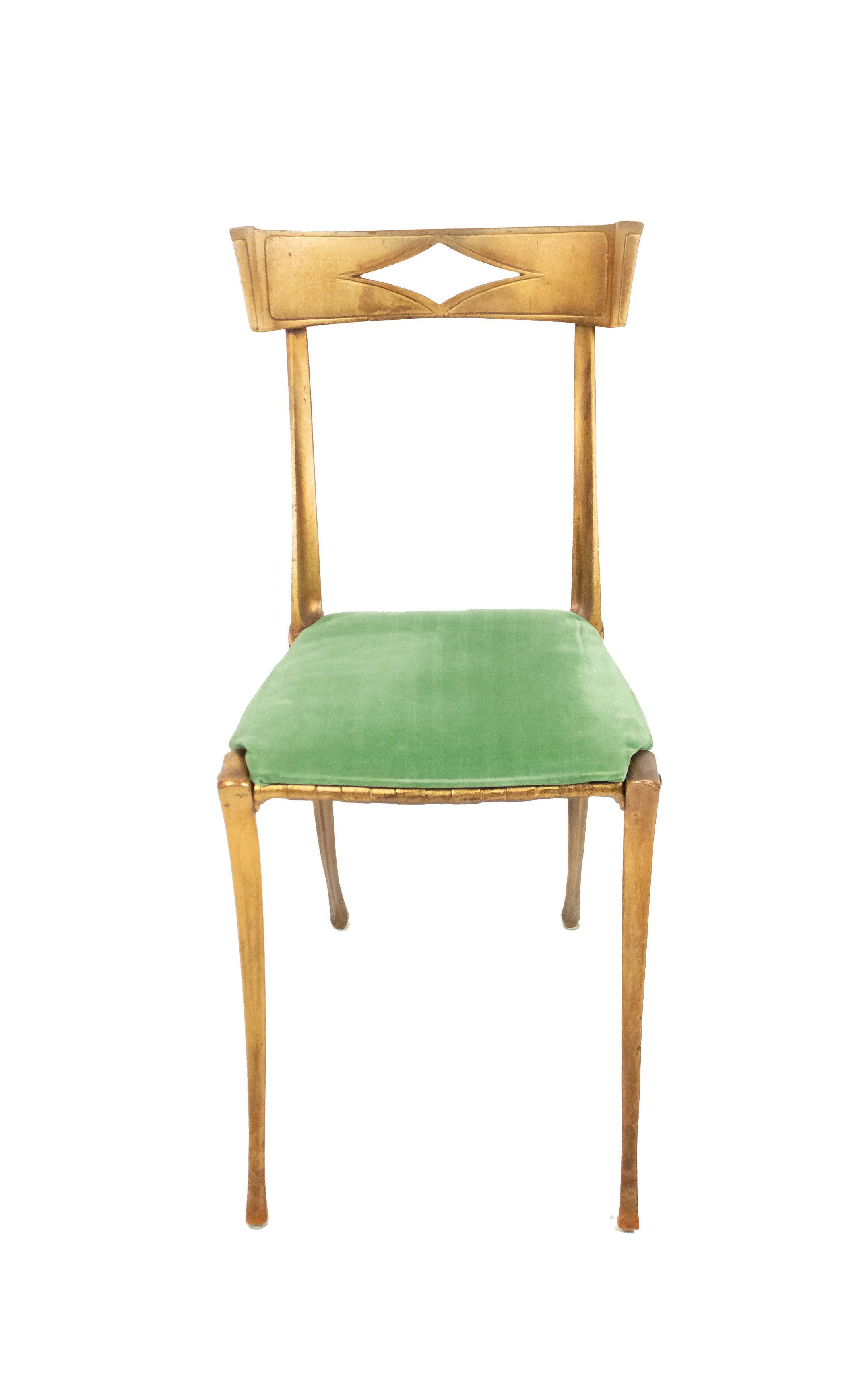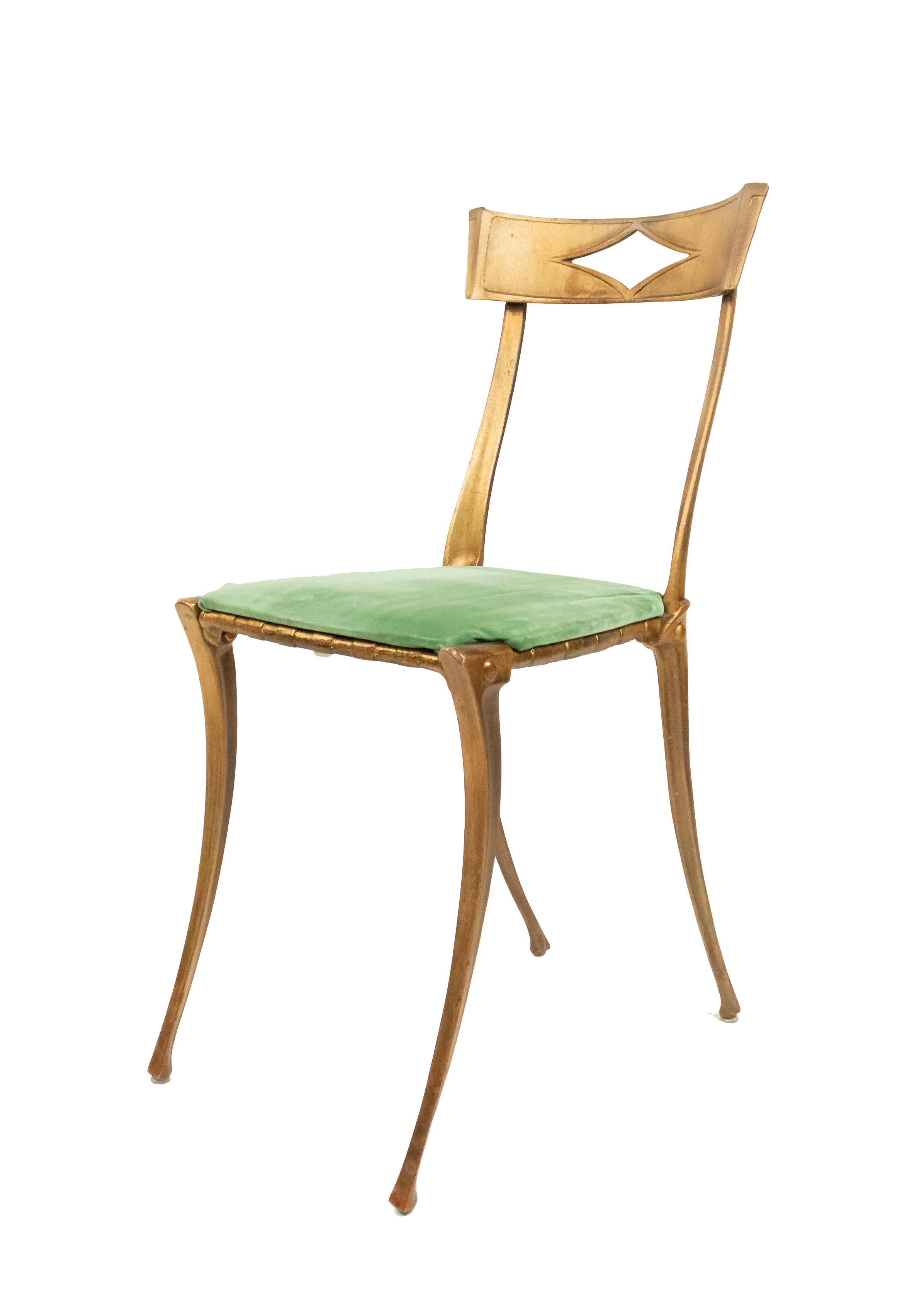 Mid-century gilt metal side chair with green velvet upholstered seat and diamond-shaped cut out in back rest