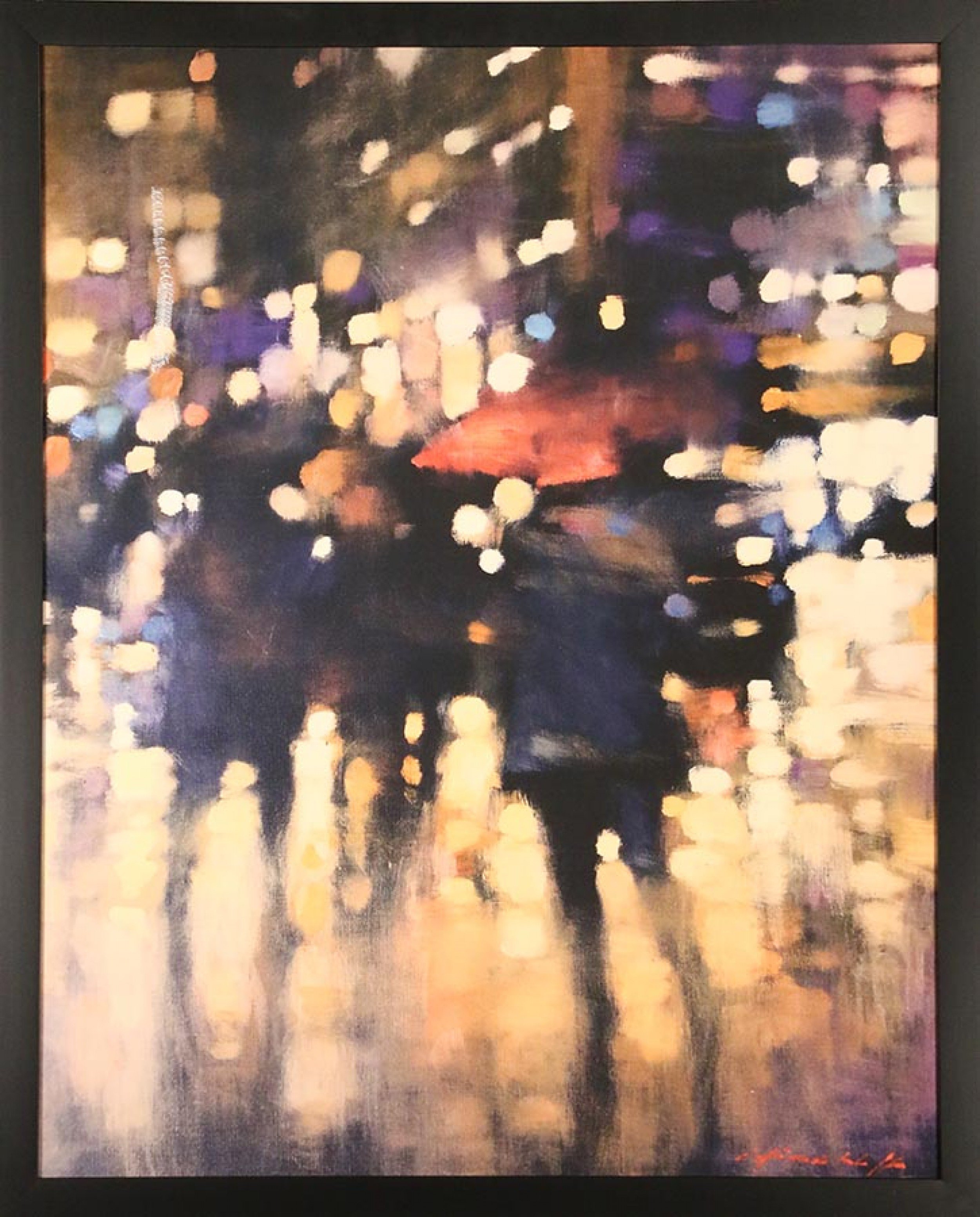 Contemporary canvas print of a blurred impressionist style rainy street scene painting with people holding umbrellas in a rectangular black wood frame.