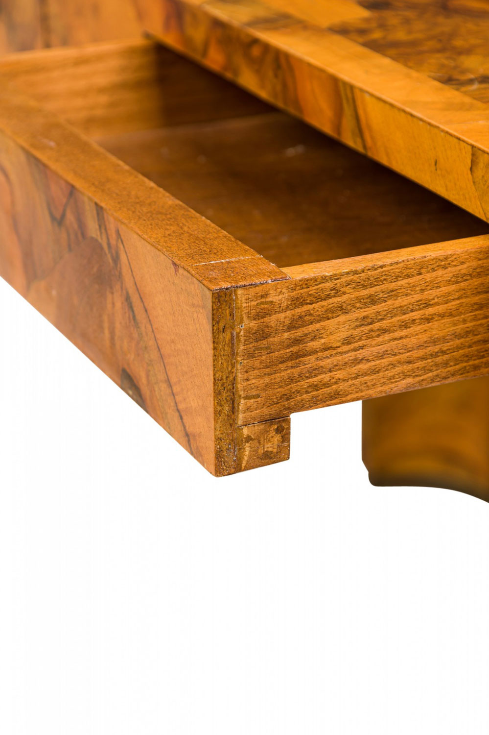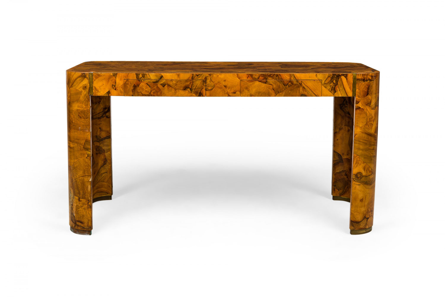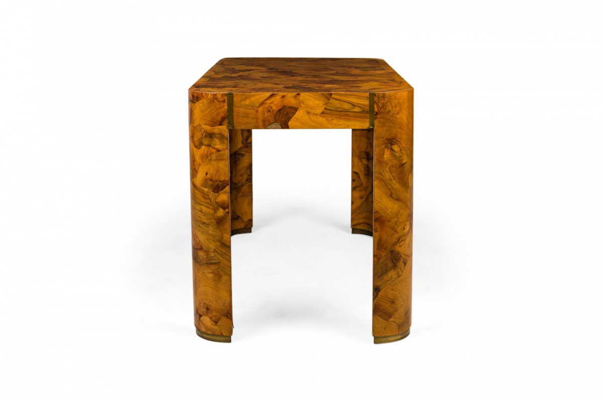 Italian Mid-Century "Radius" writing desk with a rectangular top with rounded edges and two drawers, finished in oyster burl veneer and resting on four rounded triangular legs.