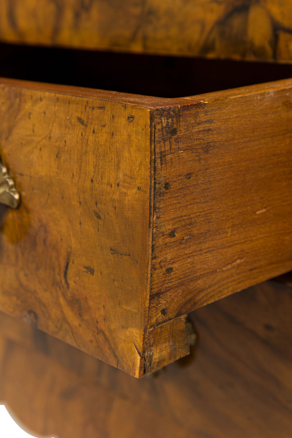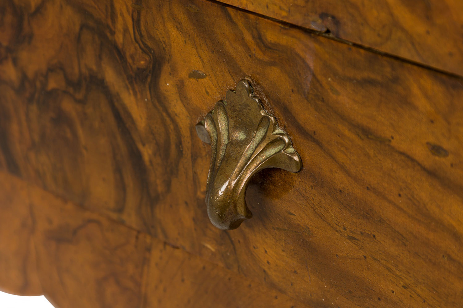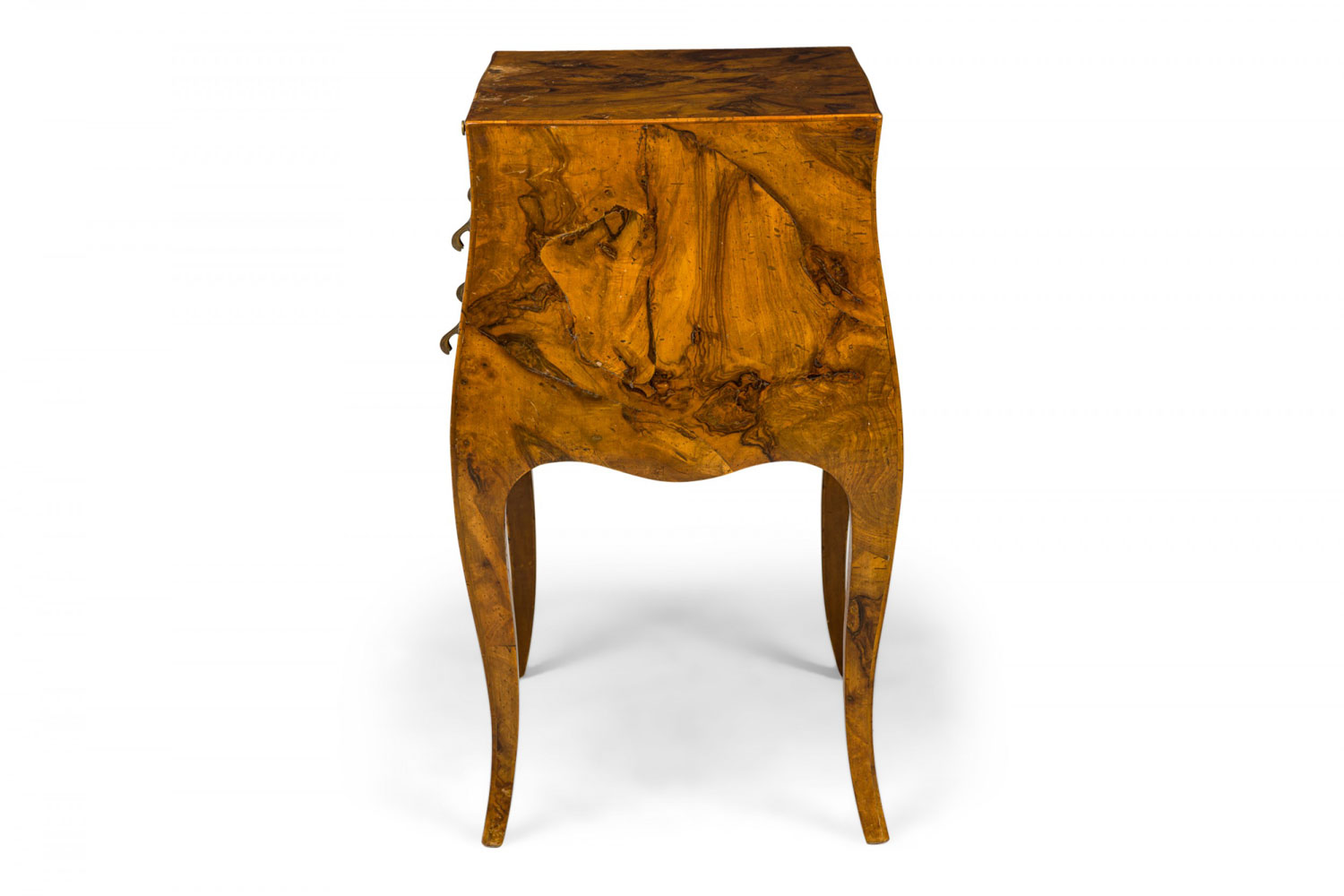 Italian Mid-Century small chest or side / end table with oyster burl veneer and two drawers with bronze drawer pulls, resting on four curved legs.
