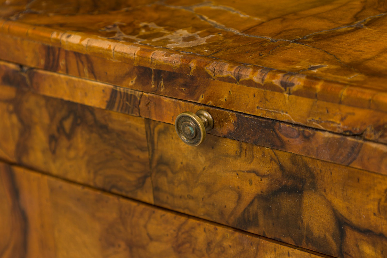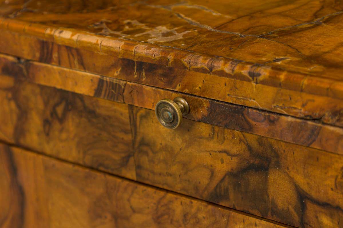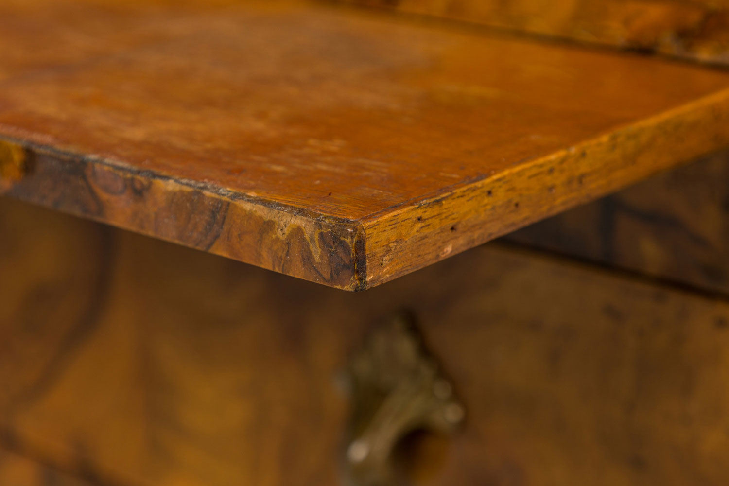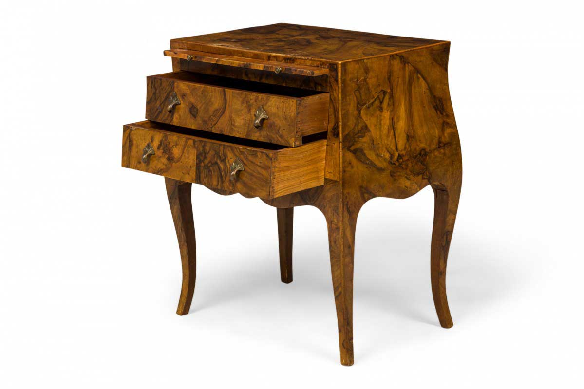 Italian Mid-Century small chest or side / end table with oyster burl veneer and two drawers with bronze drawer pulls, resting on four curved legs.