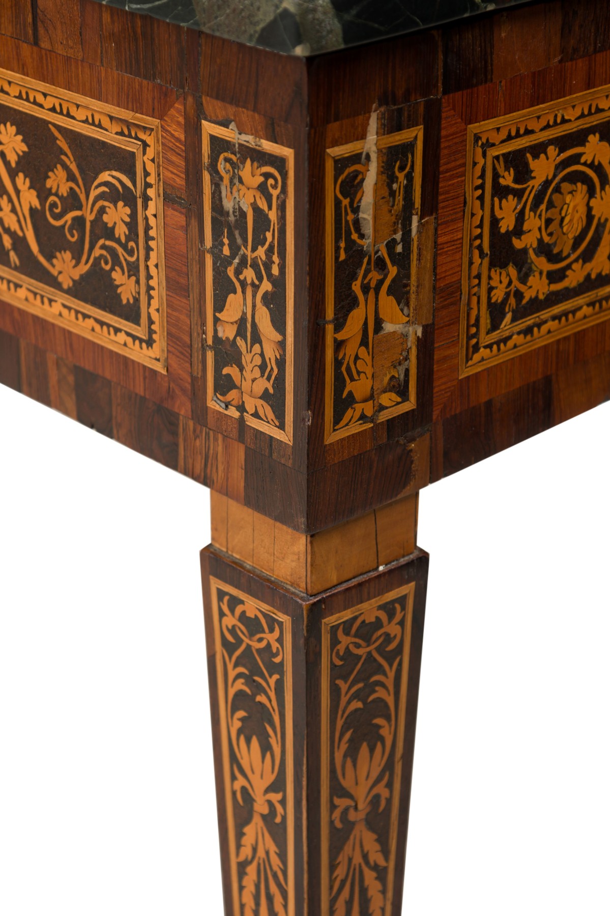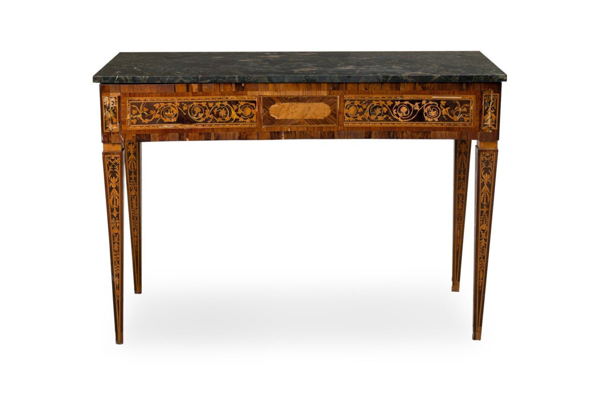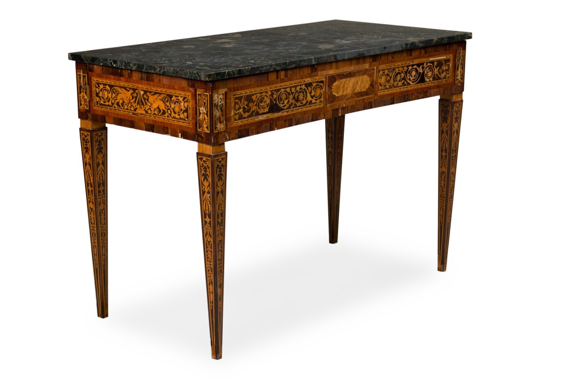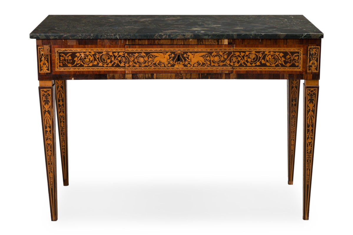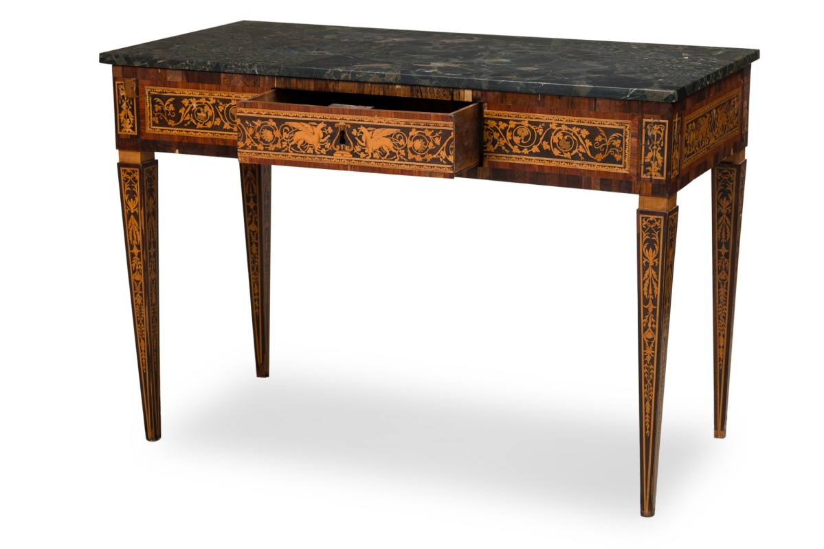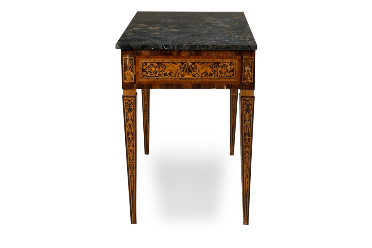 Italian Neo-Classic (18th Century) walnut and lemonwood single drawer rectangular centre table with ornate inlaid patterns along the borders and legs with a mythological Griffin motif and wreath pattern, resting on 4 tapered legs, with a black marble top.