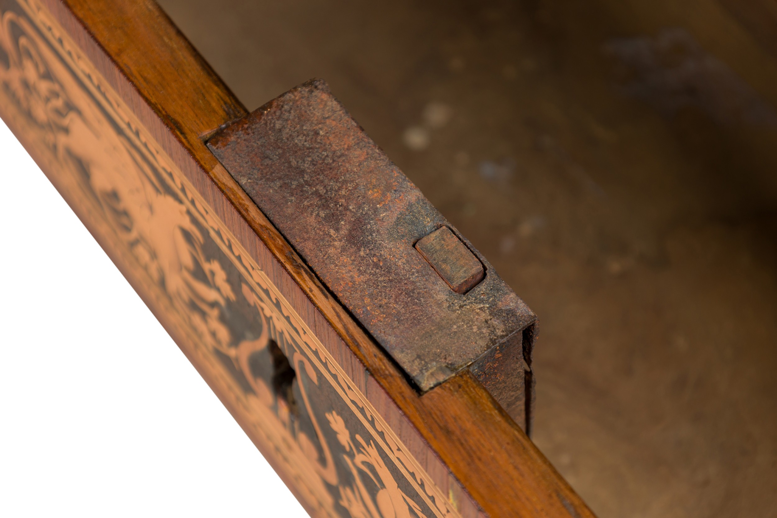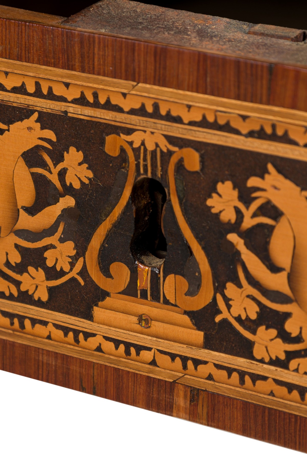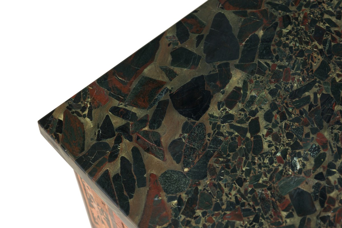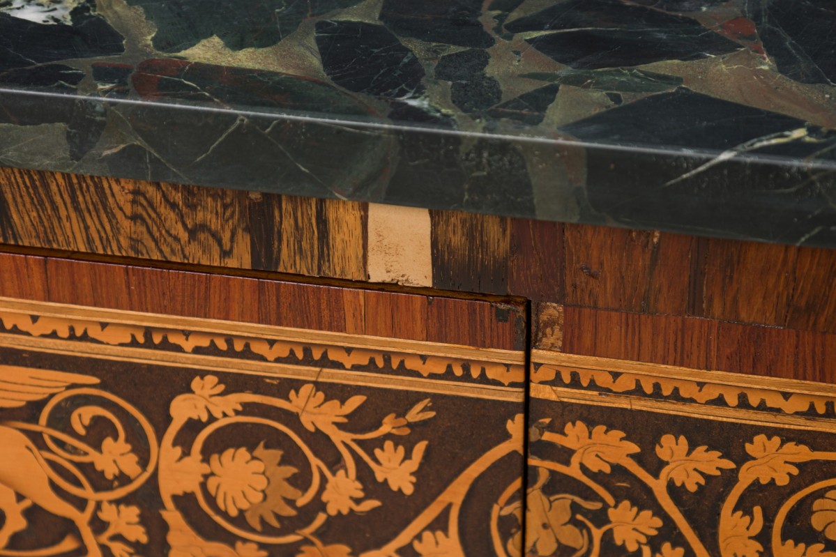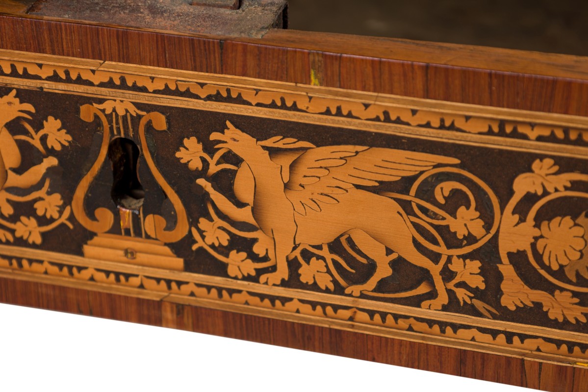 Italian Neo-Classic (18th Century) walnut and lemonwood single drawer rectangular centre table with ornate inlaid patterns along the borders and legs with a mythological Griffin motif and wreath pattern, resting on 4 tapered legs, with a black marble top.