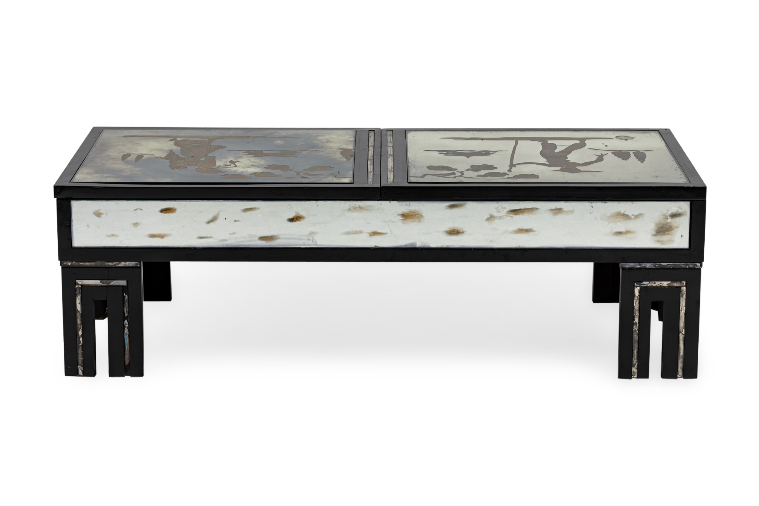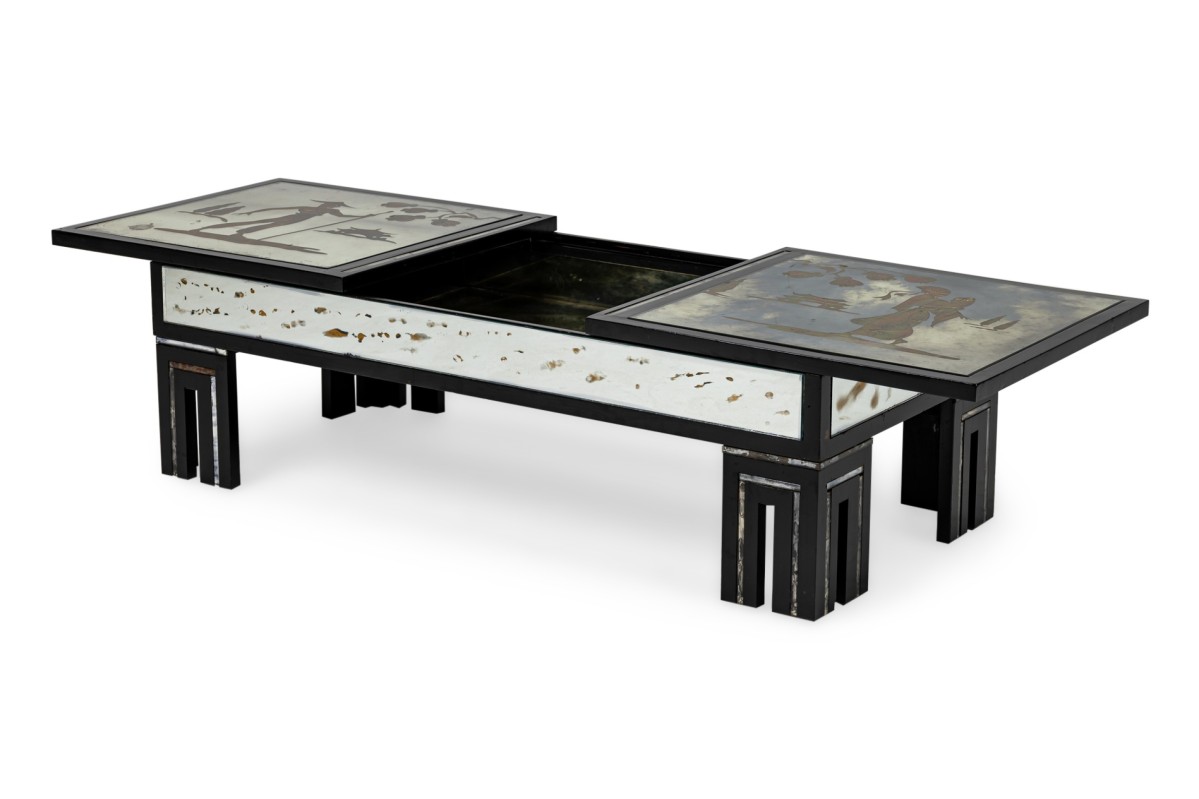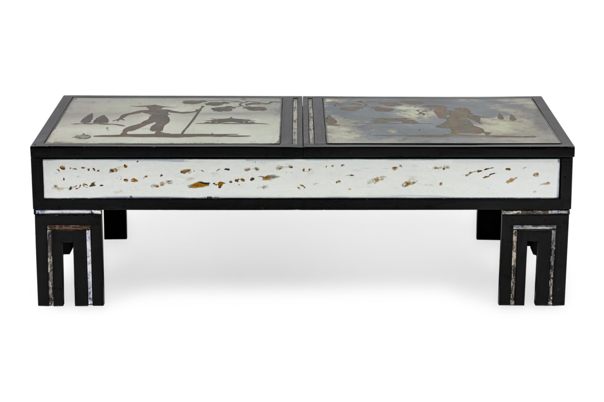 French Mid-Century black lacquer low rectangular coffee table with 2 sliding eglomise mirrored chinoiserie decorated top top panels that slide open to cover a hidden storage section with mirrored trim sides