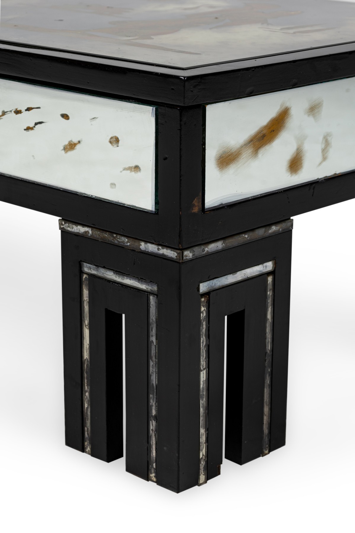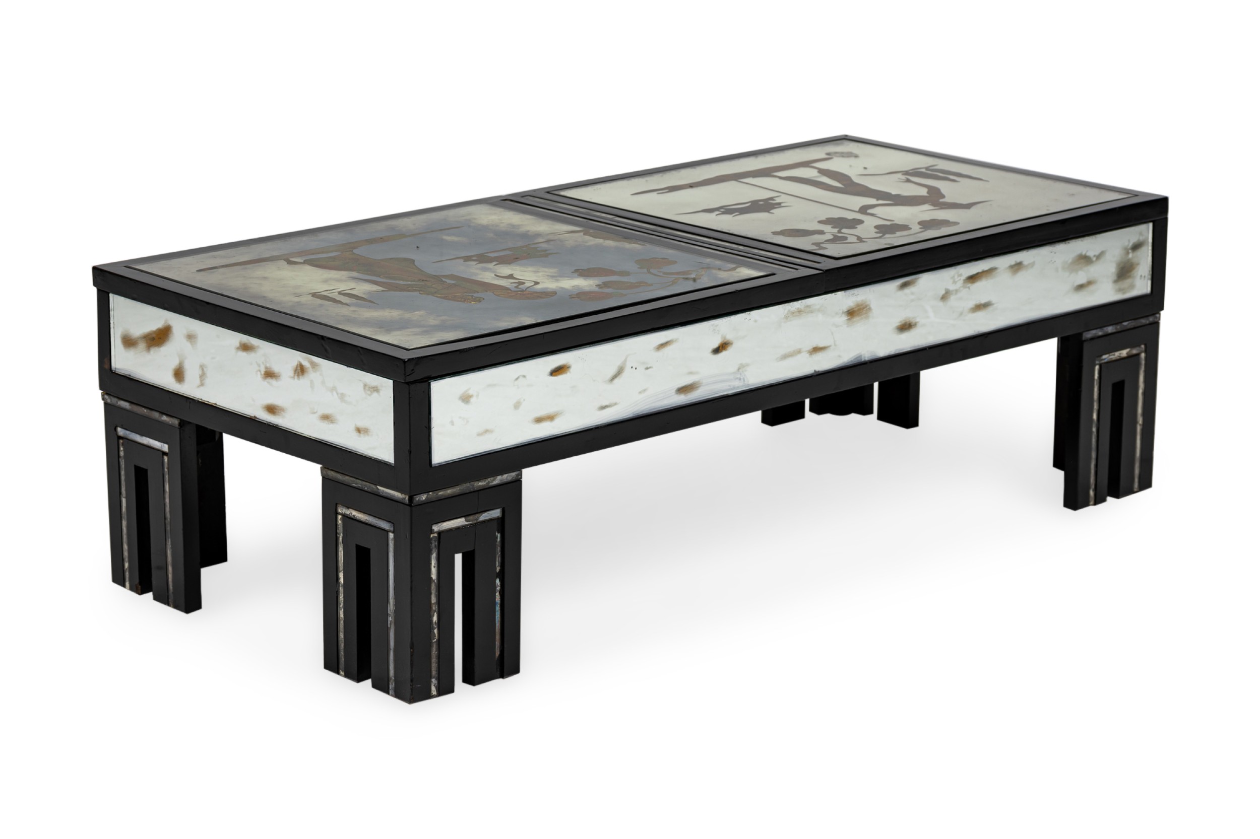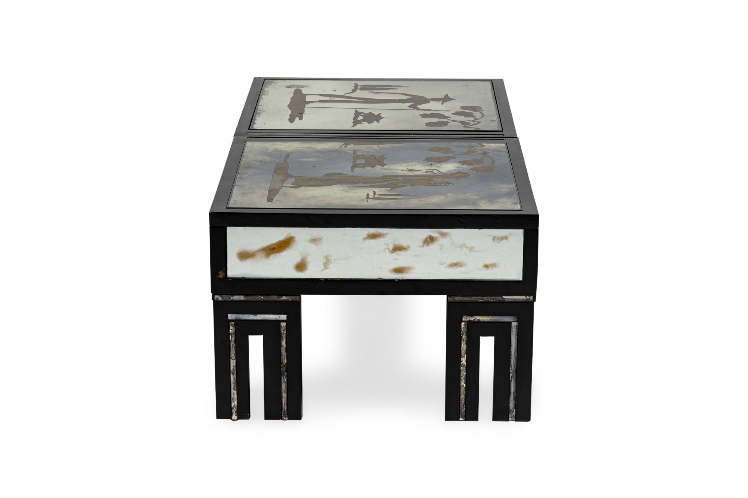 French Mid-Century black lacquer low rectangular coffee table with 2 sliding eglomise mirrored chinoiserie decorated top top panels that slide open to cover a hidden storage section with mirrored trim sides