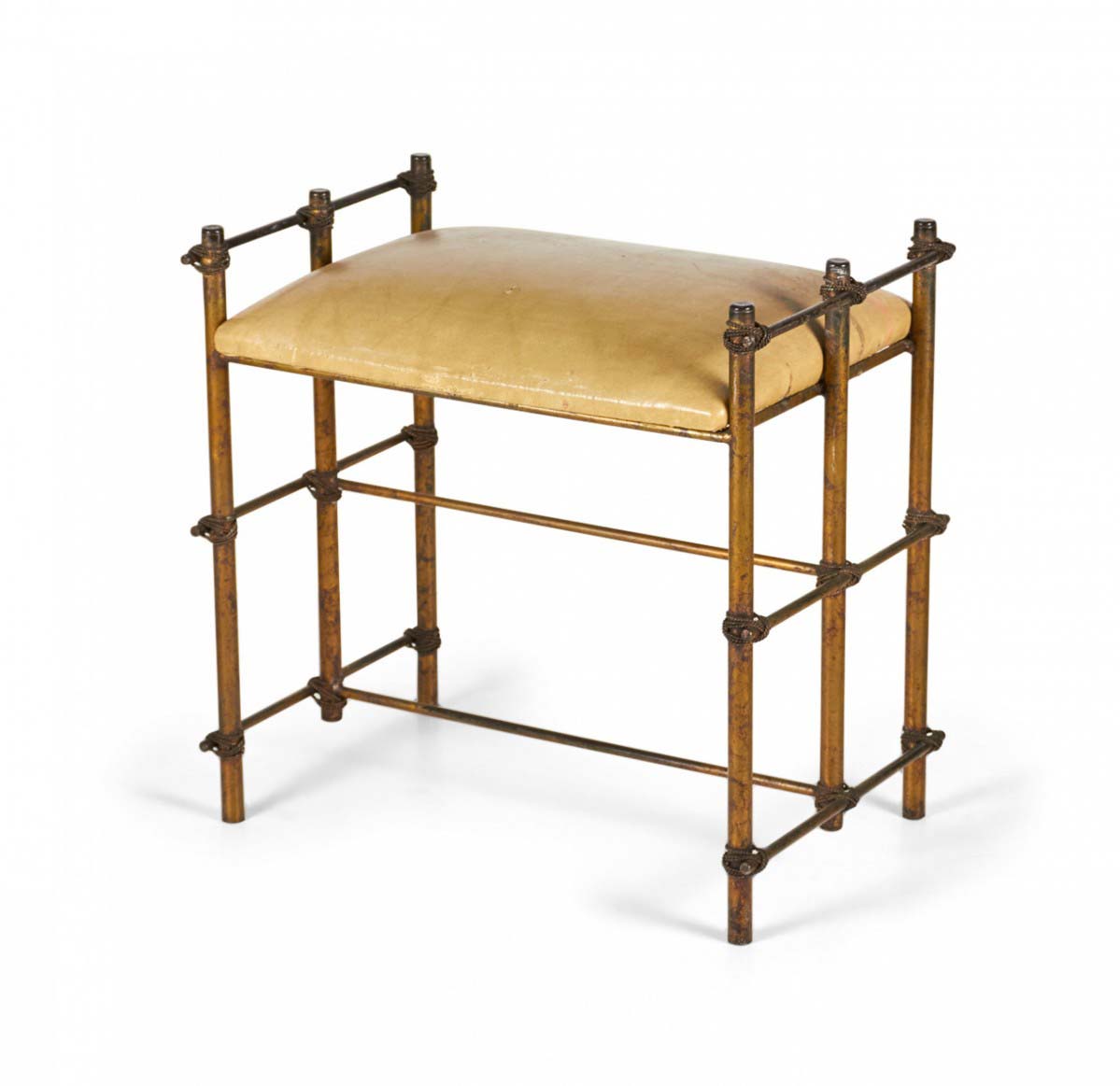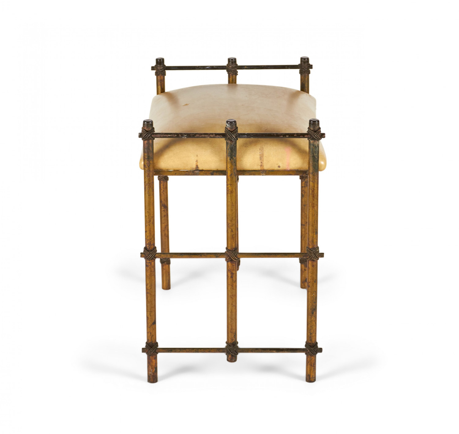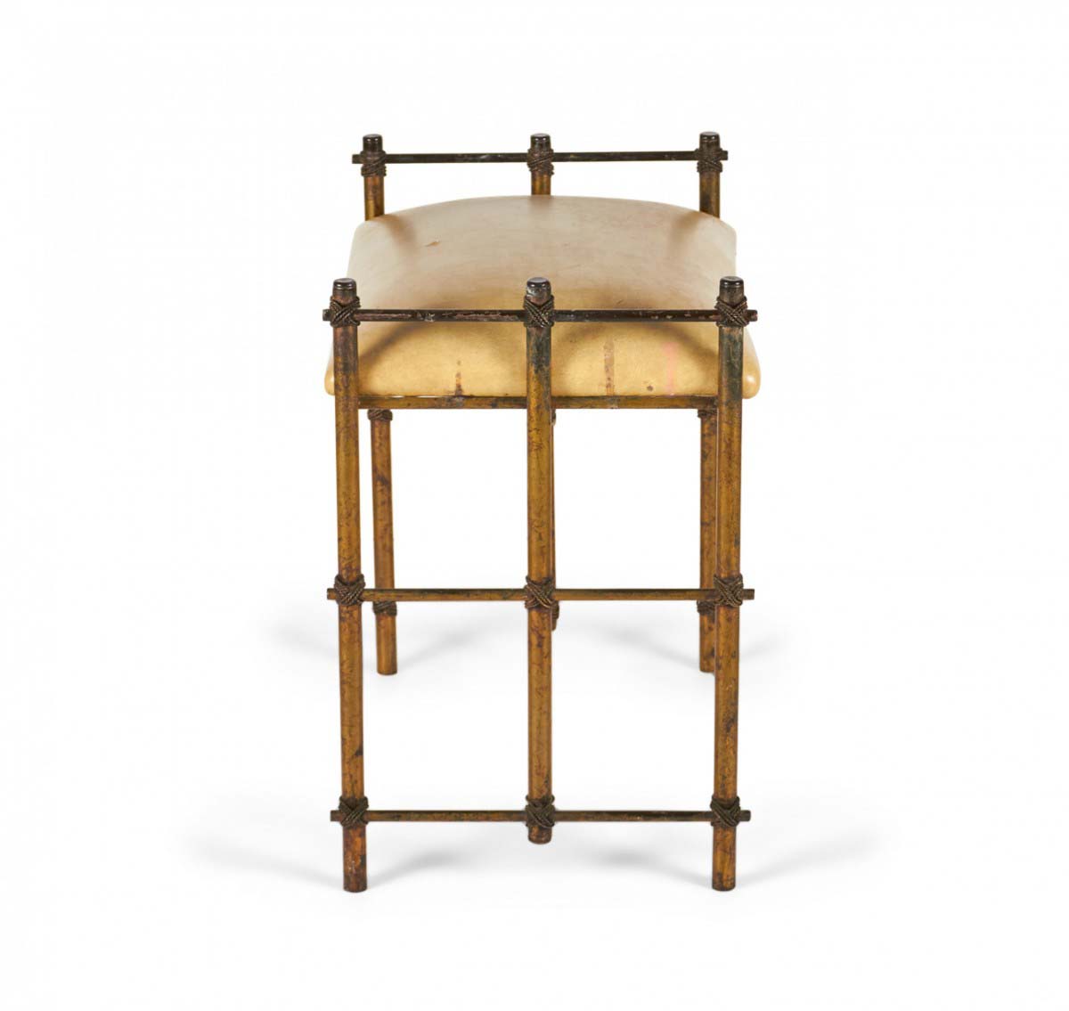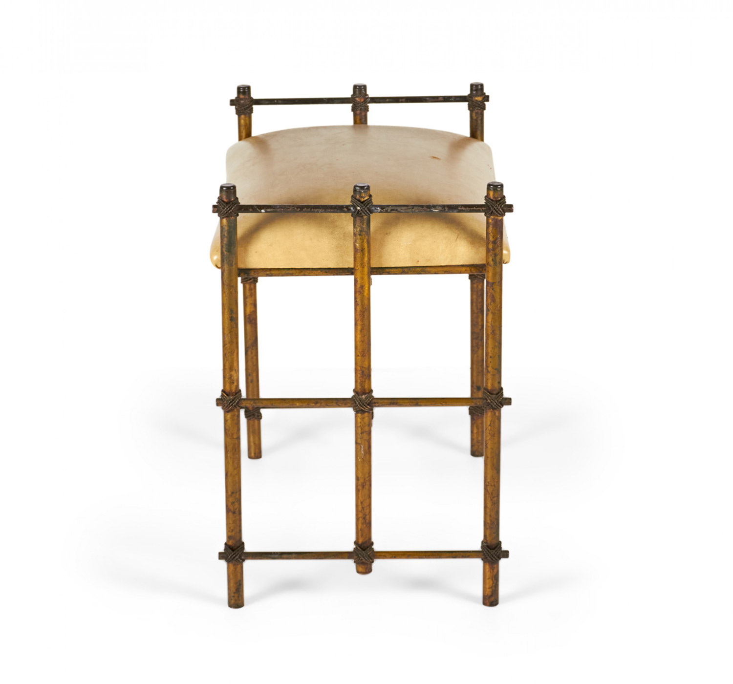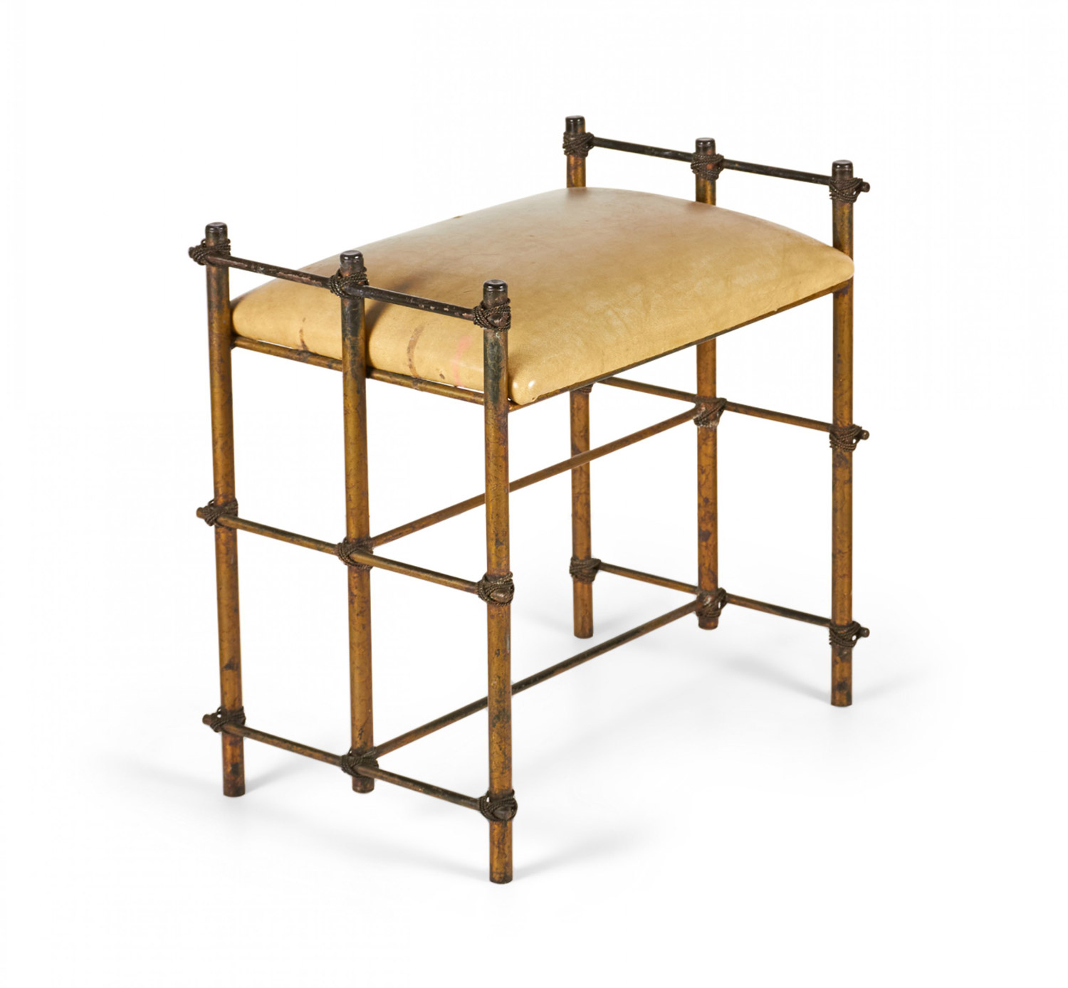 Vintage vanity bench with a patinated gilt steel frame comprised of three dowel supports on either side connected with decoratively tied rope at the cross-sections and joined in the center by two stretcher dowels to support a beige leather upholstered seat.