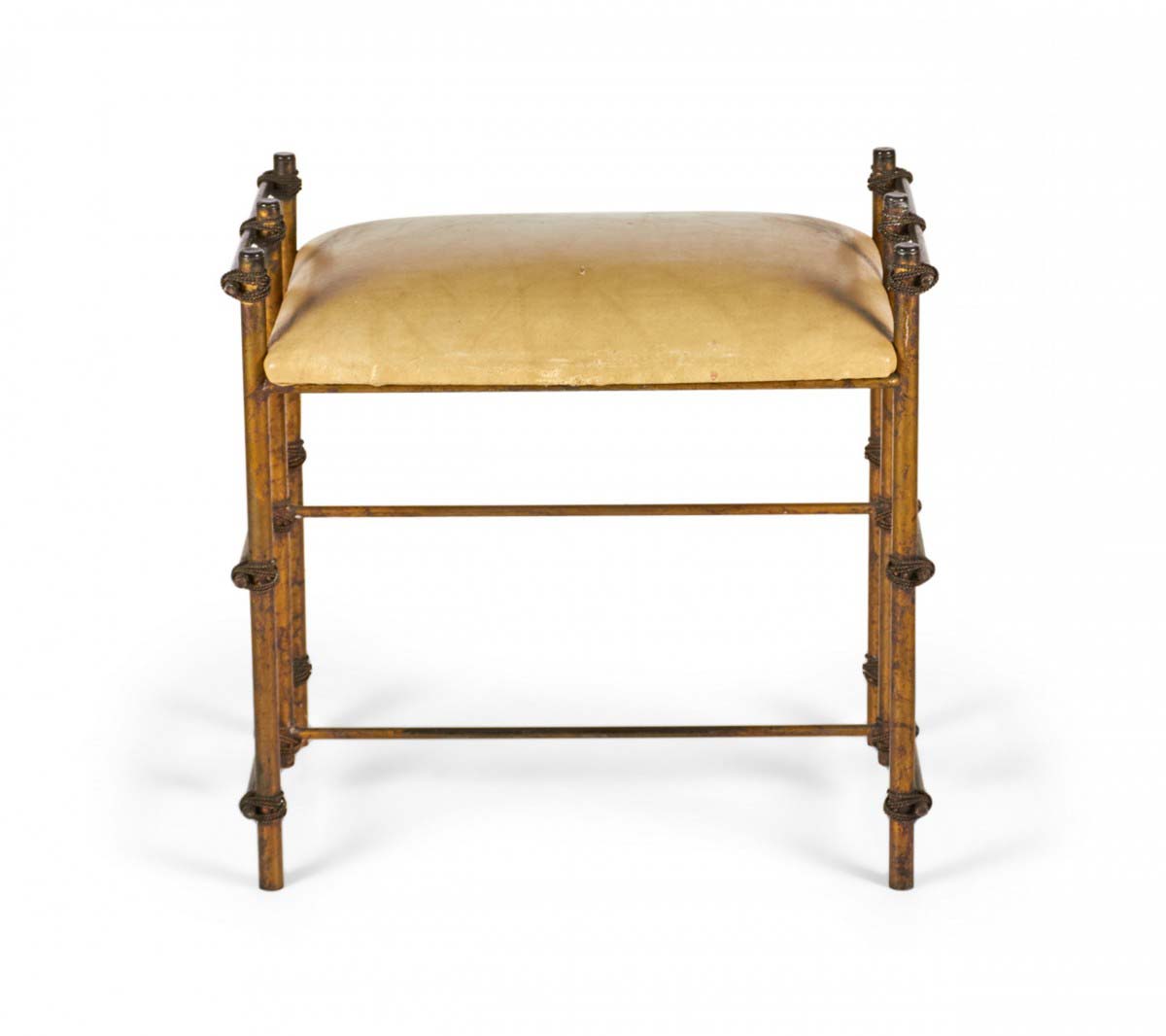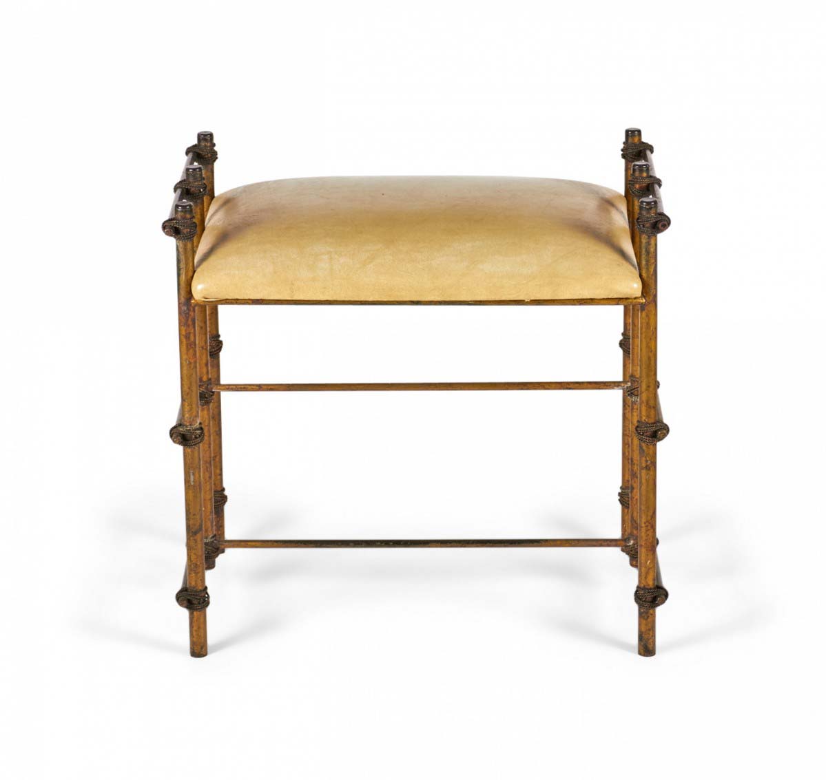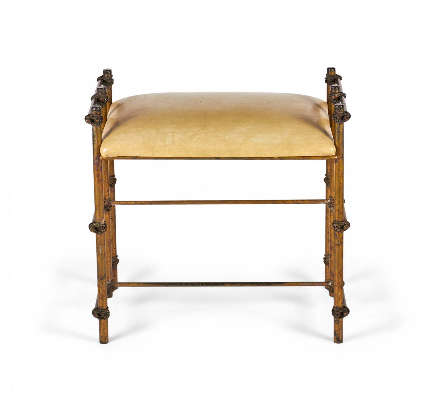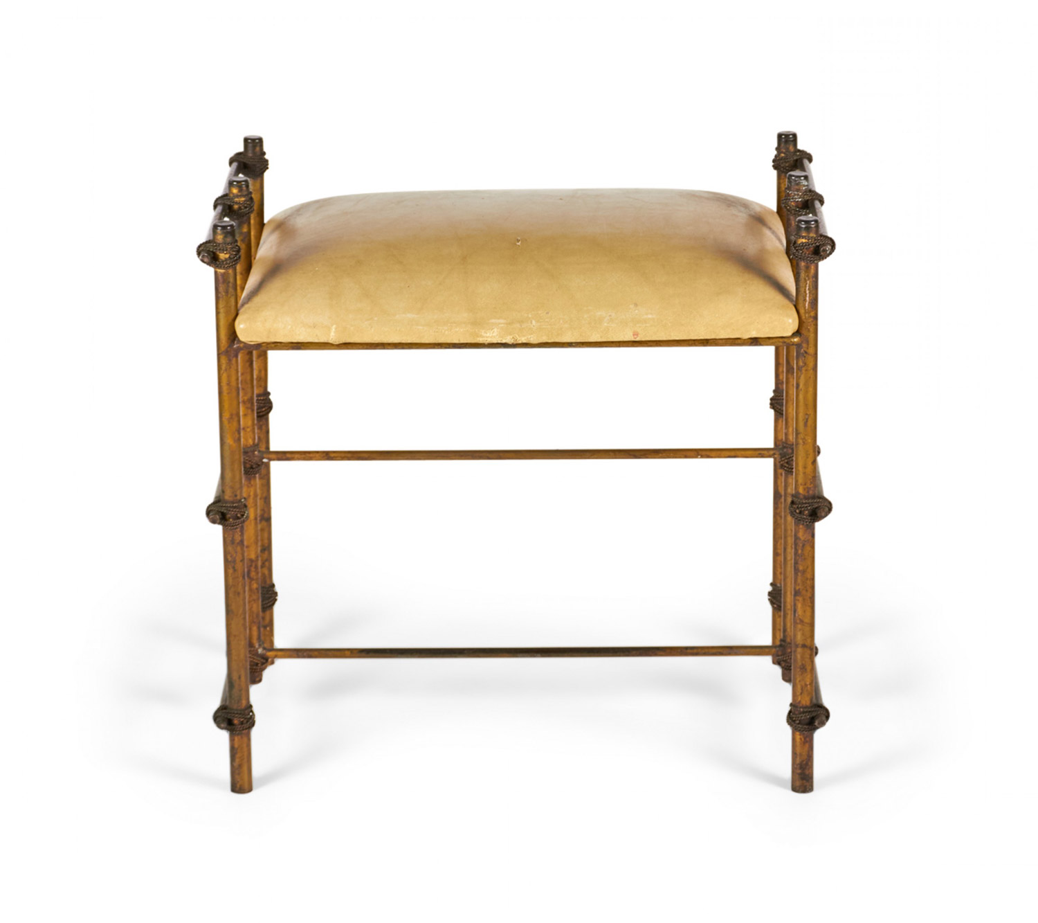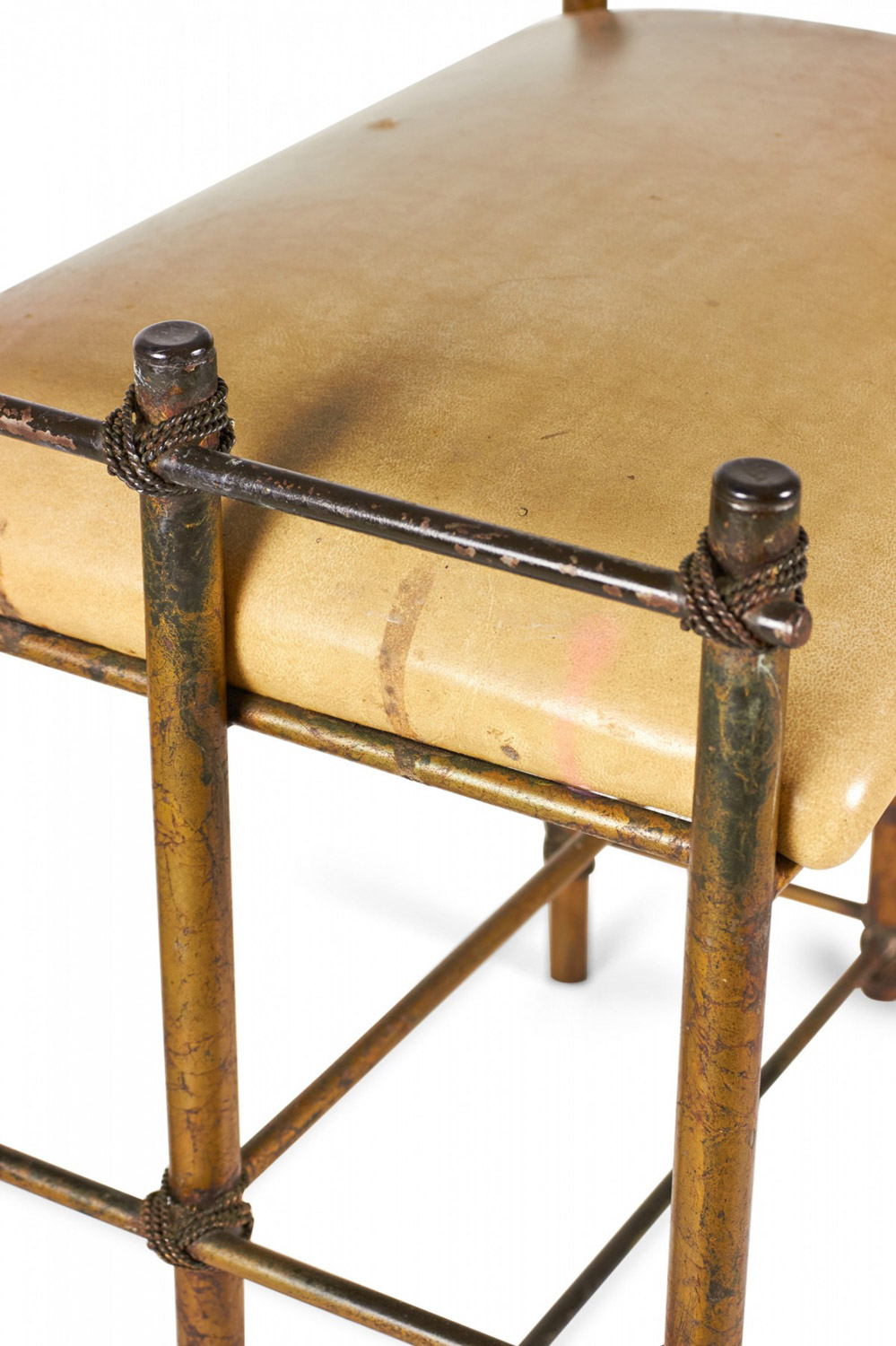 Vintage vanity bench with a patinated gilt steel frame comprised of three dowel supports on either side connected with decoratively tied rope at the cross-sections and joined in the center by two stretcher dowels to support a beige leather upholstered seat.