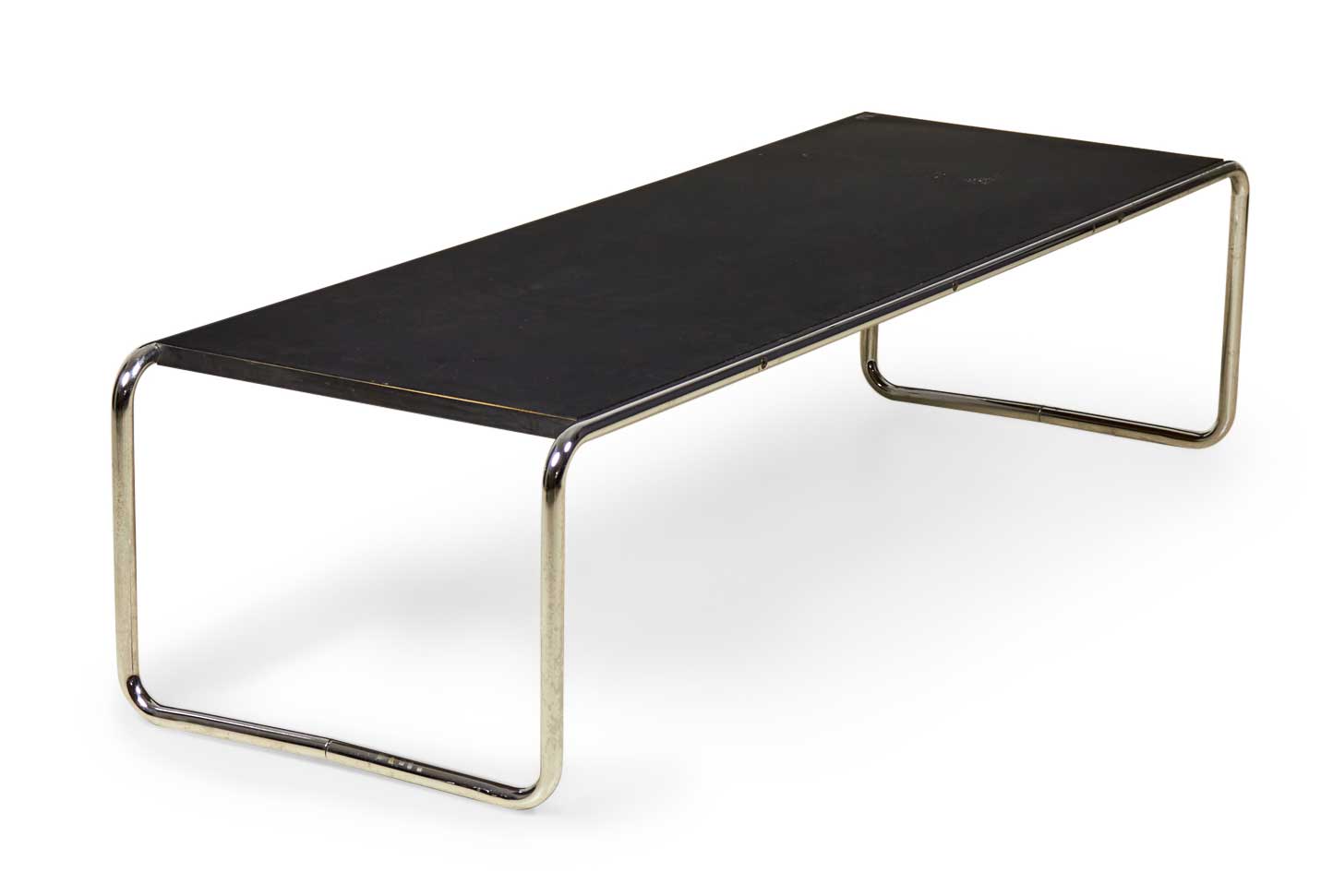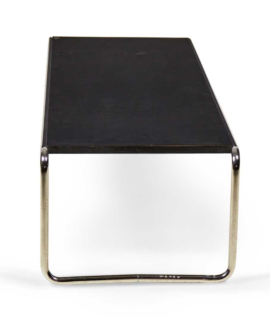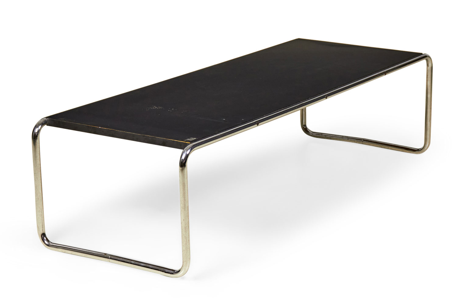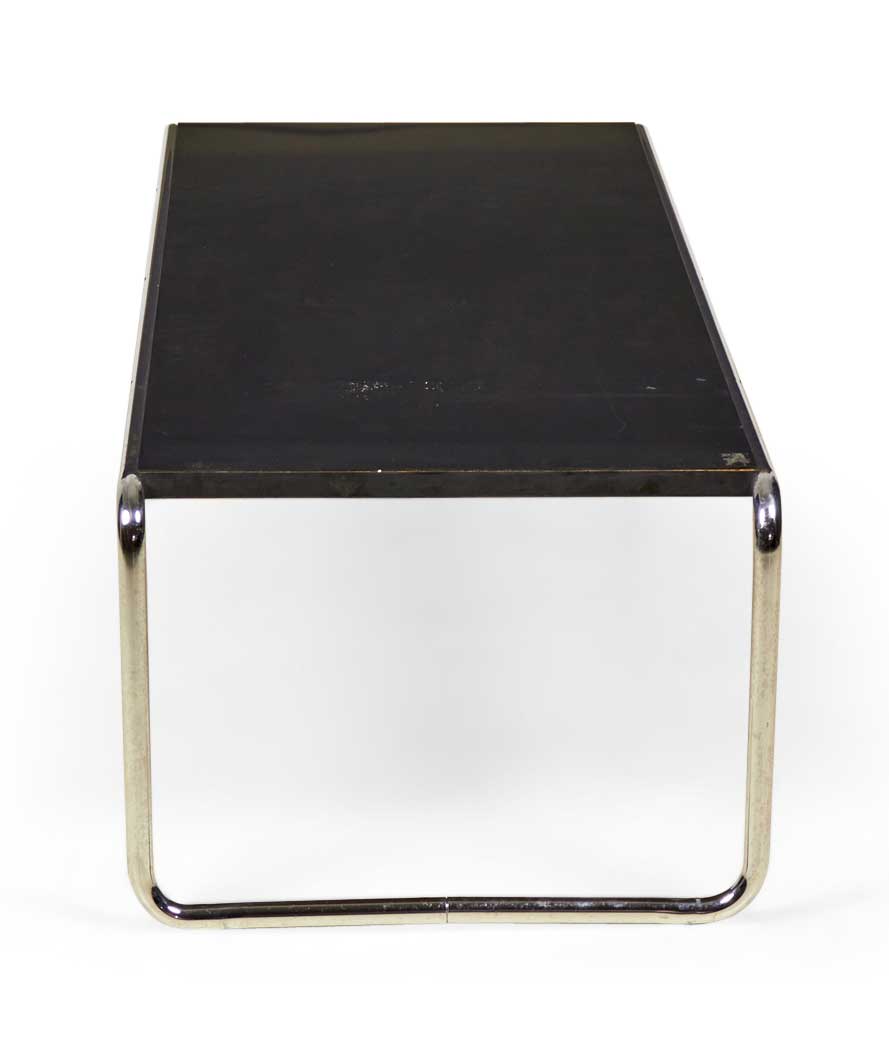 American International-Style (circa 1924) coffee table with a gloss black mica rectangular top supported on a chrome plated steel tube frame.(similar table in white: DUF0019A)