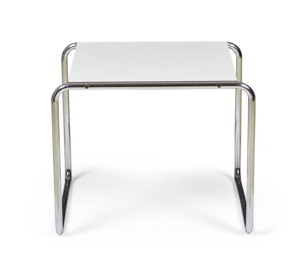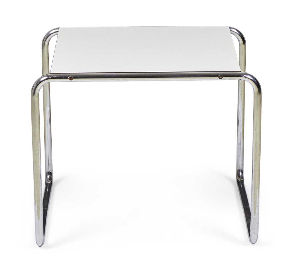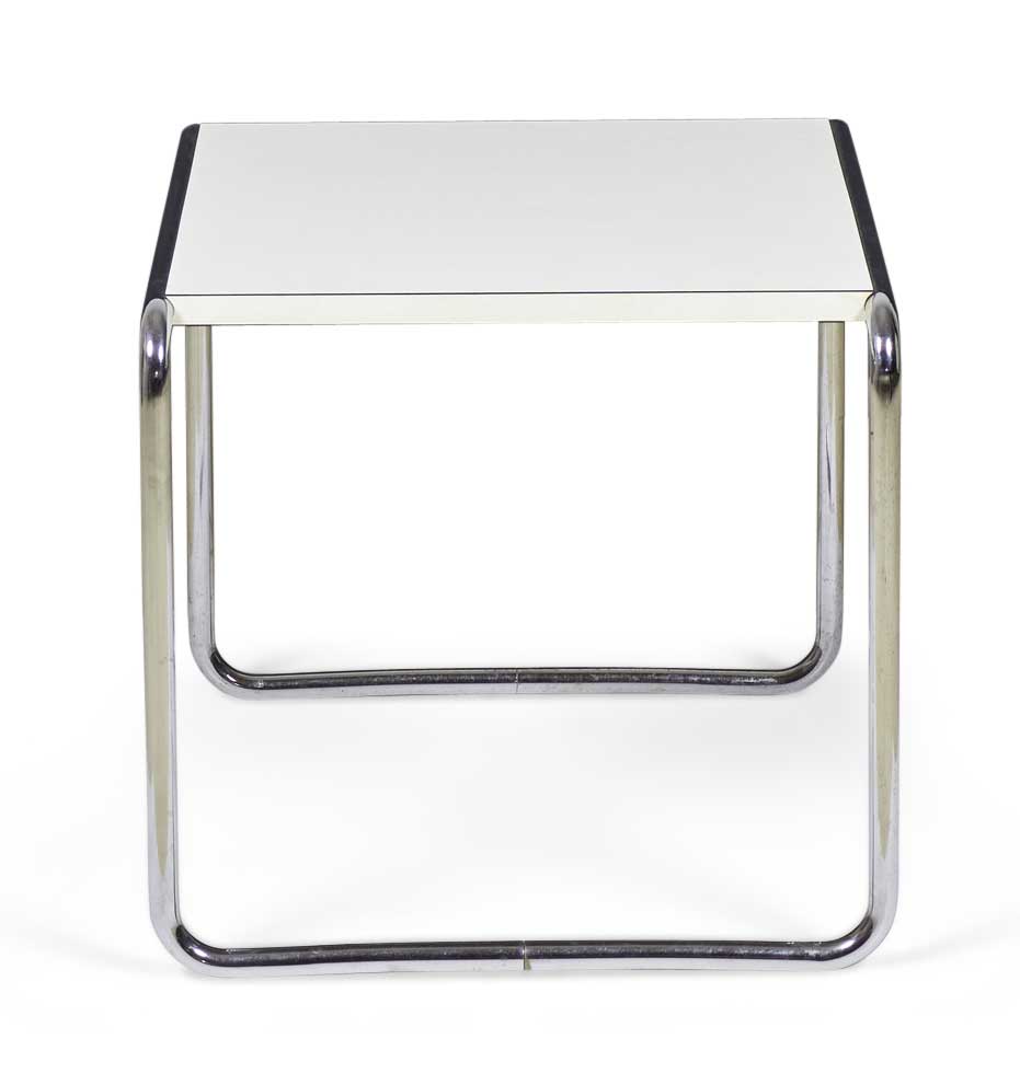 American International-Style (circa 1924) end / occasional table with a white mica top supported on a chrome plated steel tube frame. (matching coffee table: DUF0019A)