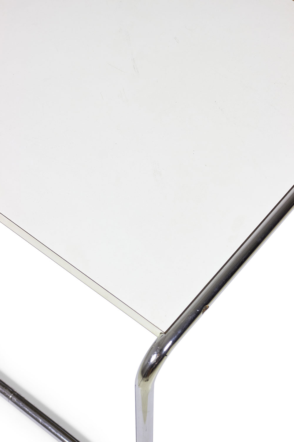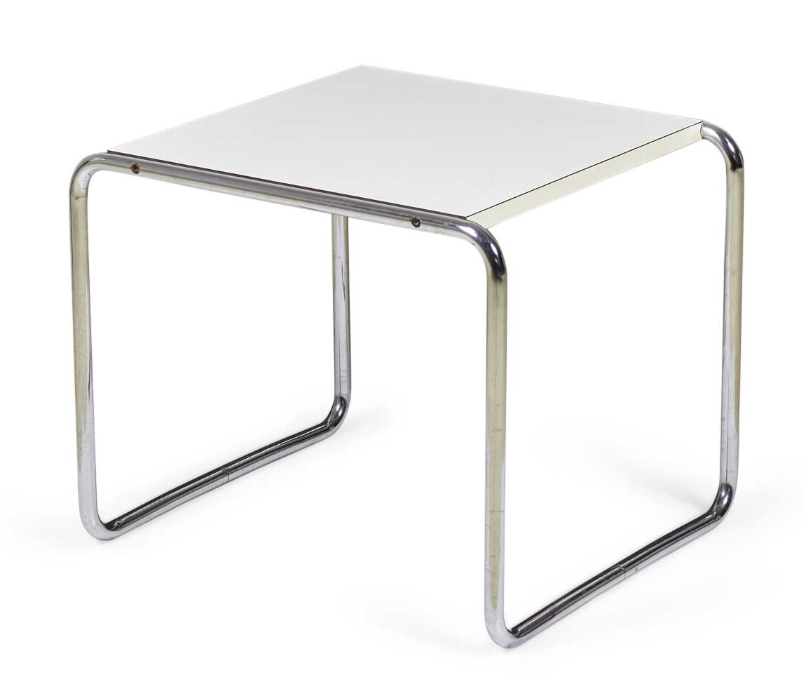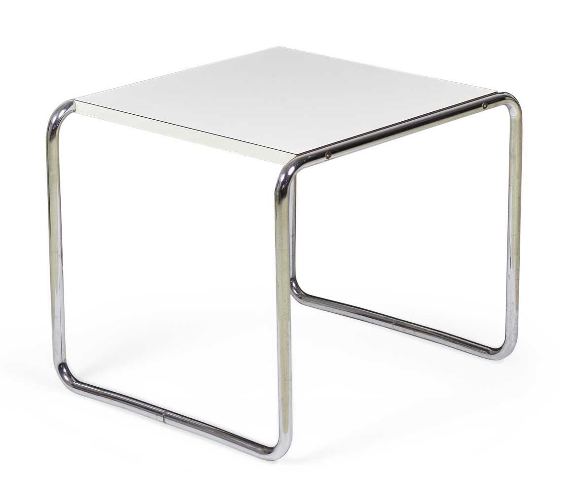 American International-Style (circa 1924) end / occasional table with a white mica top supported on a chrome plated steel tube frame. (matching coffee table: DUF0019A)