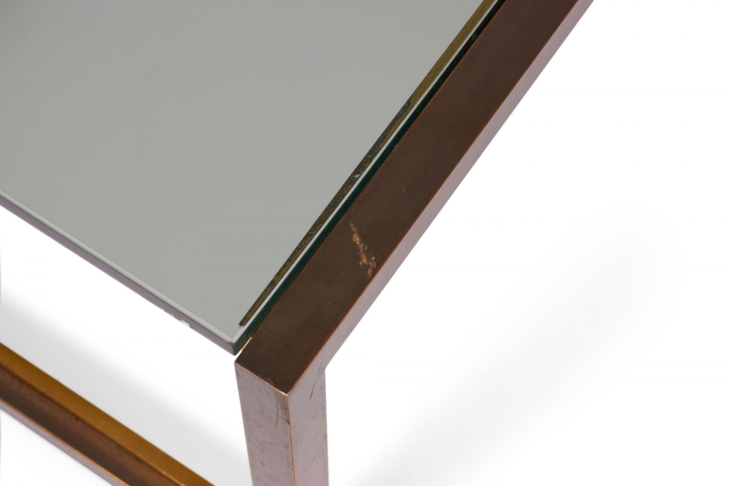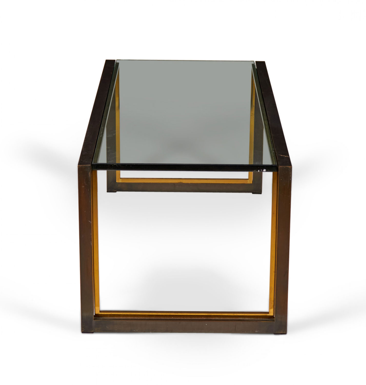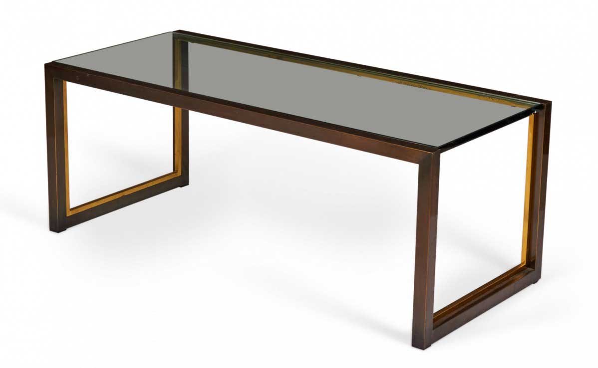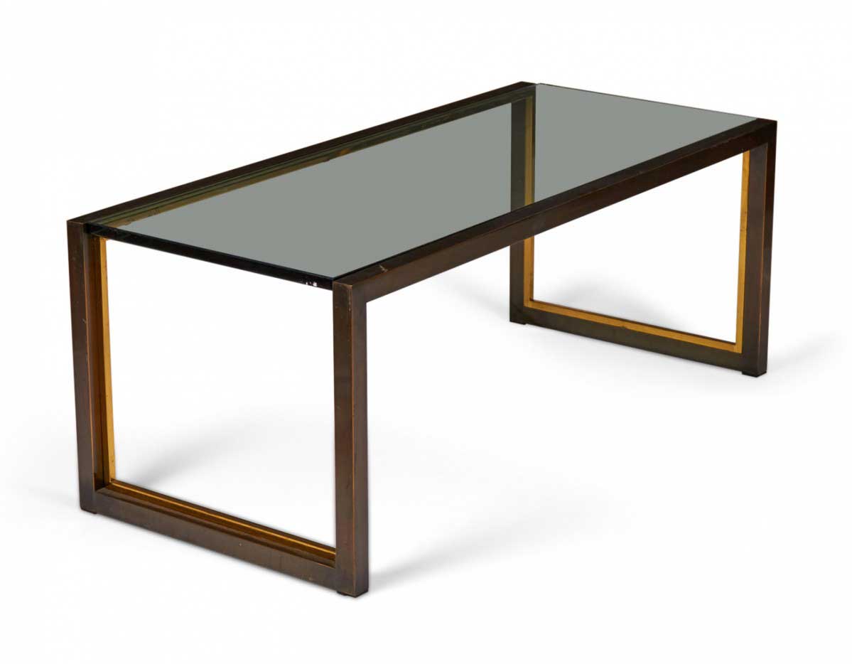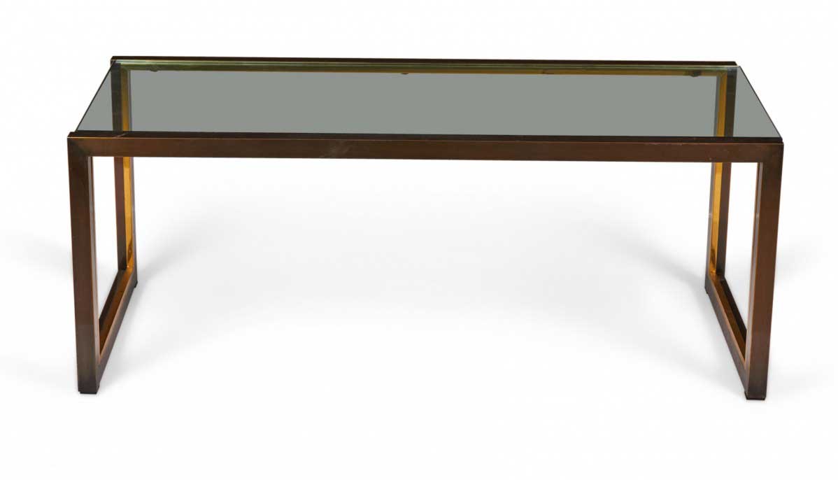 American Mid-Century rectangular coffee / cocktail table with a copper-colored metal bracket-shaped base with bronze trim and an inset smoked glass top.