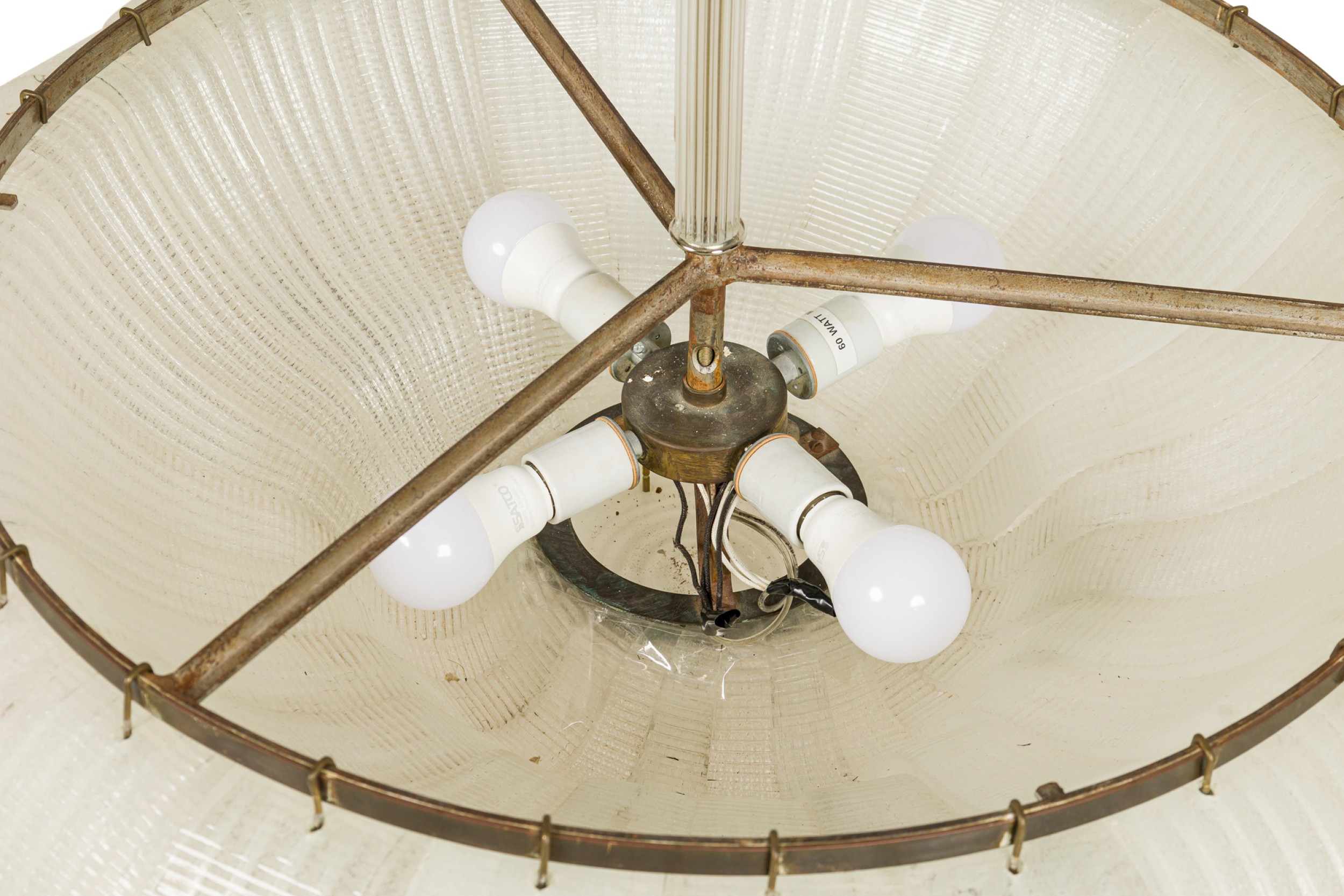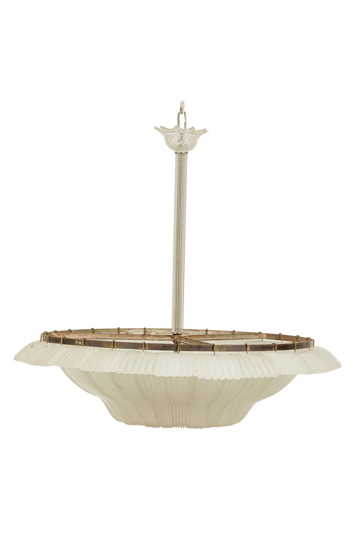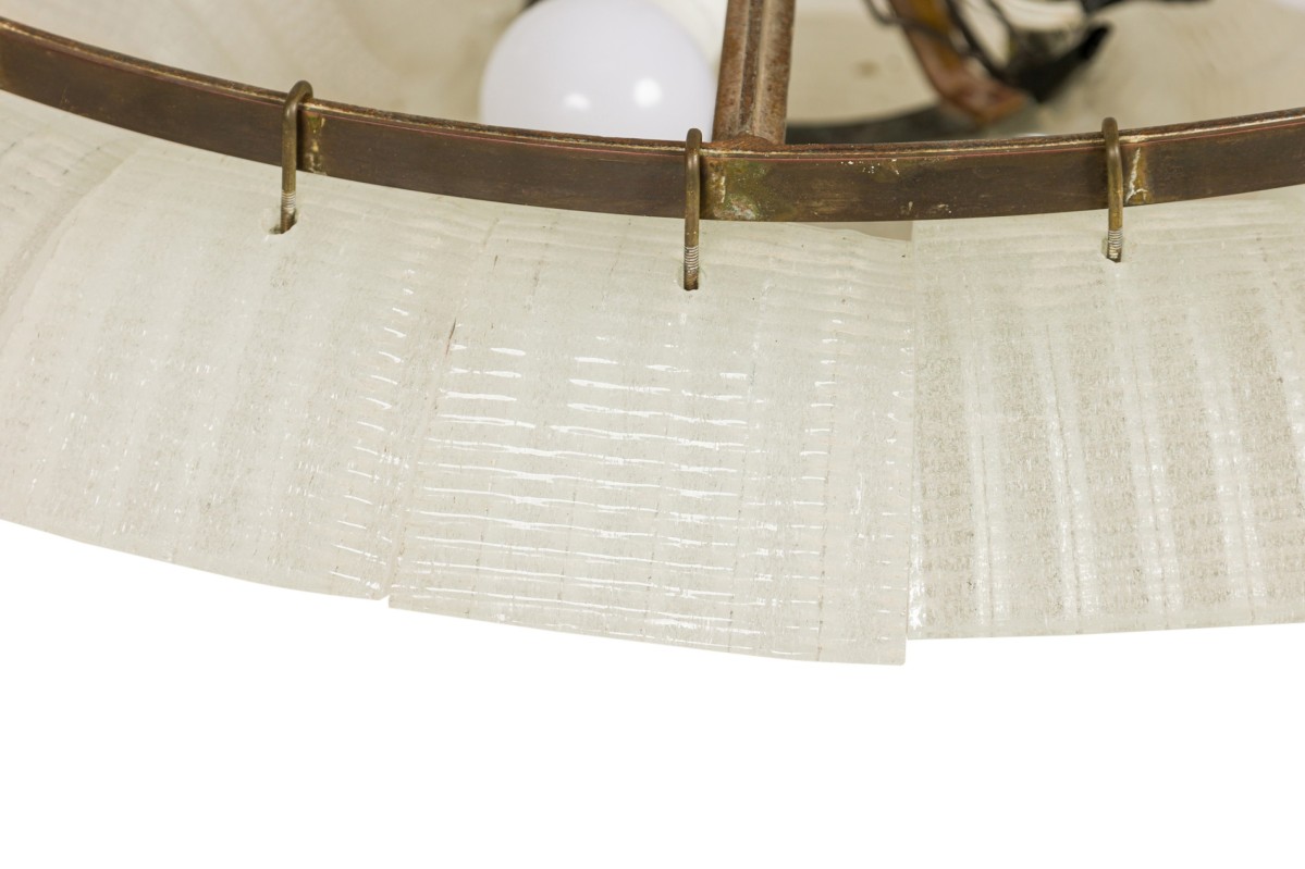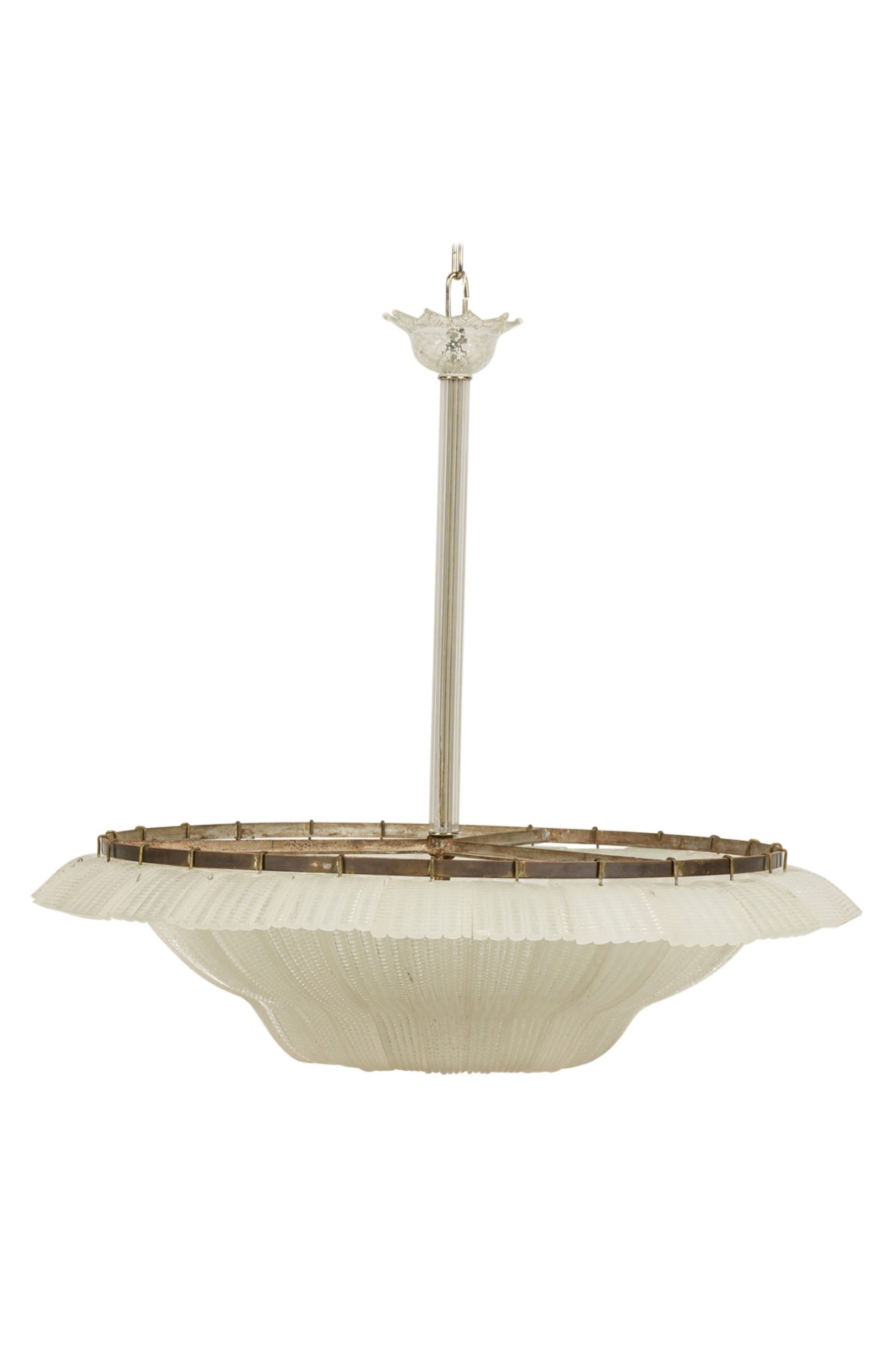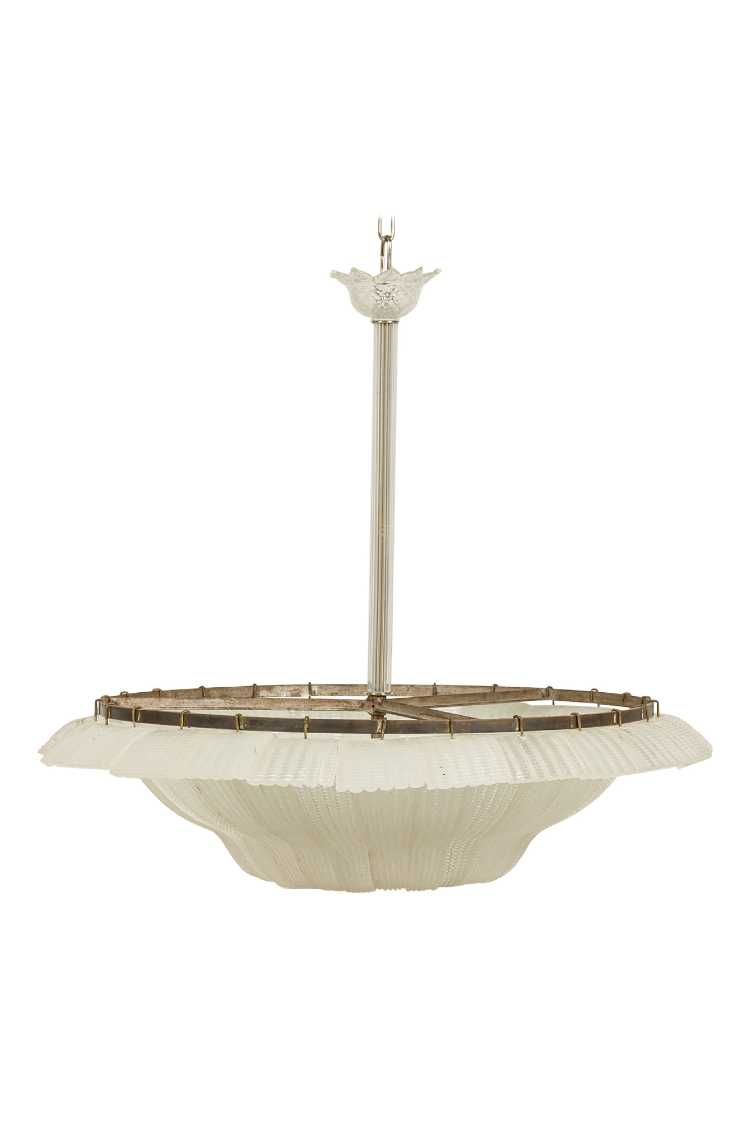 Mid-Century round chandelier with muliple textured frosted glass panels forming a dome shaped bottom with a scalloped design top edge susupended by a center column