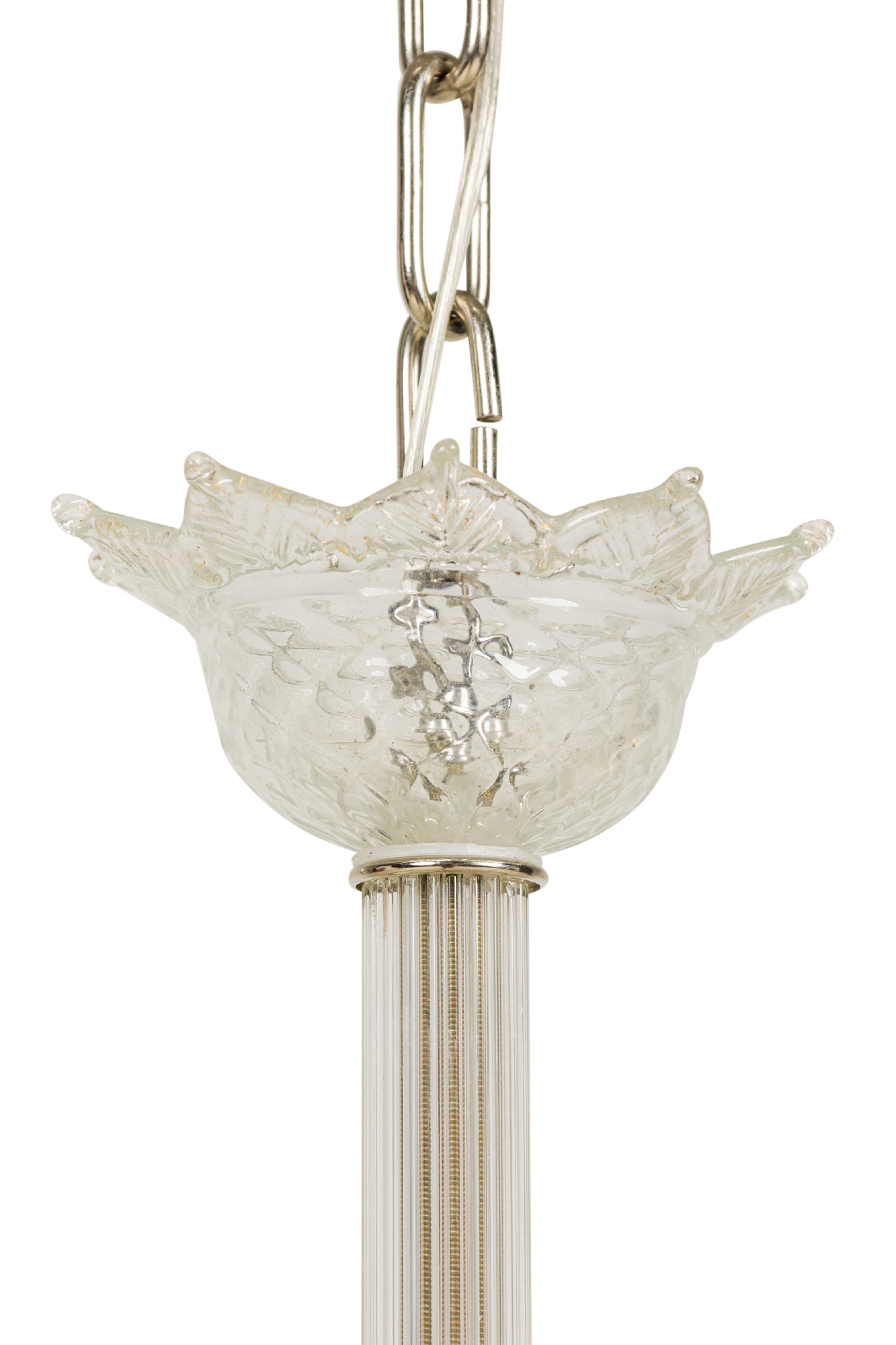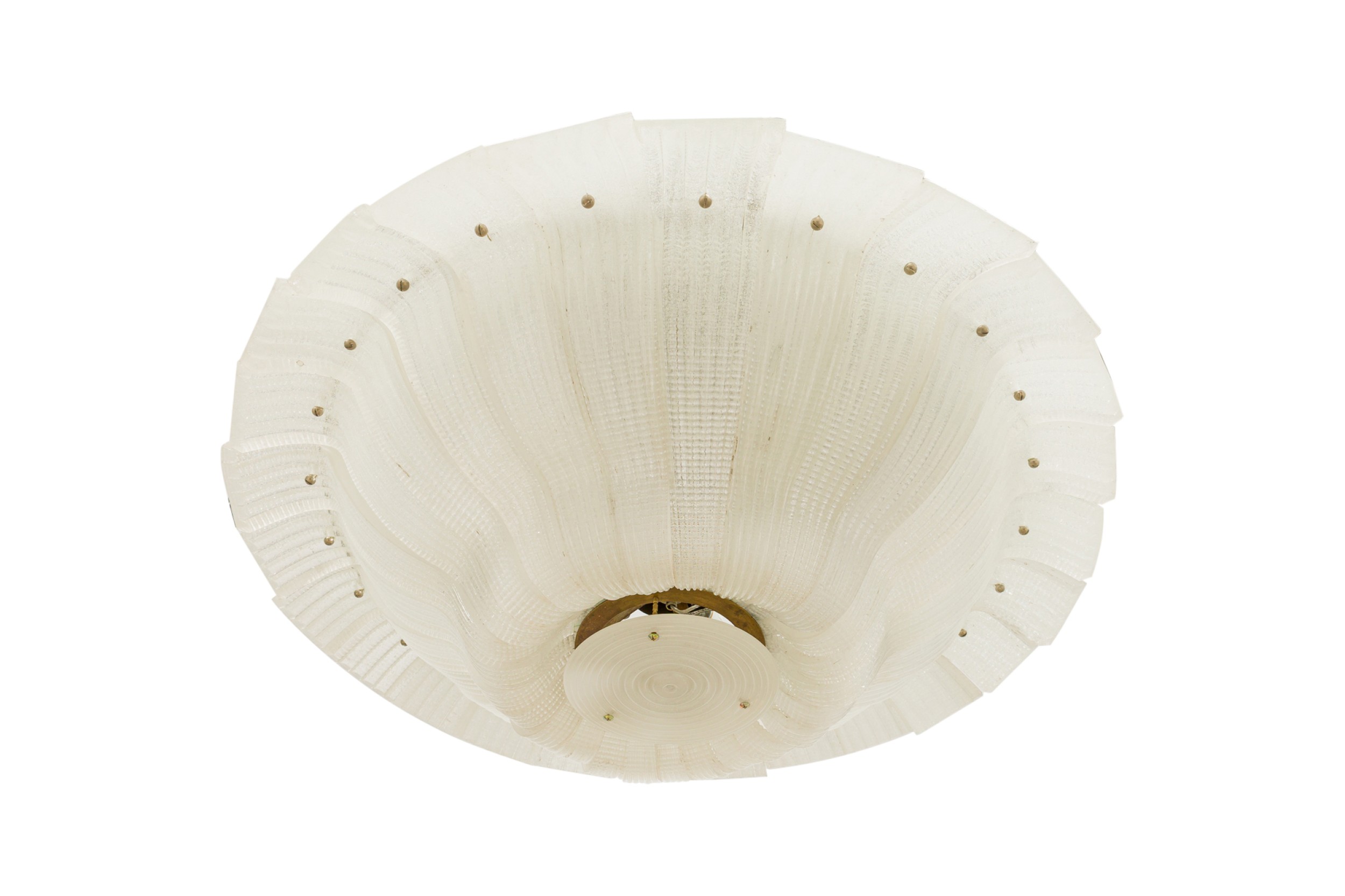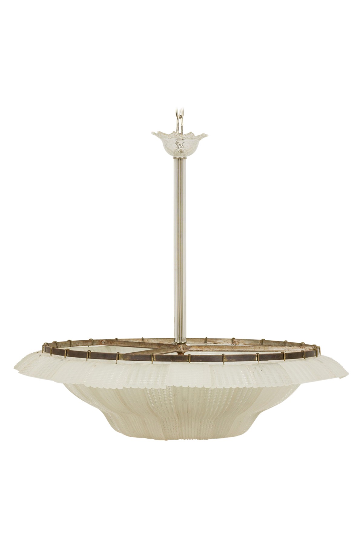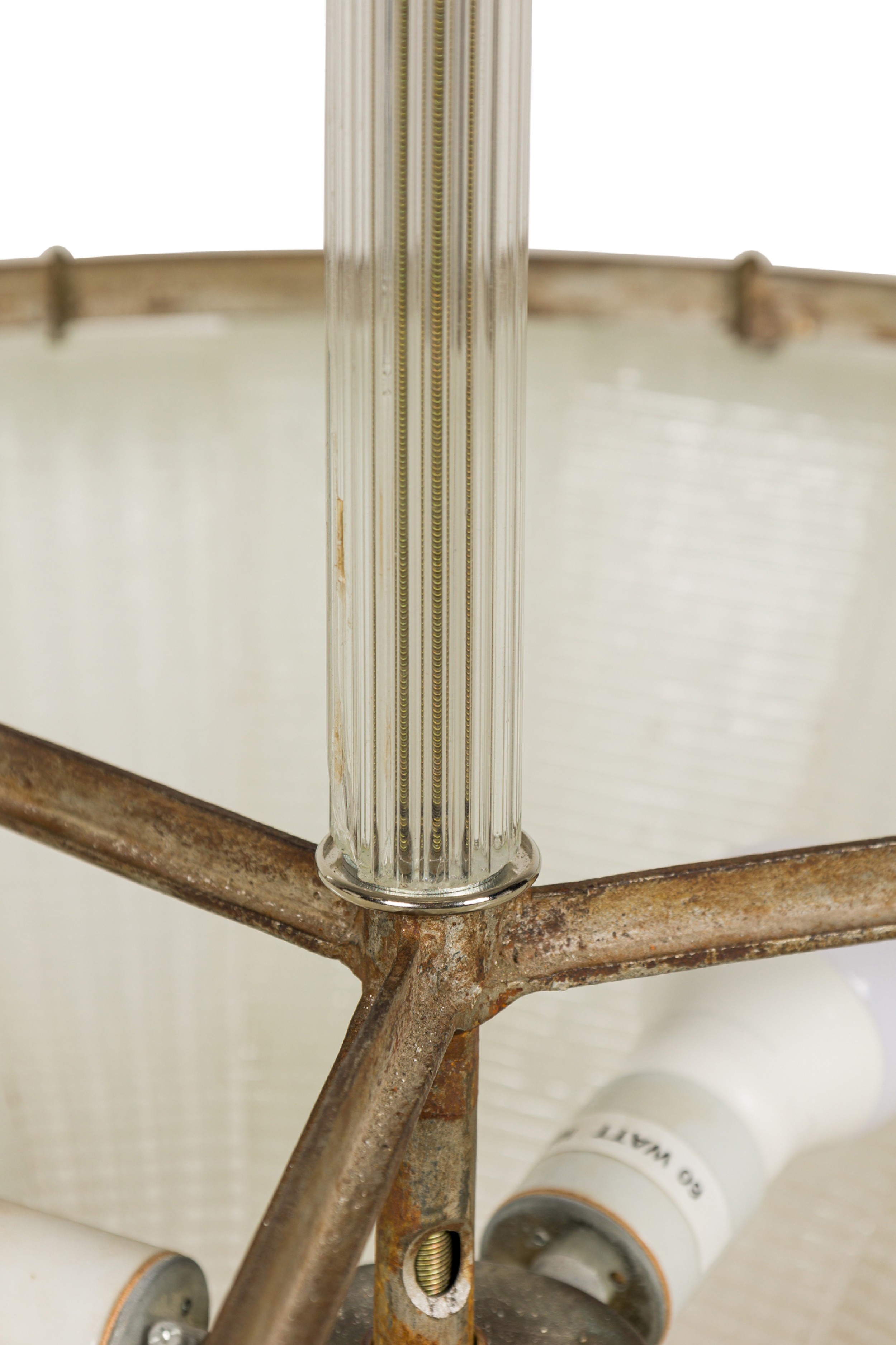 Mid-Century round chandelier with muliple textured frosted glass panels forming a dome shaped bottom with a scalloped design top edge susupended by a center column