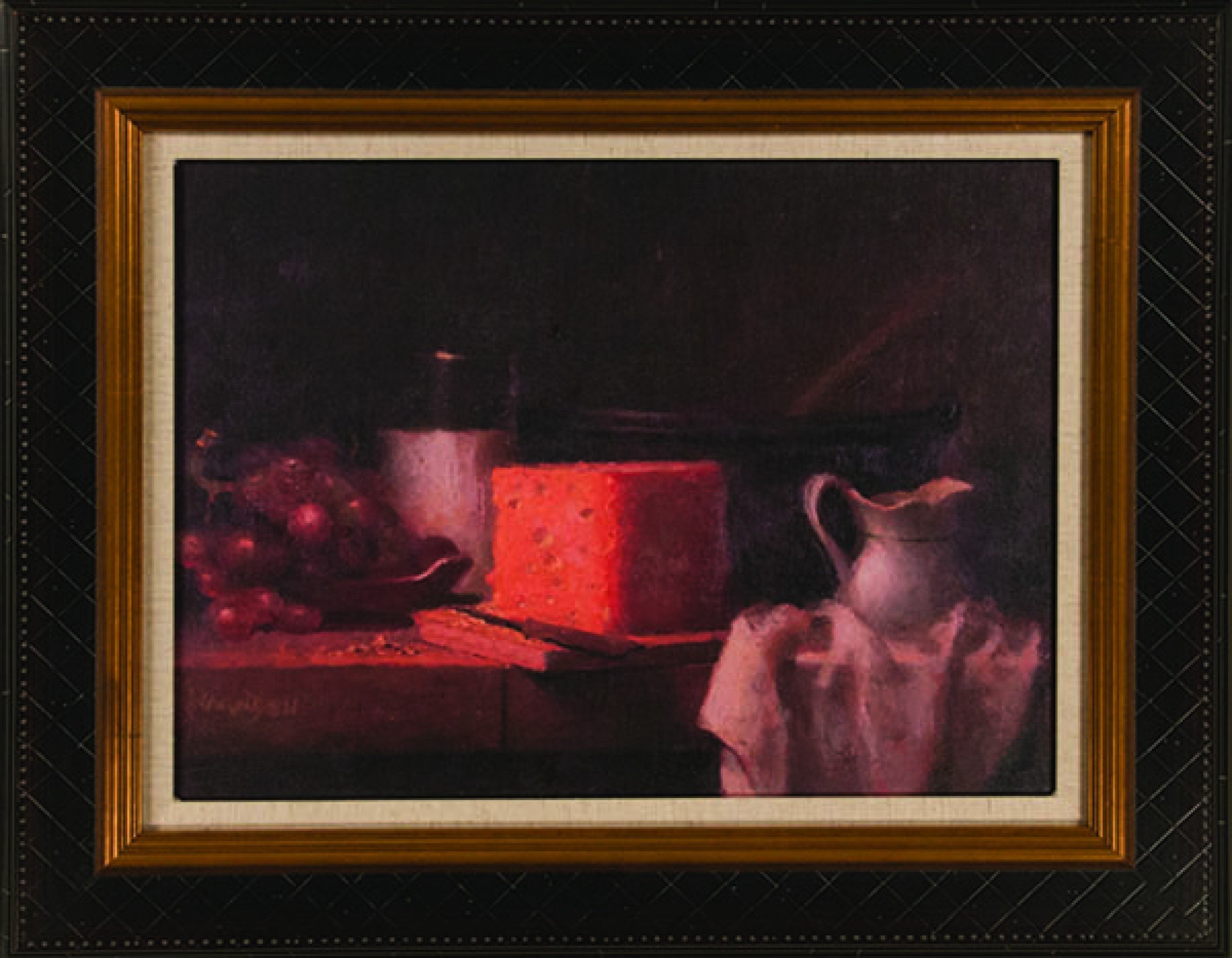 Contemporary canvas print of a 19th Century-style still life of food on a wood table in a rectangular black and gold wood frame with linen liner.