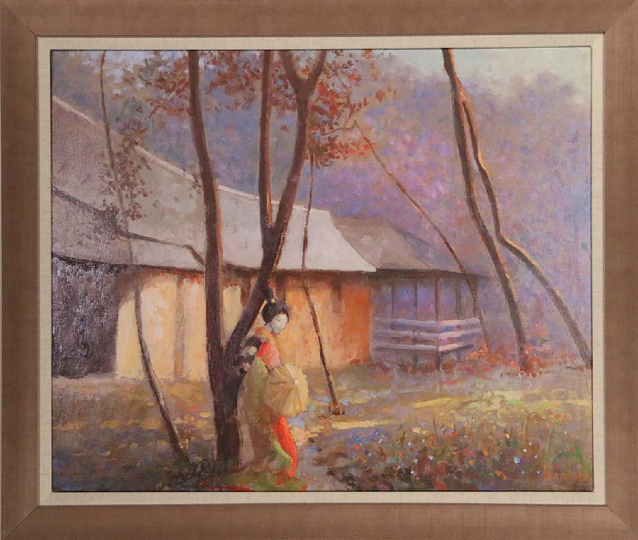 Contemporary canvas print of a painting depicting a geisha in the woods near a building in a rectangular taupe wood frame with linen liner.