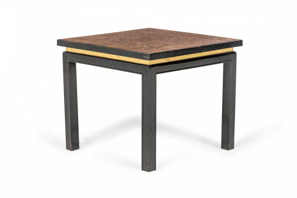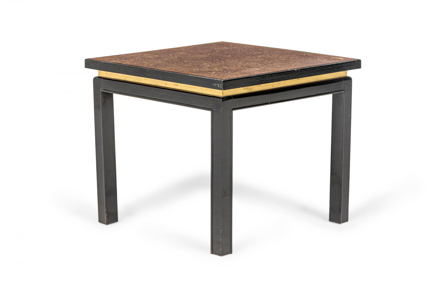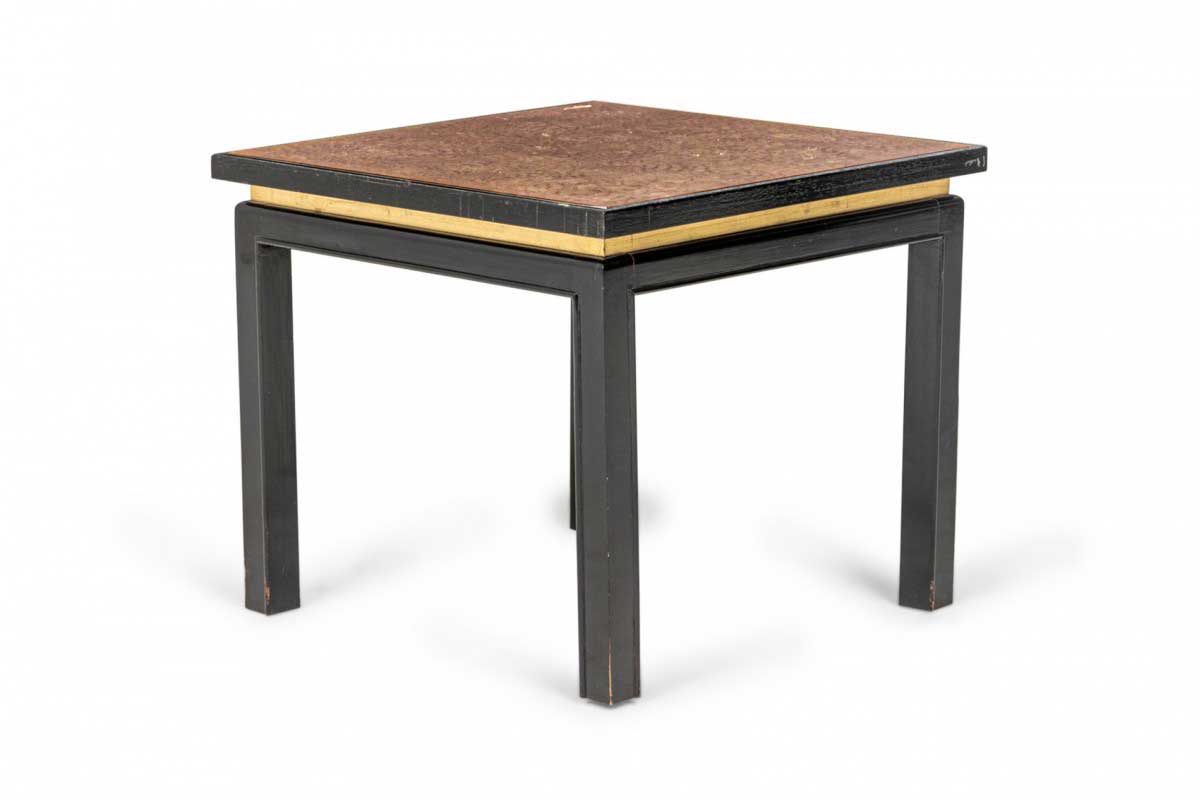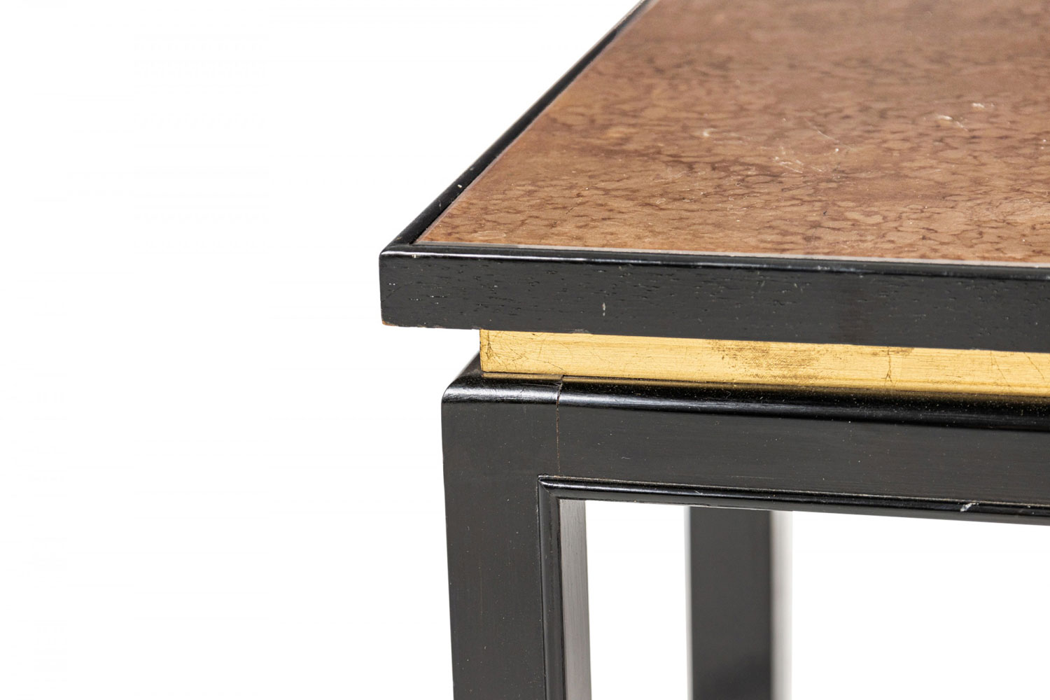 2 American Mid-Century square end / side tables with similar gold leaf tops beneath glass, supported by a square ebonized frame with gilt section between tabletop and legs. (PRICED EACH)