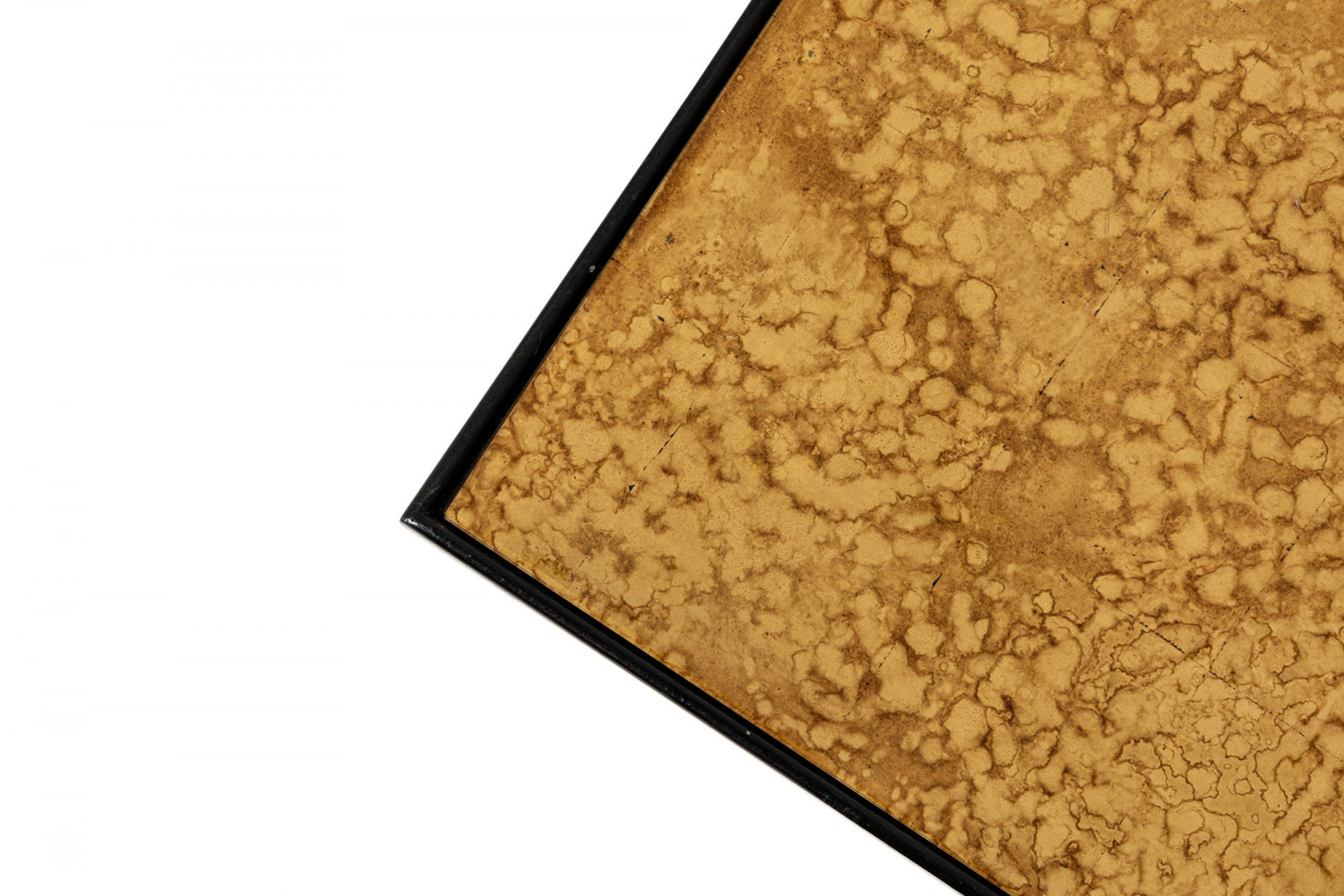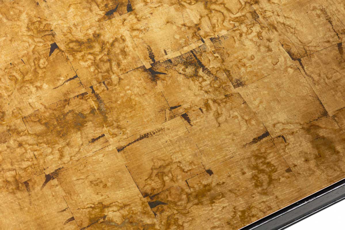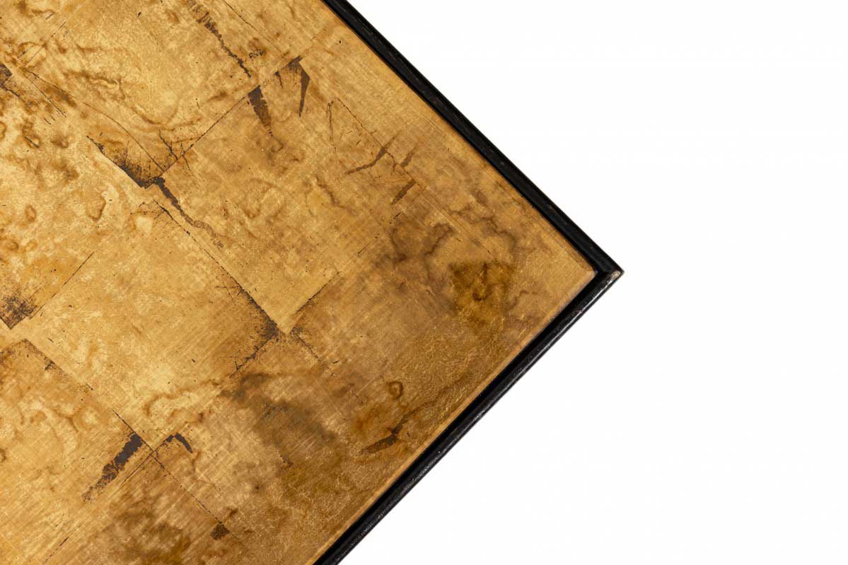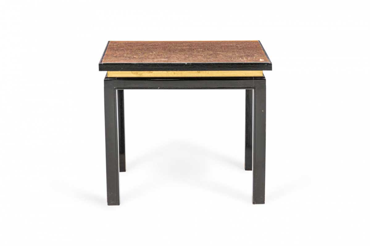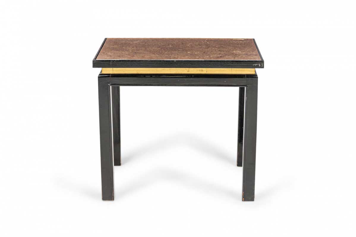 2 American Mid-Century square end / side tables with similar gold leaf tops beneath glass, supported by a square ebonized frame with gilt section between tabletop and legs. (PRICED EACH)