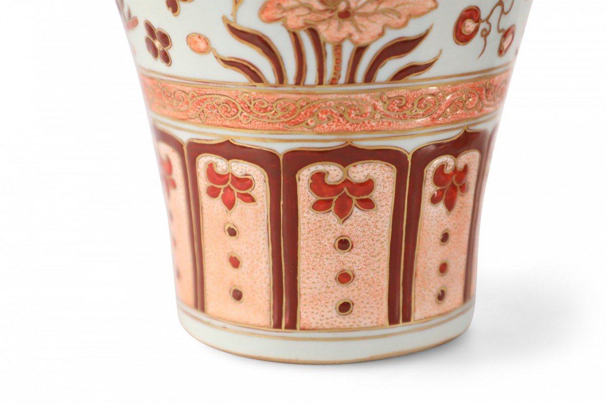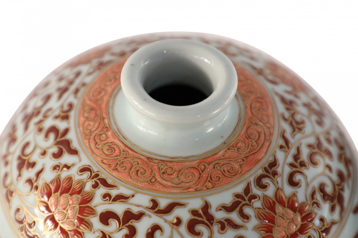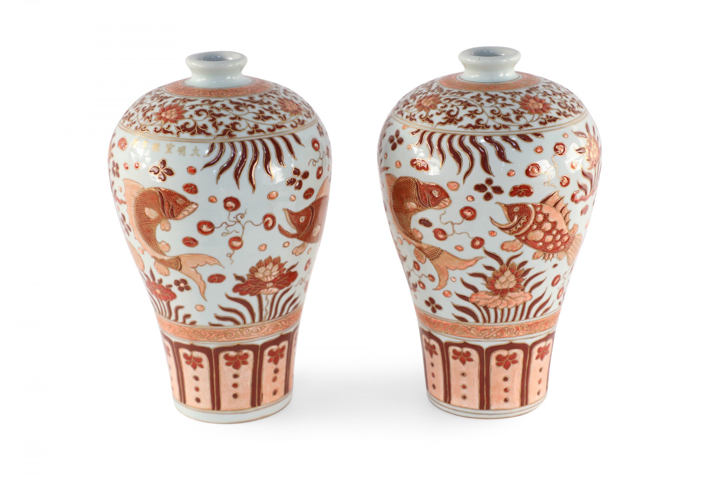 PAIR of Chinese Ming/Jiajing-style beige porcelain vases with Meiping forms decorated in orange fish and flower motifs and geometric-patterned bands around the tops and bases, accented in gold detailing (PRICED AS PAIR).