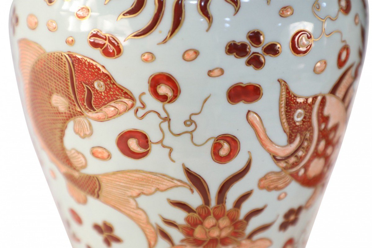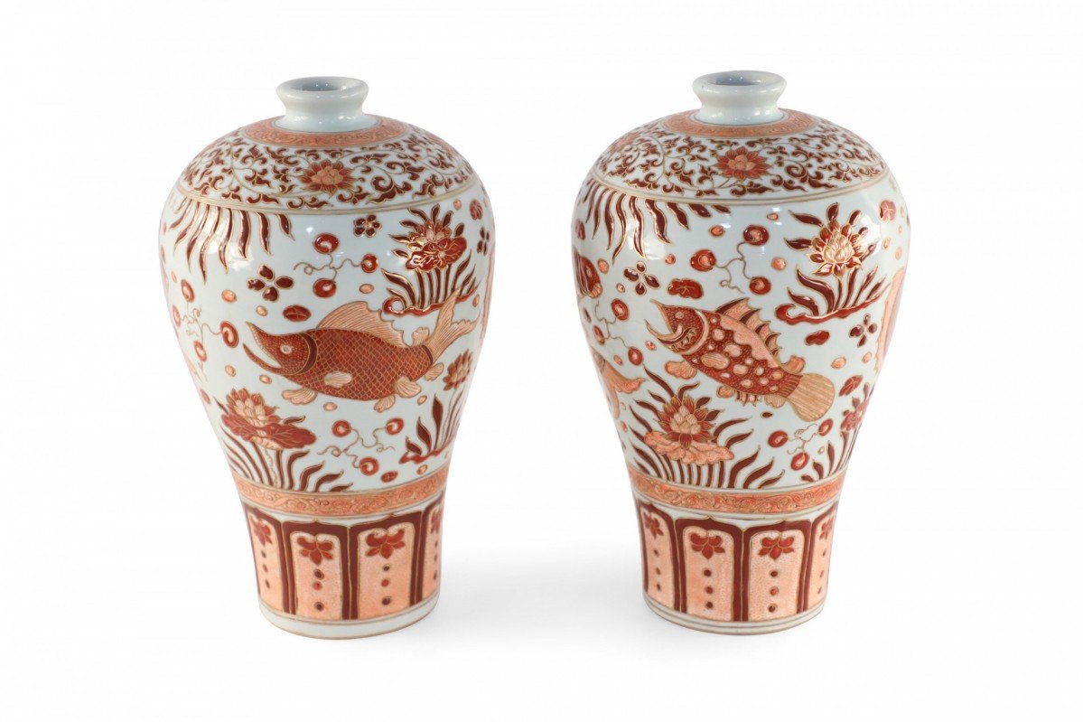 Choose one of the options below.Pair of Chinese Beige and Orange Fish Design Meiping Porcelain Vases