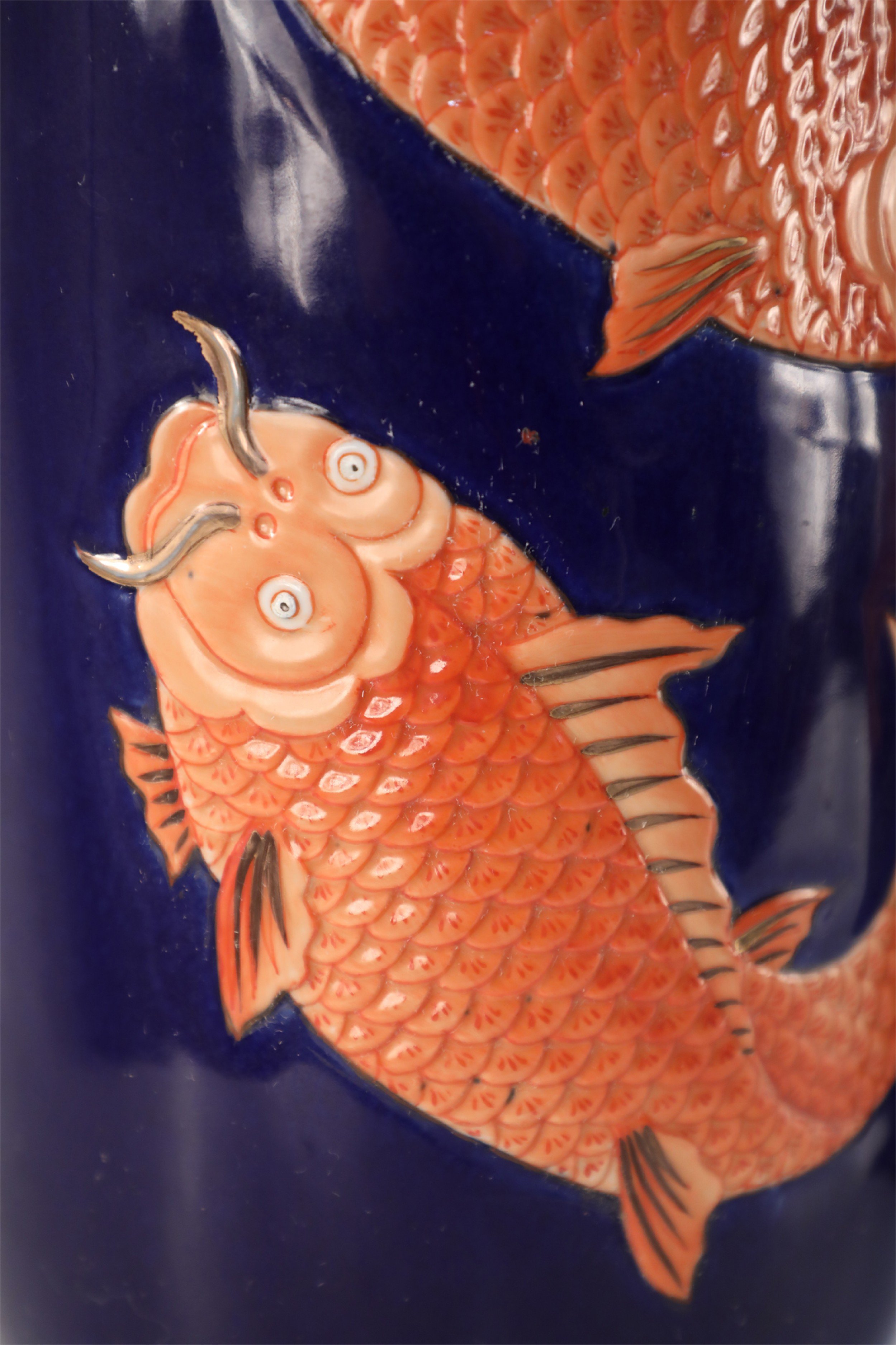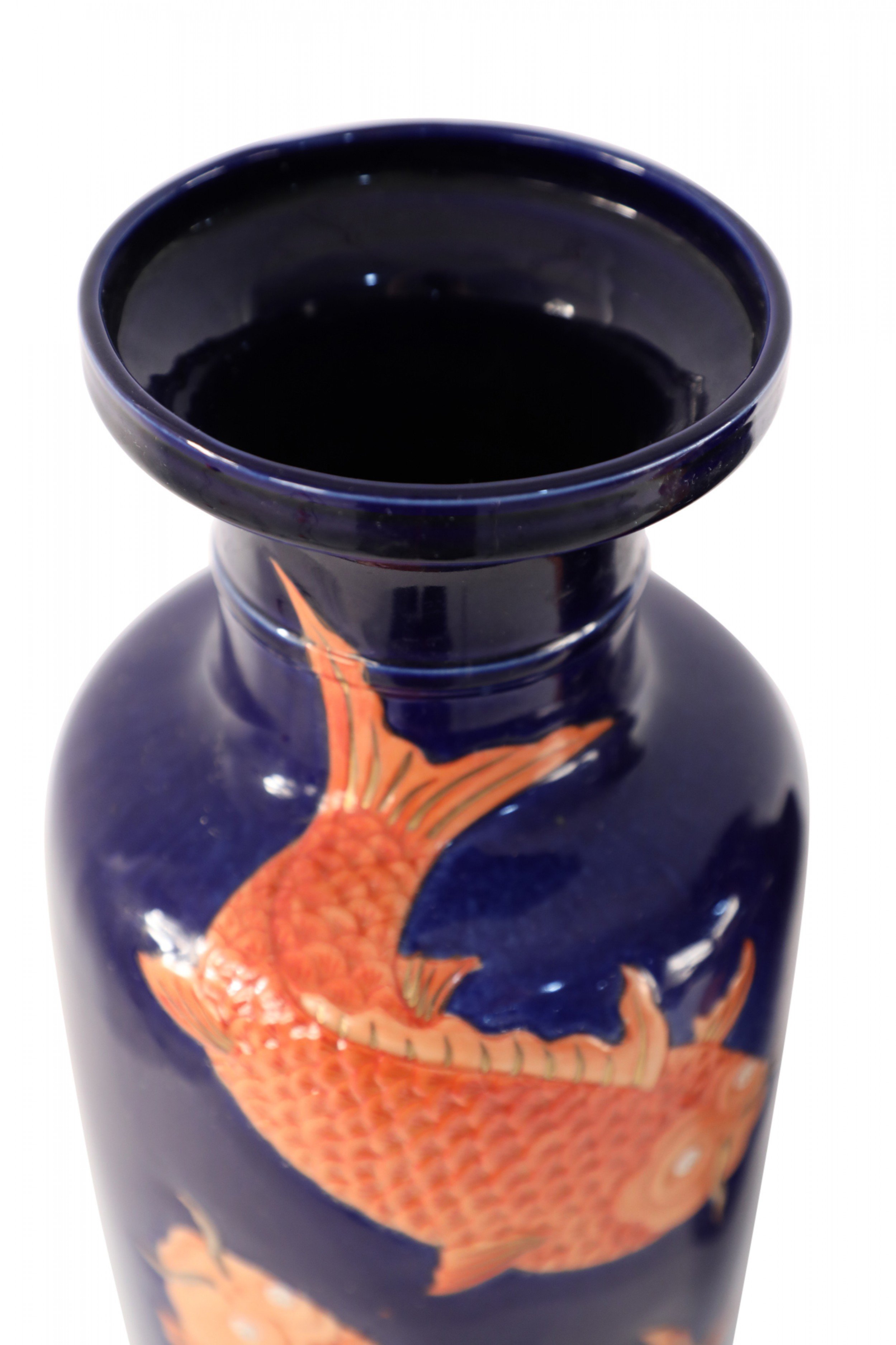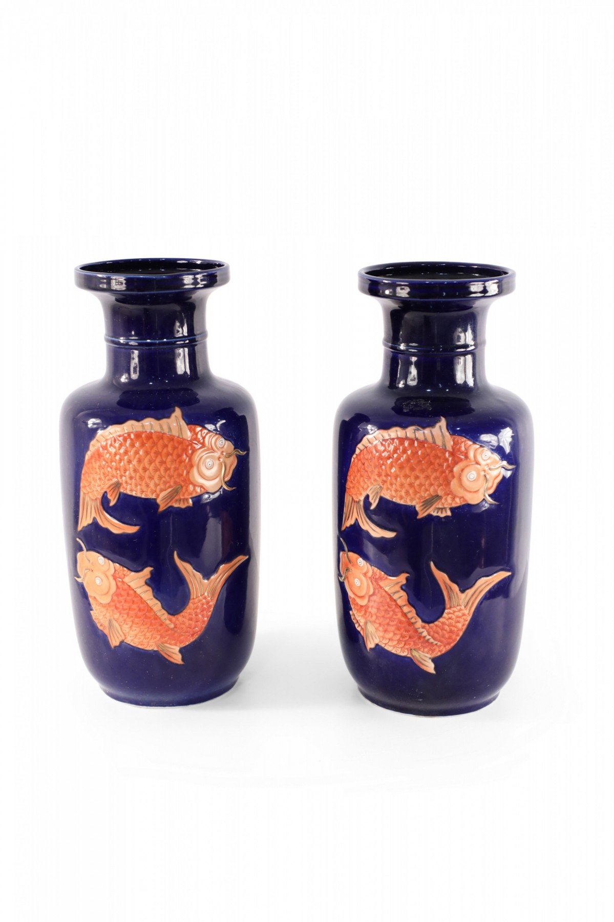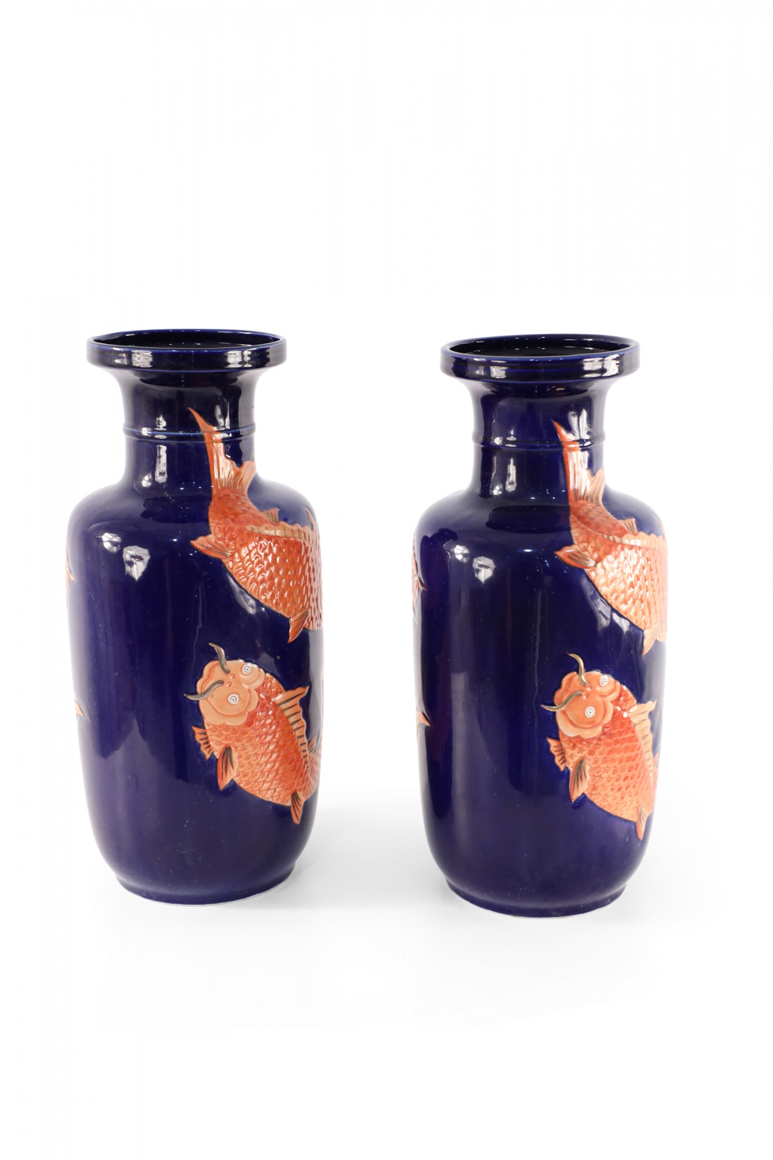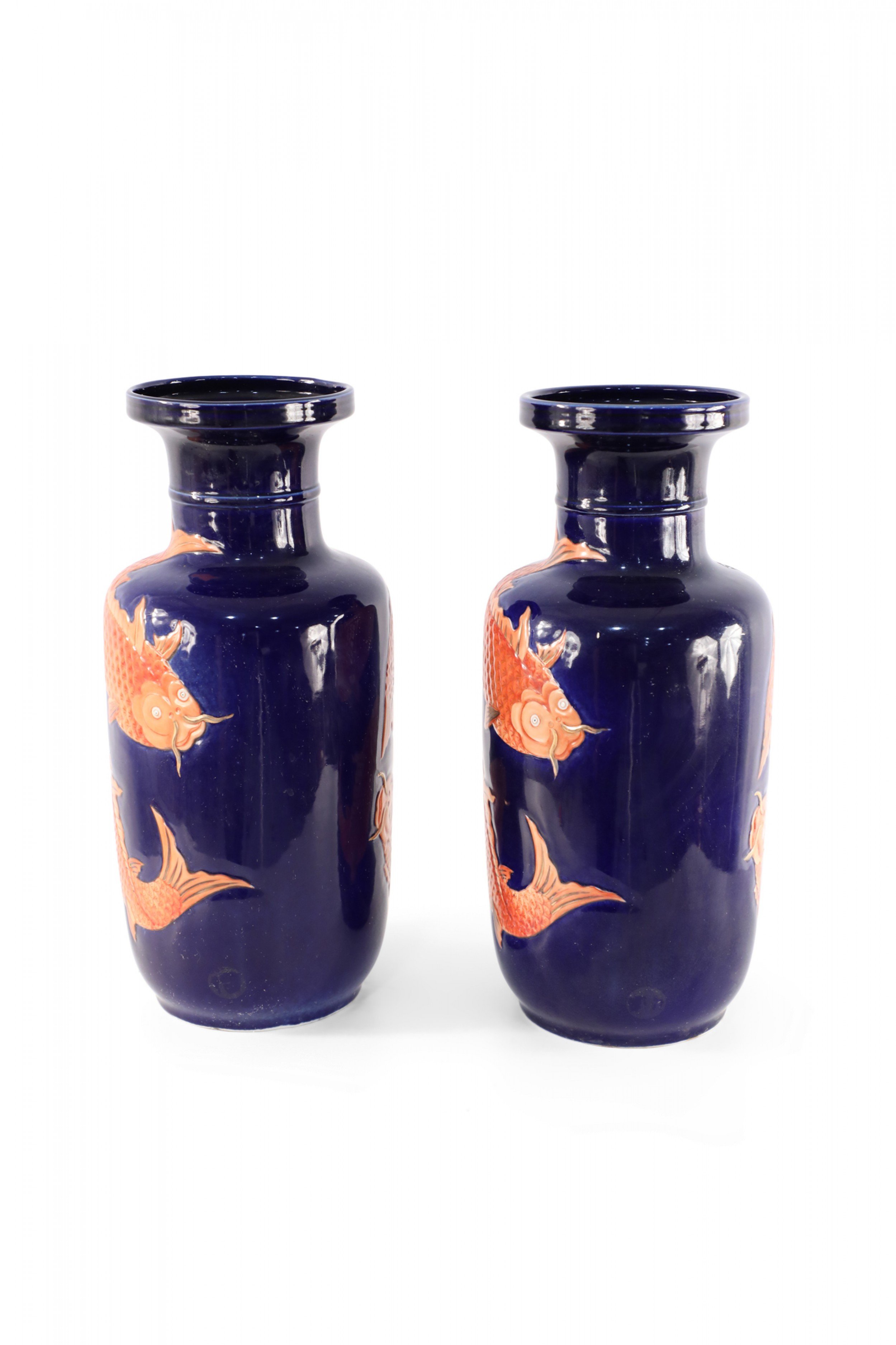 PAIR of Antique Chinese (Mid 20th Century) sleeve-shaped porcelain vases decorated with orange fish swimming around blue backgrounds, inspired by patterns from the Ming Dynasty (PRICED AS PAIR).