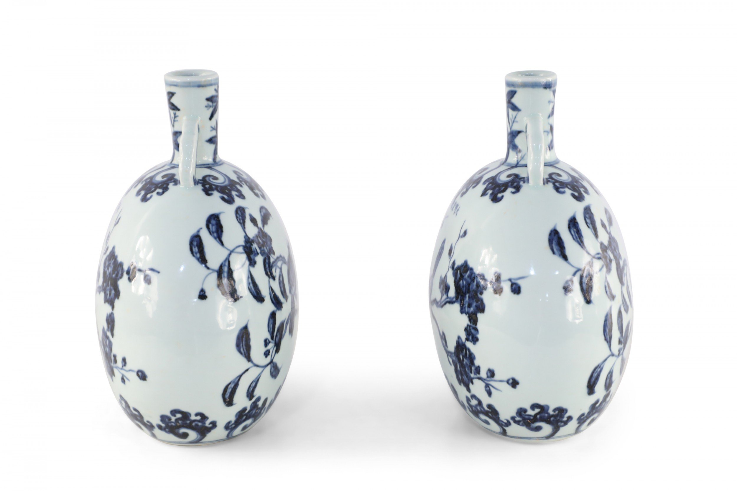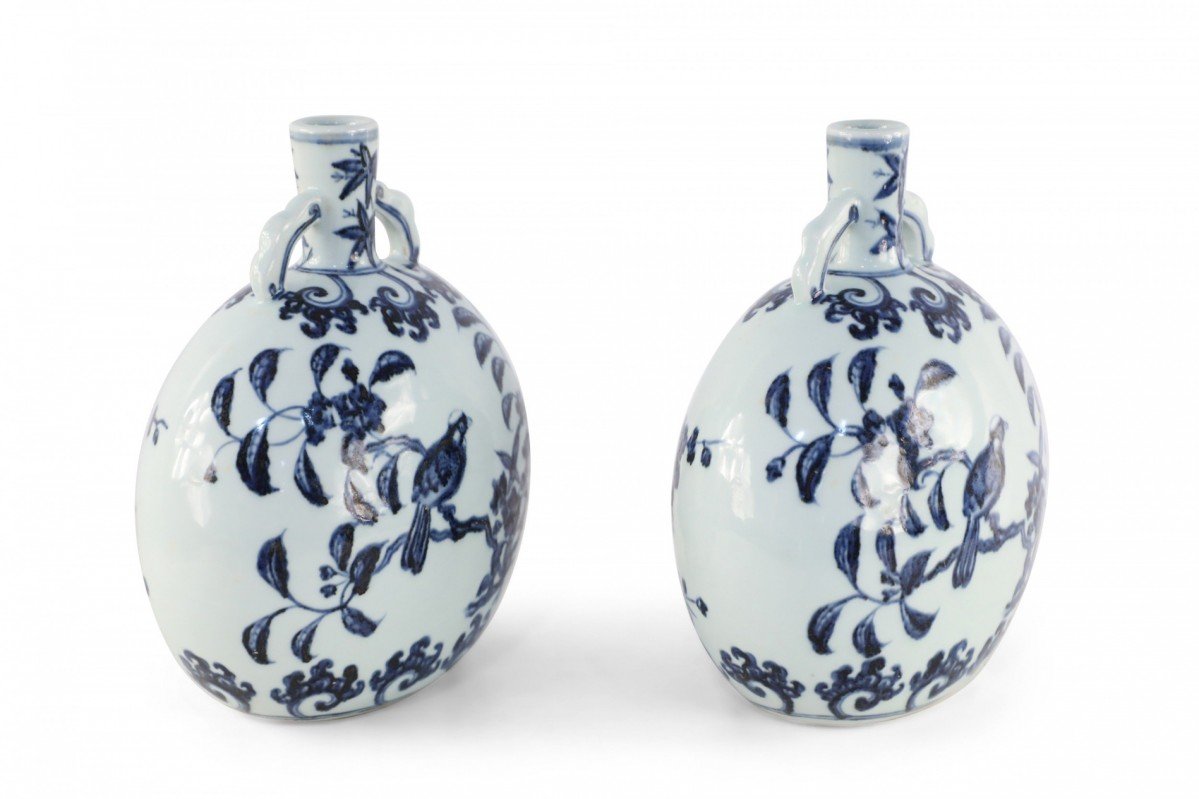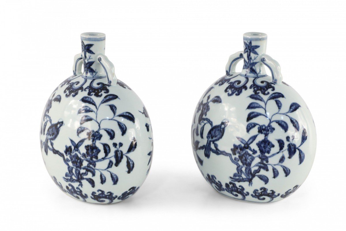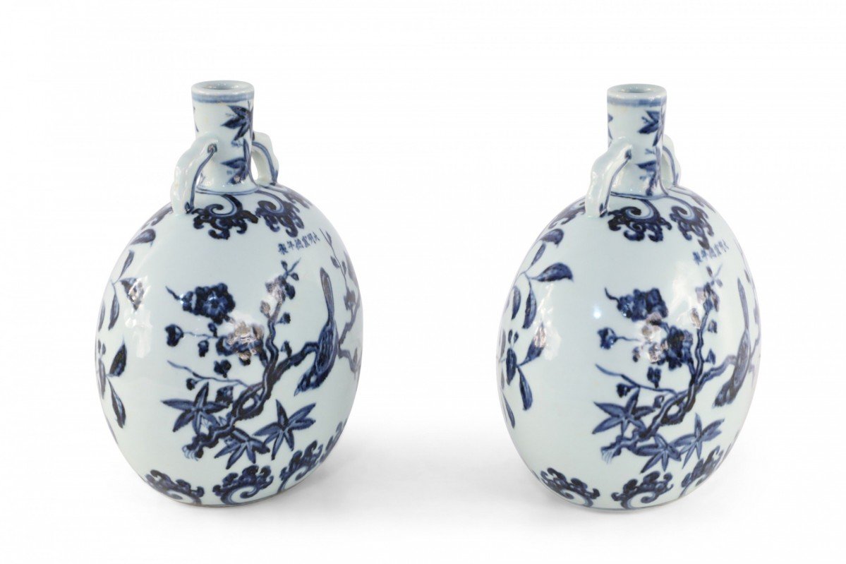 PAIR of Chinese Ming Dynasty Xuande Period-style (late 19th Century) white porcelain vases with moonflask forms, blue floral and bird motifs and marks noting the year of creation (PRICED AS PAIR).