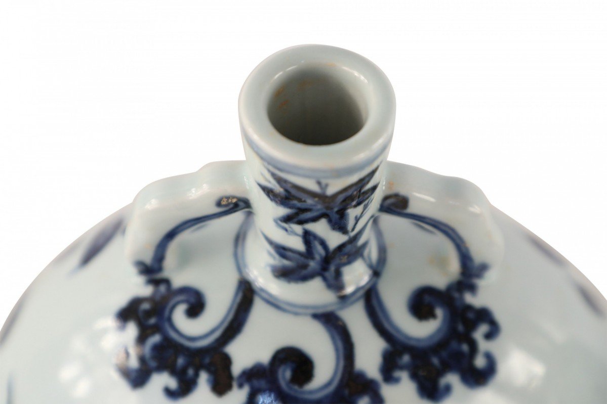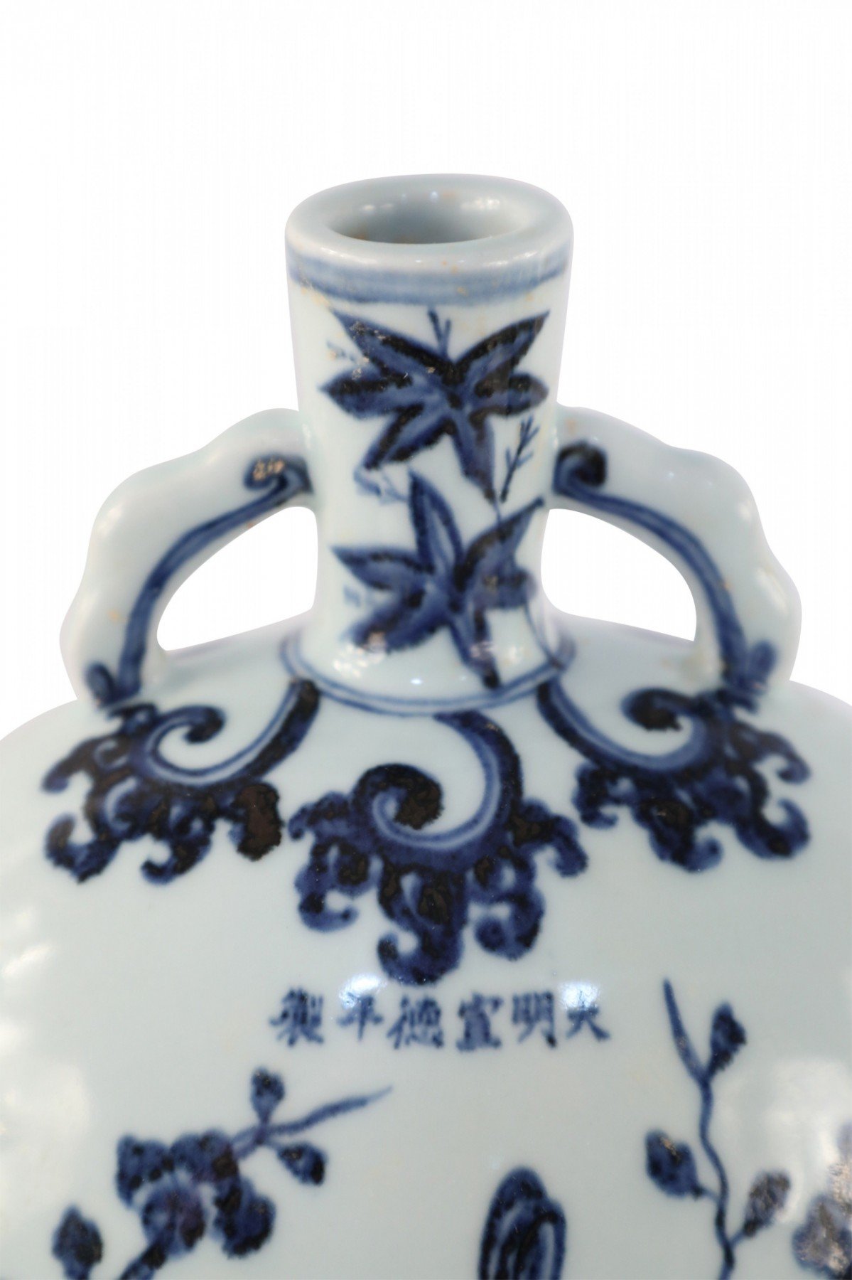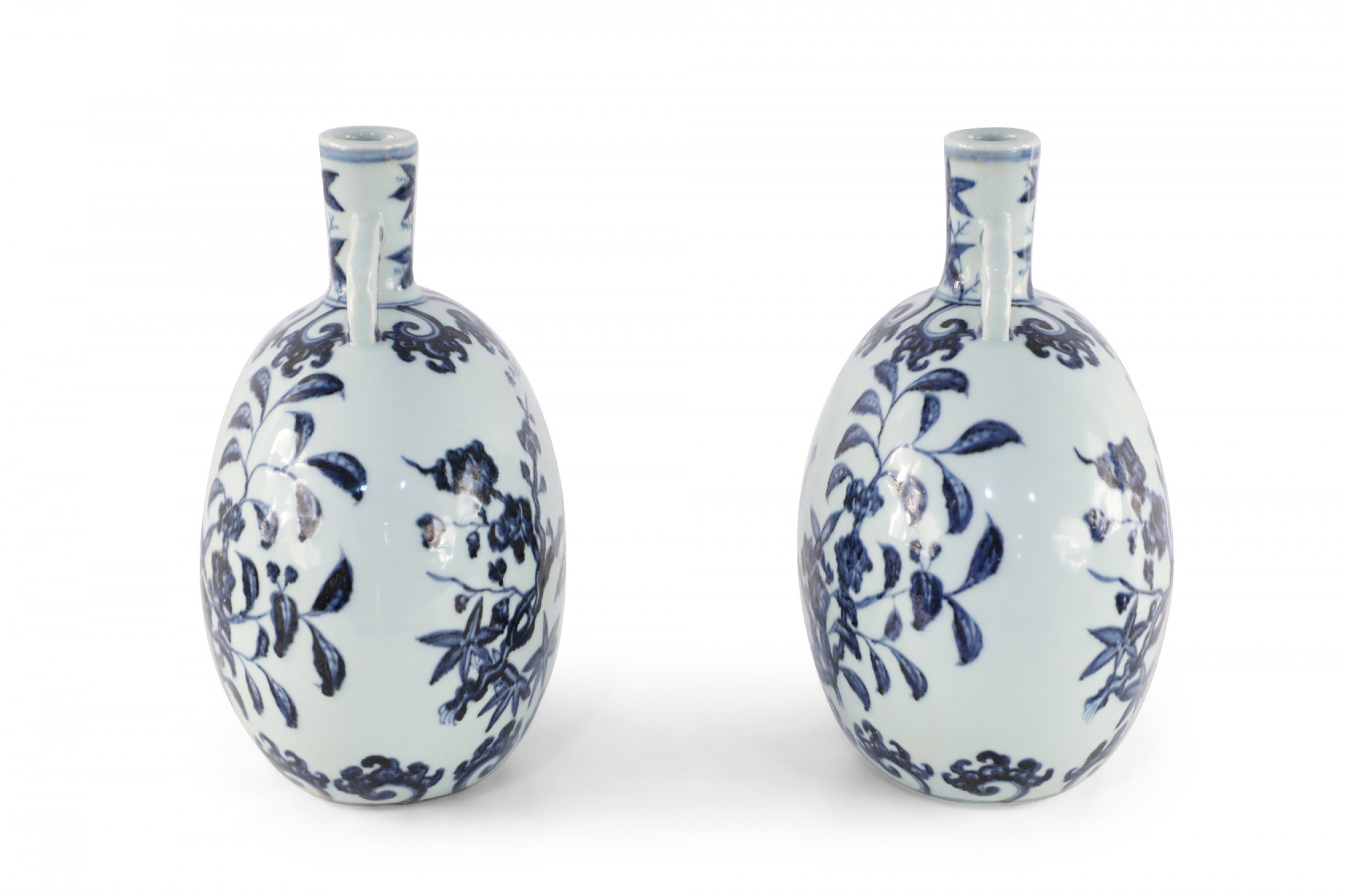 PAIR of Chinese Ming Dynasty Xuande Period-style (late 19th Century) white porcelain vases with moonflask forms, blue floral and bird motifs and marks noting the year of creation (PRICED AS PAIR).