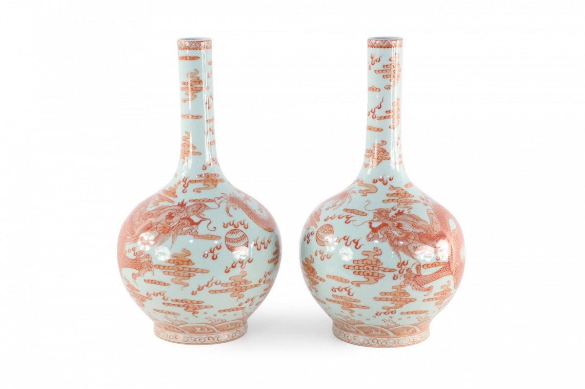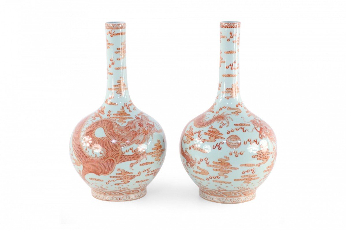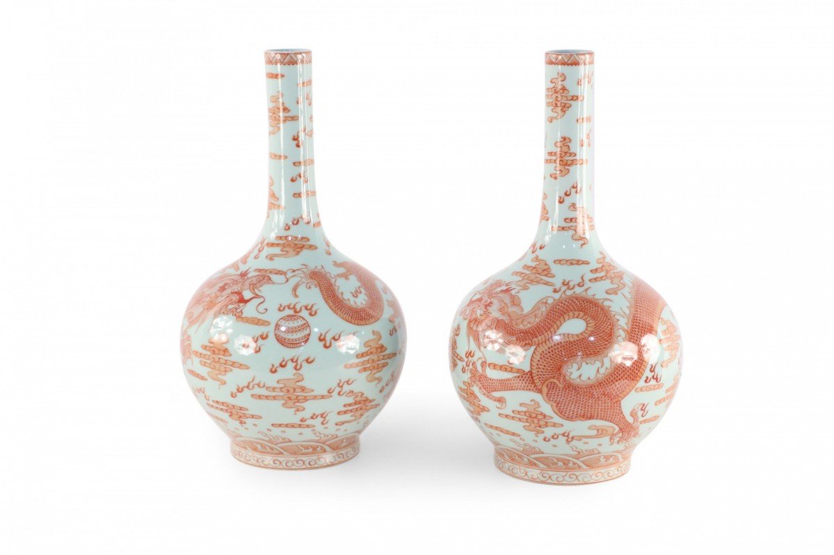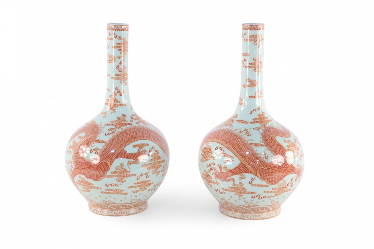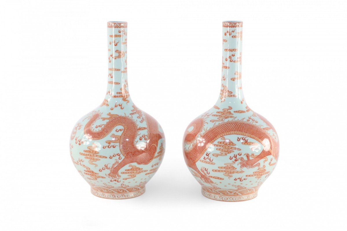 Choose one of the options below.Pair of Chinese Qing Dynasty Style Gray and Alum Red Dragon Motif Porcelain Vases