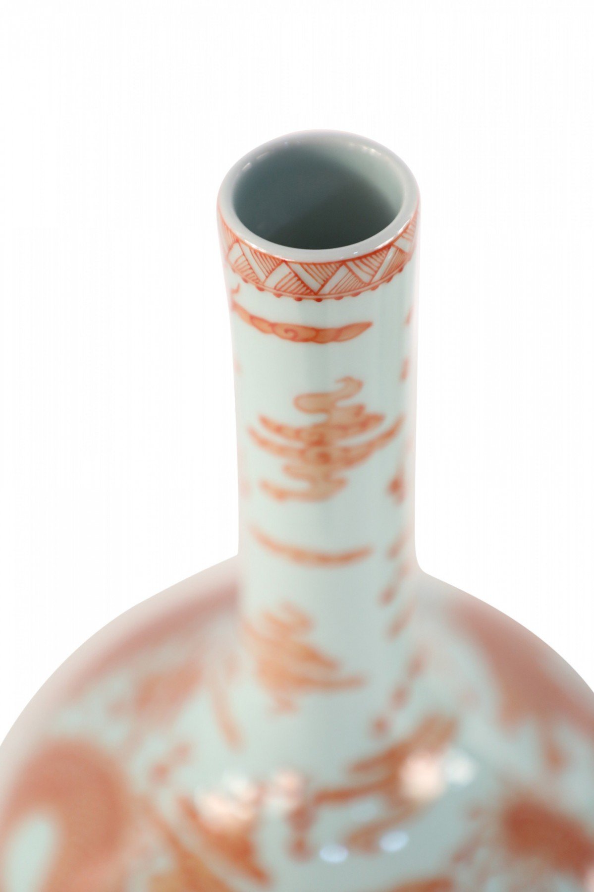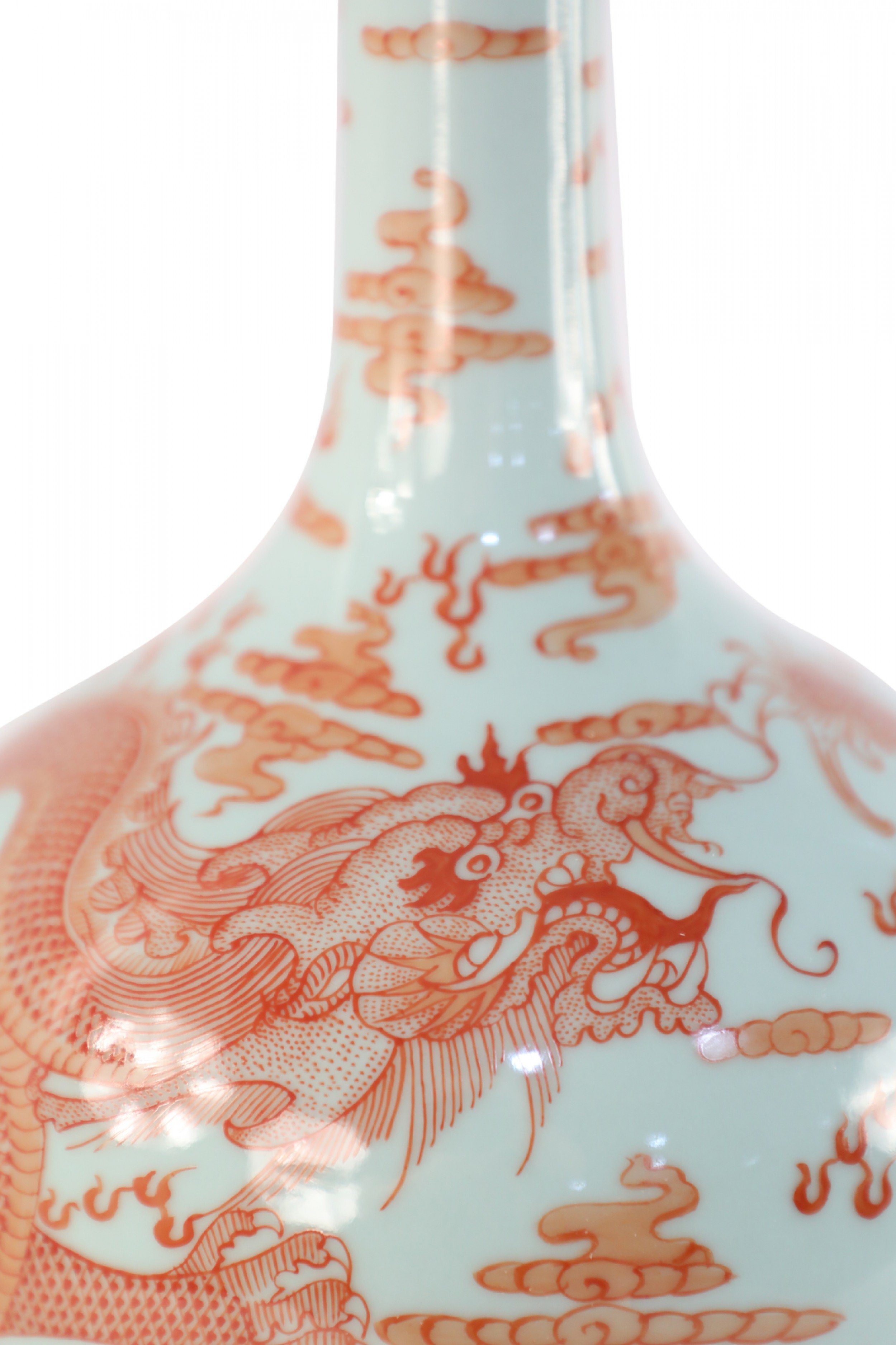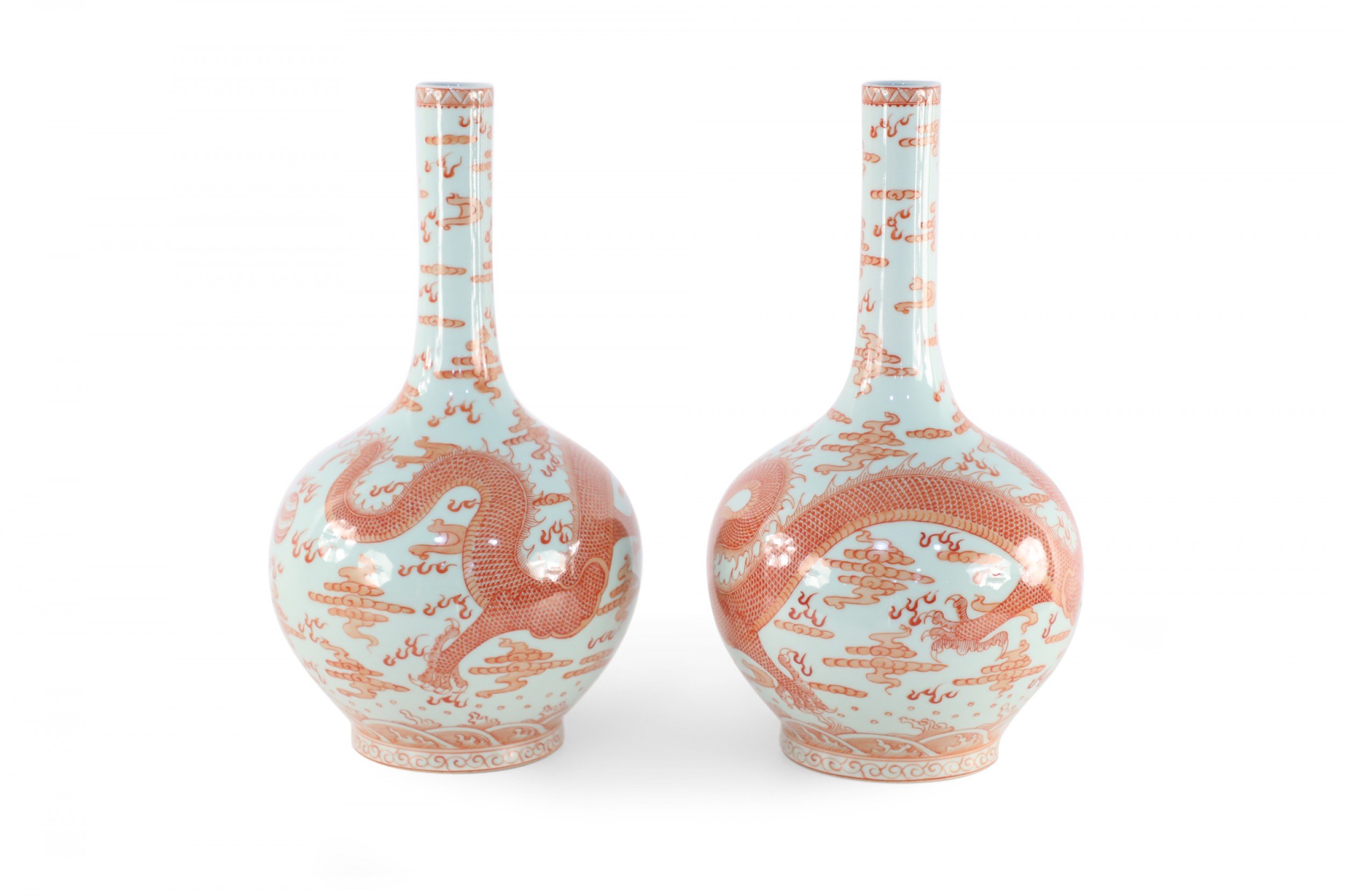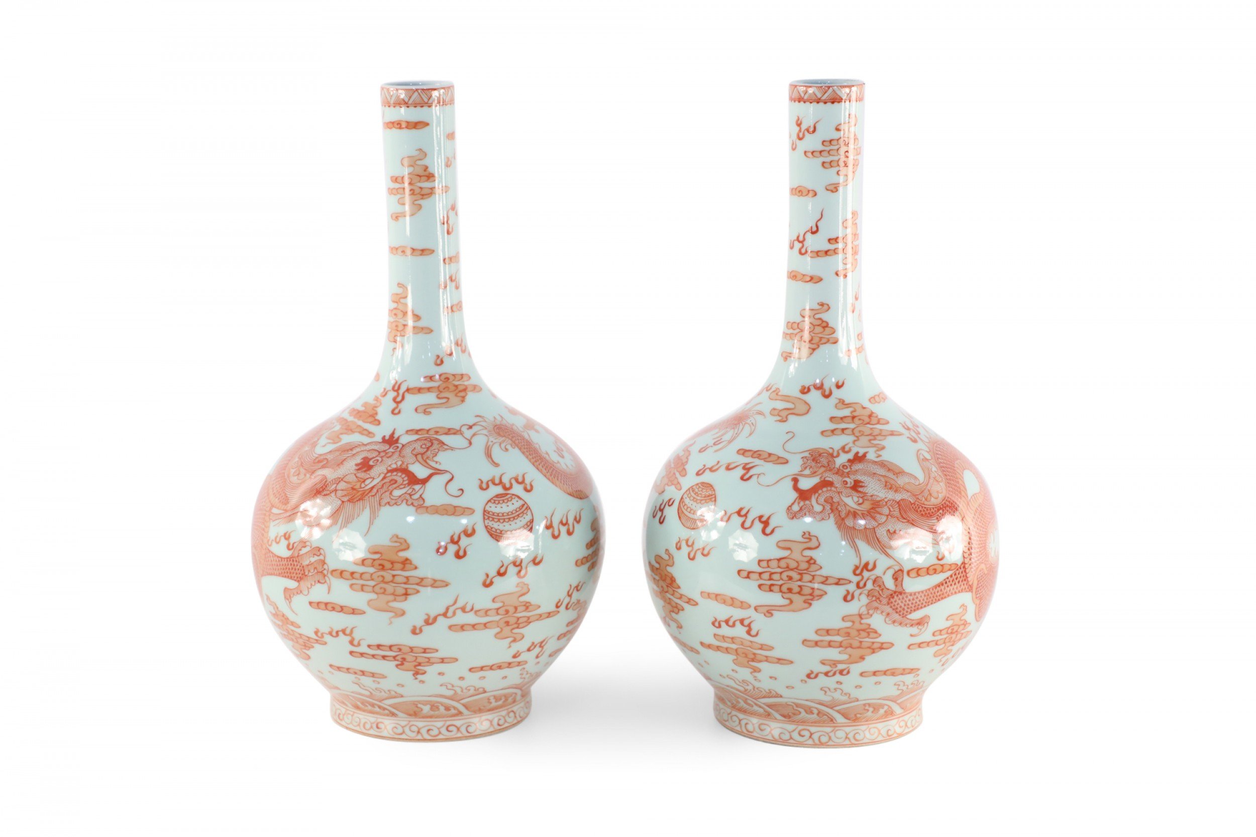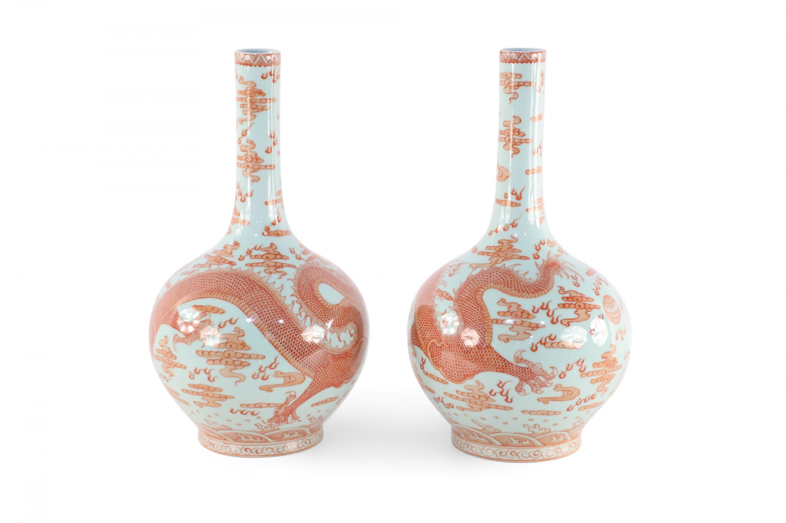 PAIR of Chinese Qing Dynasty Yongzheng Period-style (Mid-20th Century) light gray porcelain vases with globular forms wrapped in alum red glaze dragon motifs (mark on bottoms) (PRICED AS PAIR) (Similar vases: NWL2048)