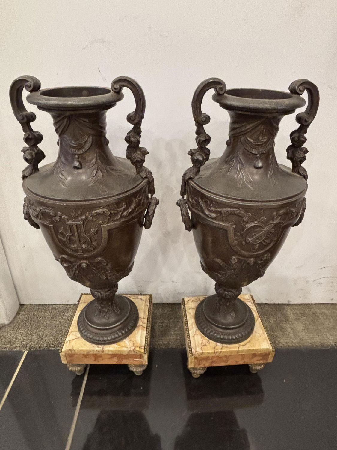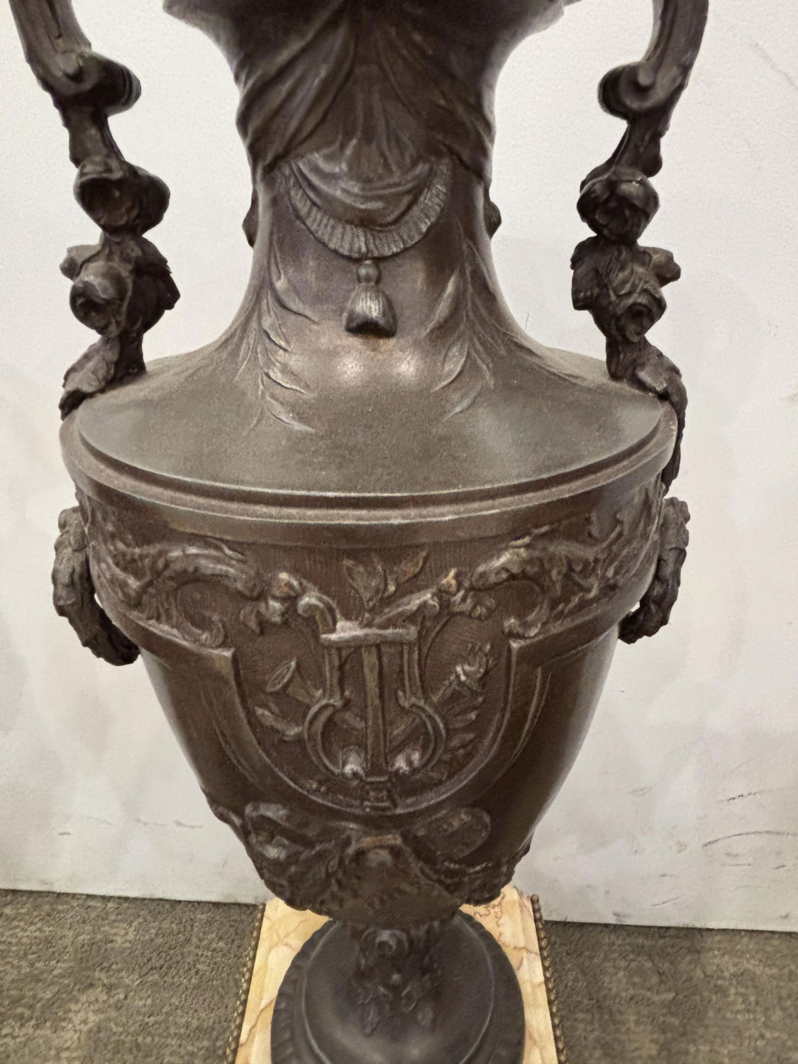 2 French Victorian (late 19th Century) bronze patina metal urns with a relief design having floral handles and raised on a square yellow marble base with metal feet (PRICED EACH)