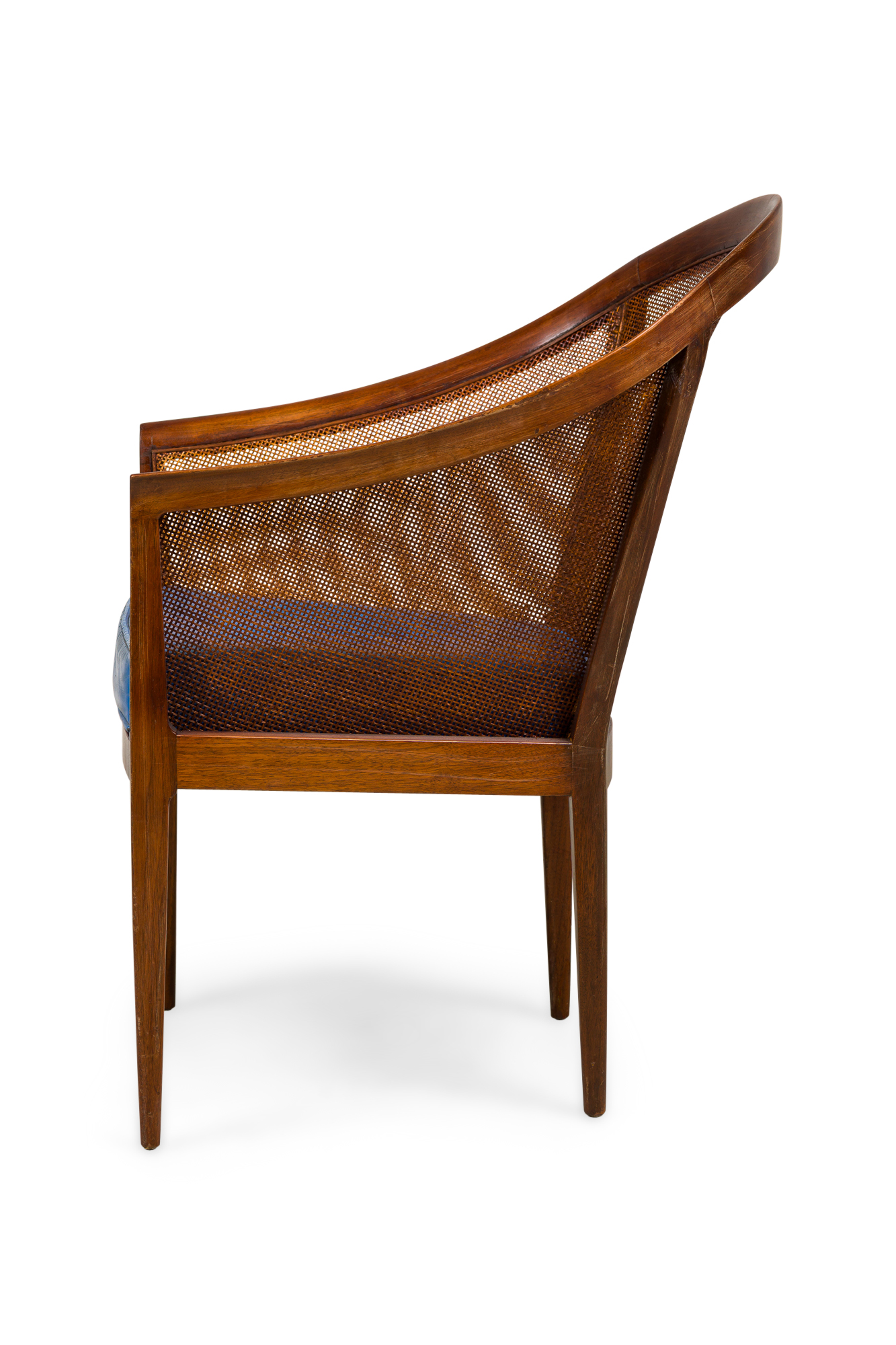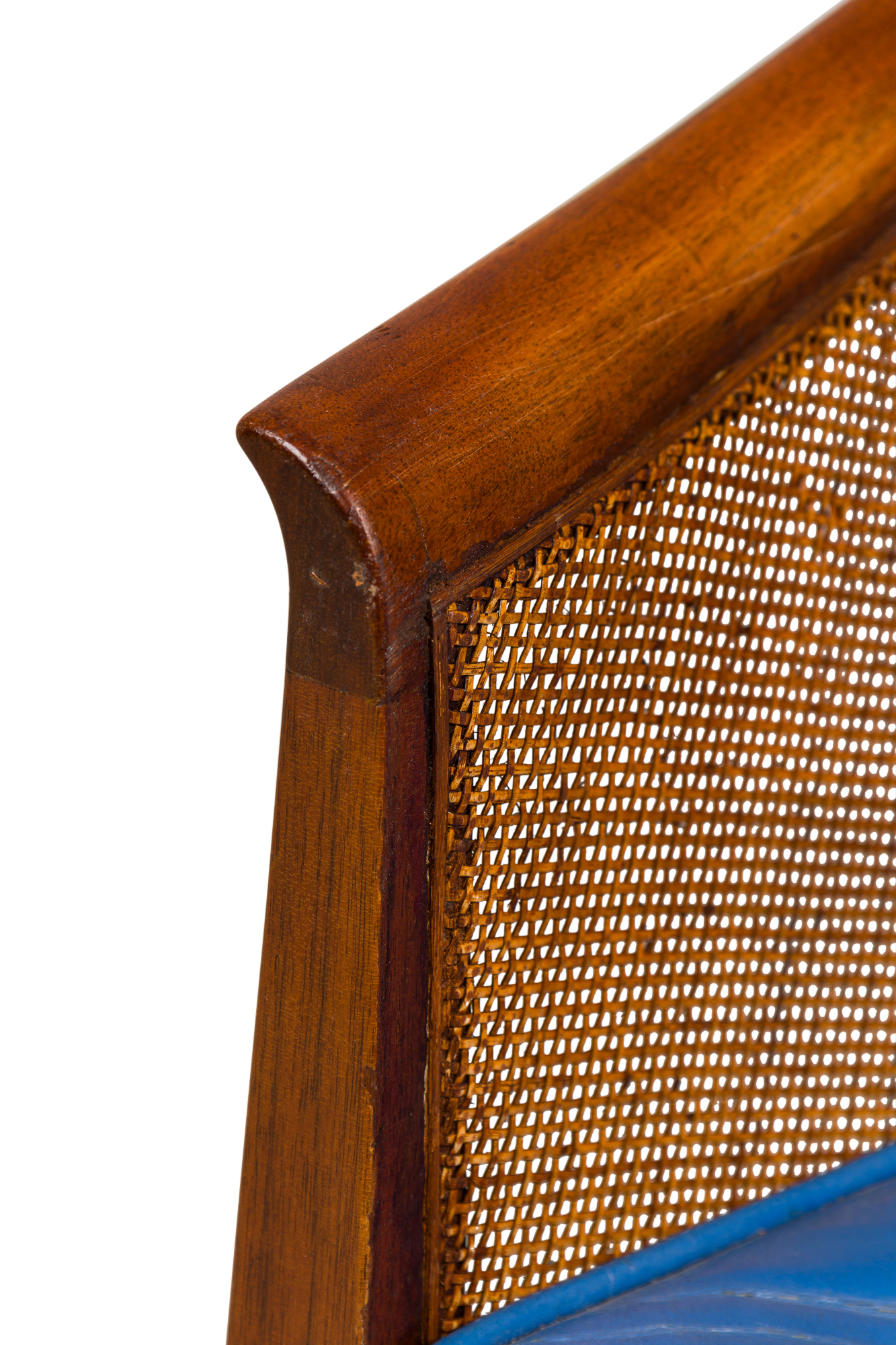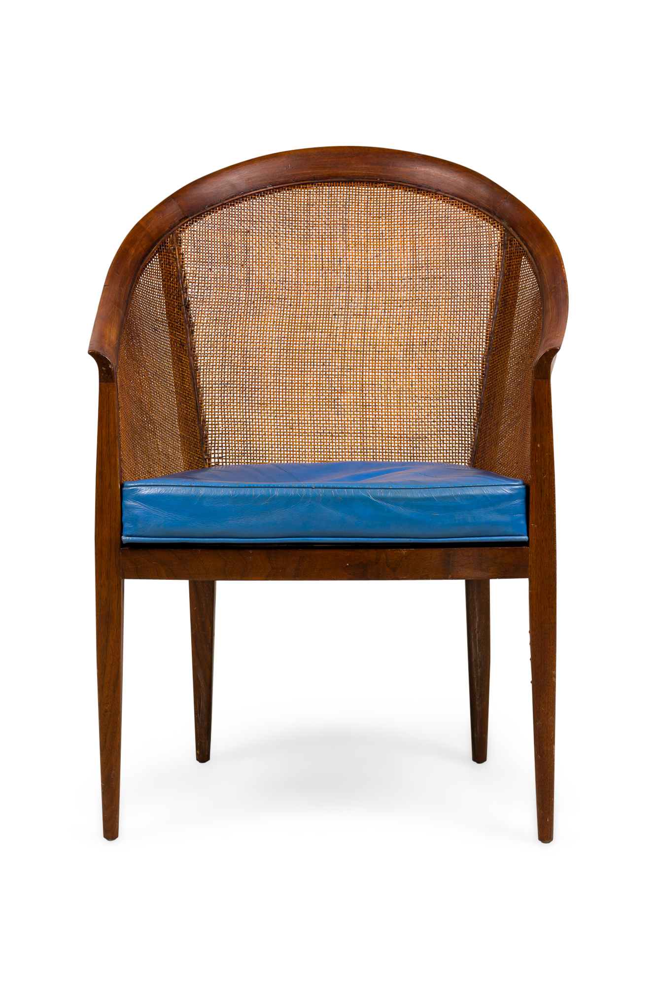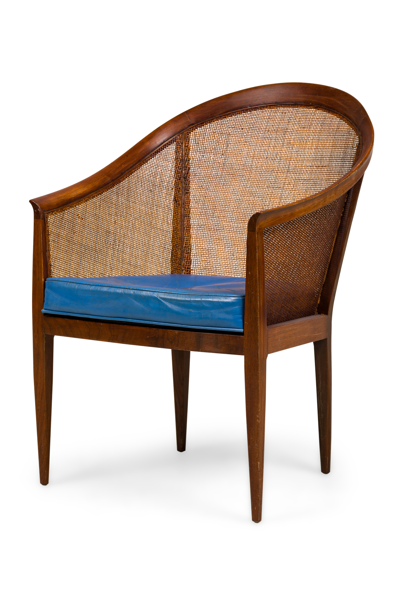 2 American Mid-Century pull up chairs with rounded back walnut frames with caned backs and sides and blue leather seat cushions, resting on four tapered legs. (PRICED EACH)
