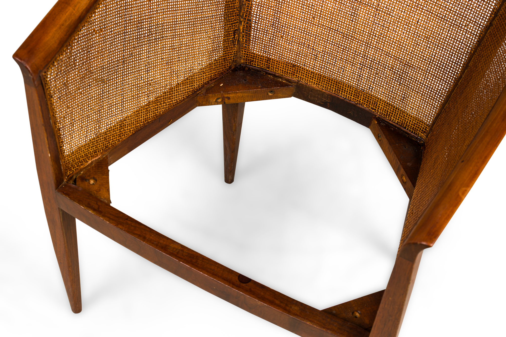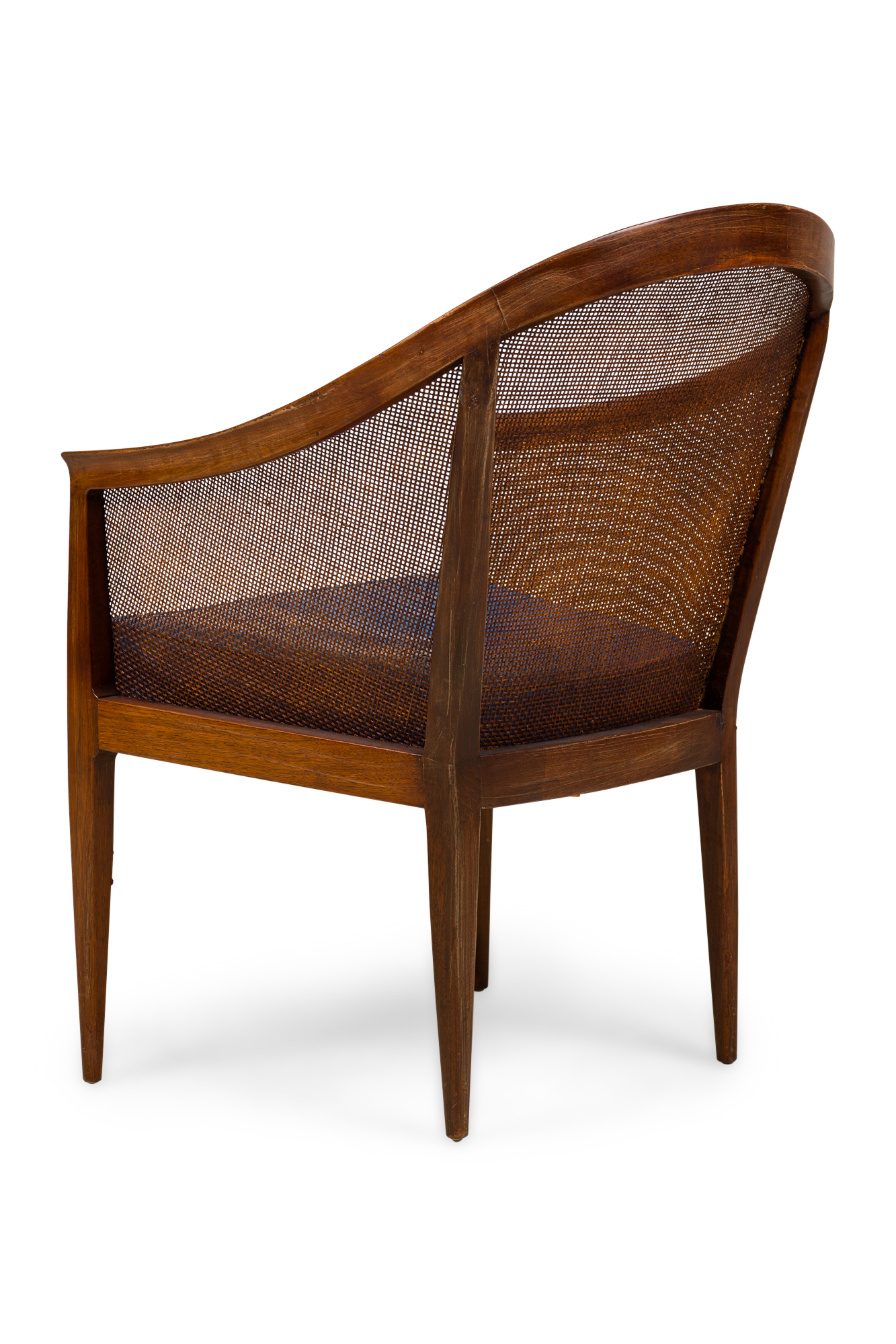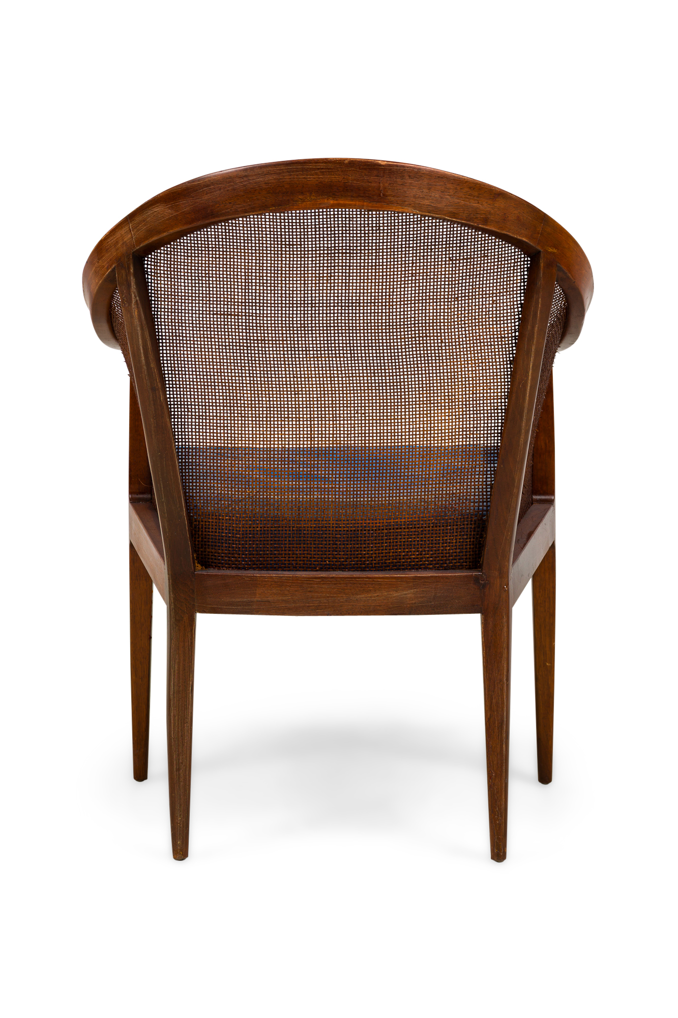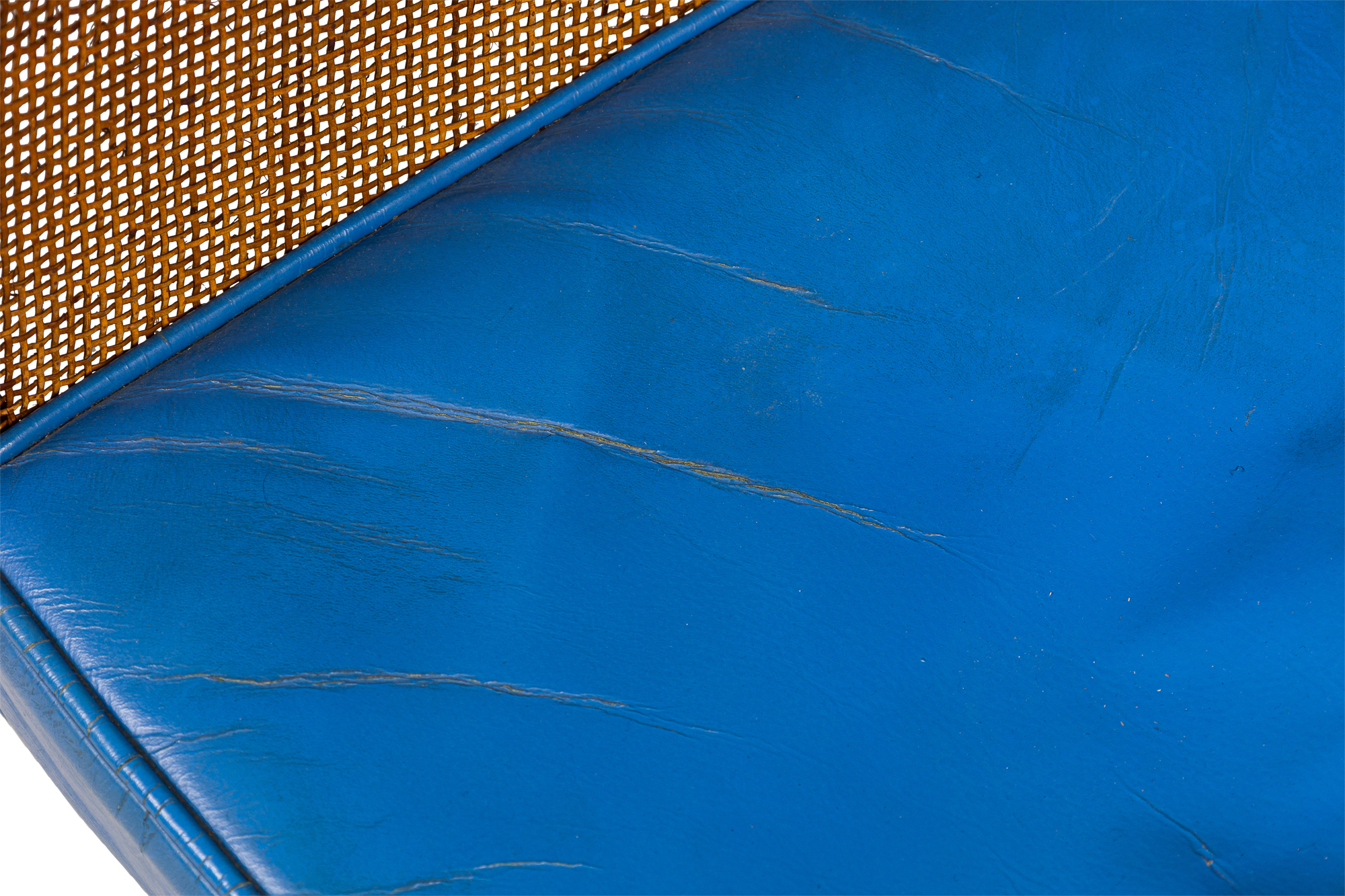 2 American Mid-Century pull up chairs with rounded back walnut frames with caned backs and sides and blue leather seat cushions, resting on four tapered legs. (PRICED EACH)