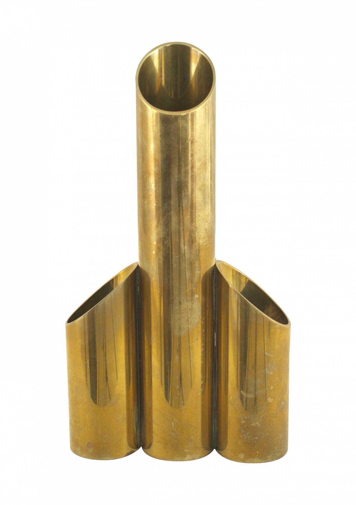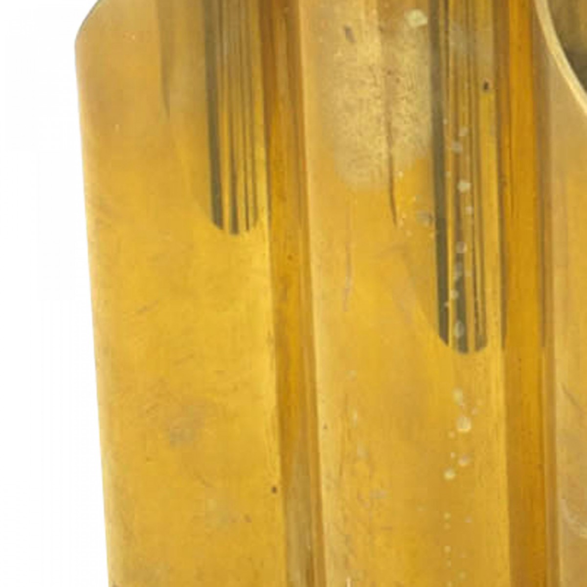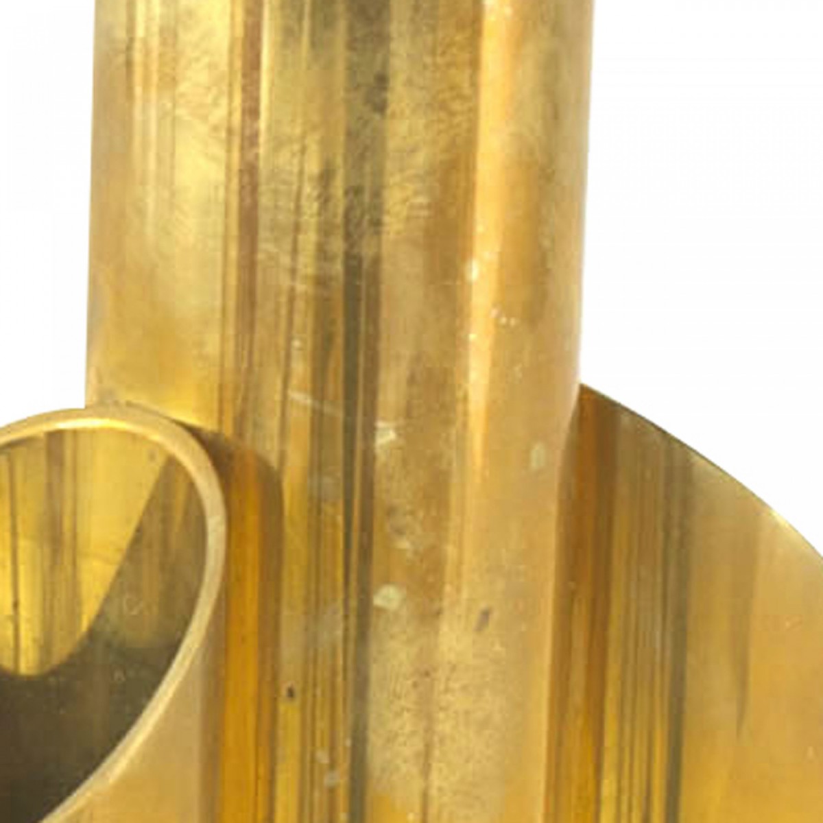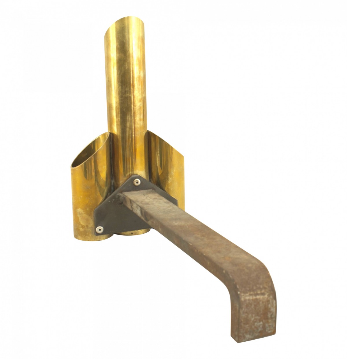 PAIR of French Post-War Design brass andirons with a center tall cylinder surrounded by 2 smaller cylinders. (PRICED AS PAIR)