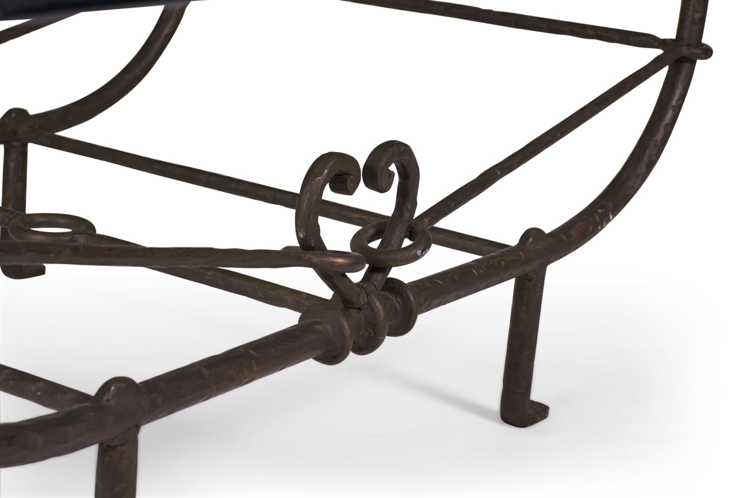 American Etruscan (circa 1980) forged and hammered iron frame coffee table with a stretcher base and curved arms that rise to support a plate glass table top.