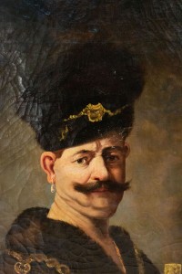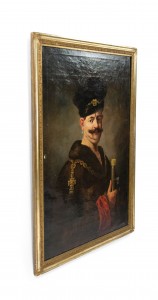 Gilt framed oil painting portrait of nobleman (possibly Polish) wearing furs and pearl earring and holding scepter (19th Cent copy of a Rembrandt)
