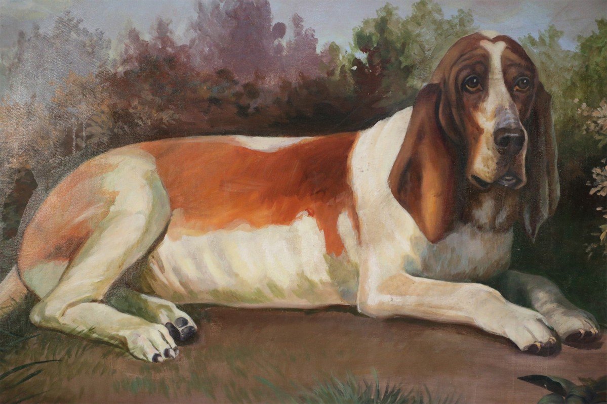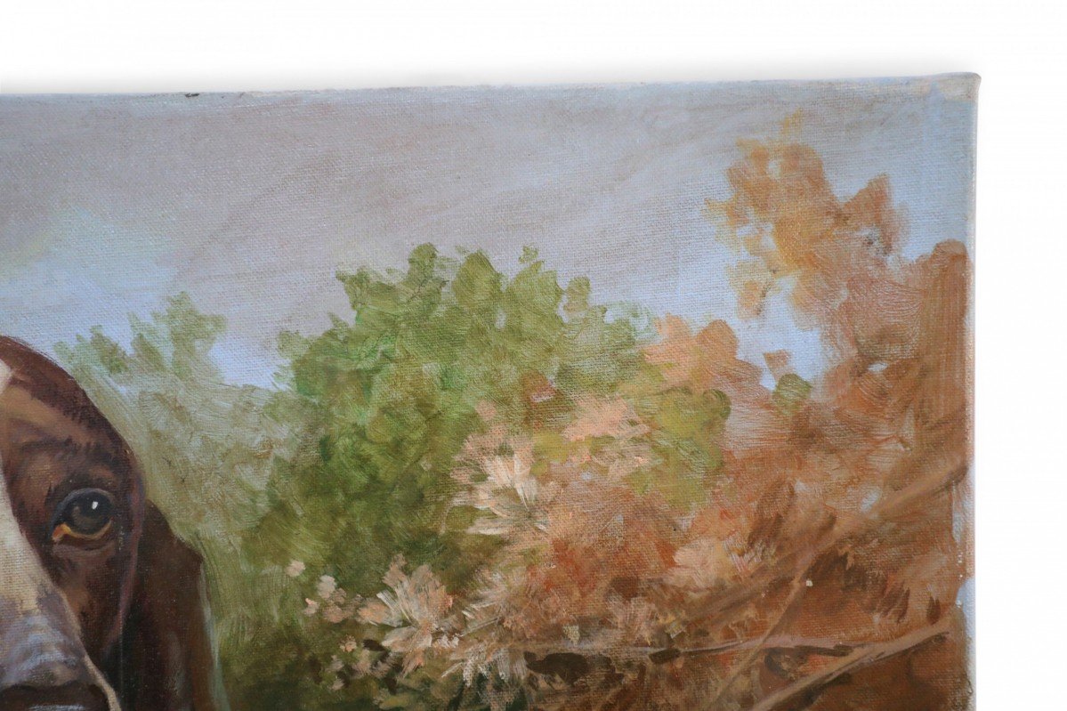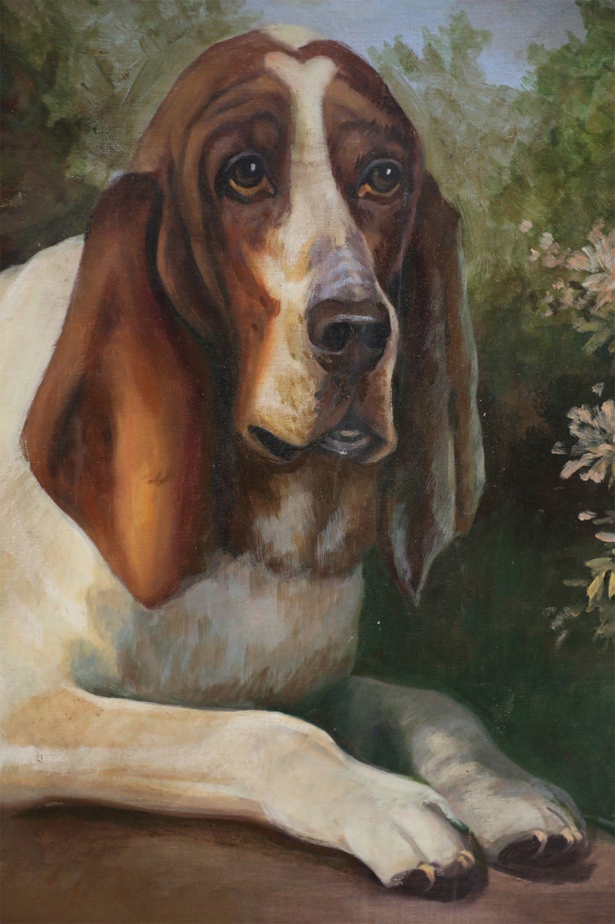 English Victorian style portrait of a brown and white basset hound captured on a path amid grasses and autumnal plants and trees, on a large rectangular unframed canvas (Similar copies with slight variations: NWL2274B, NWL2274C).