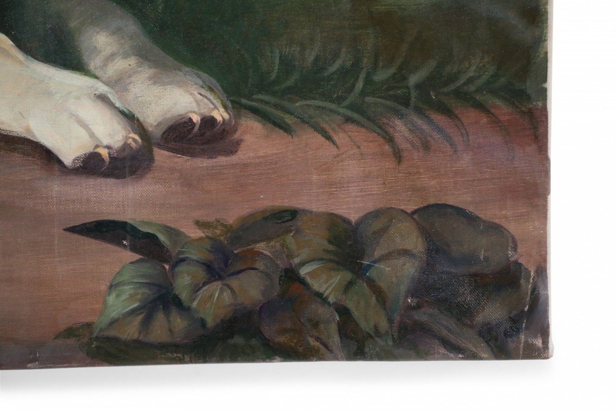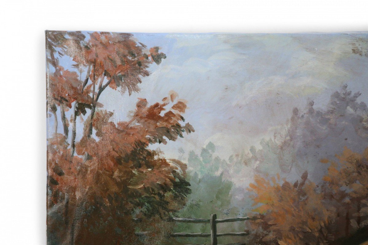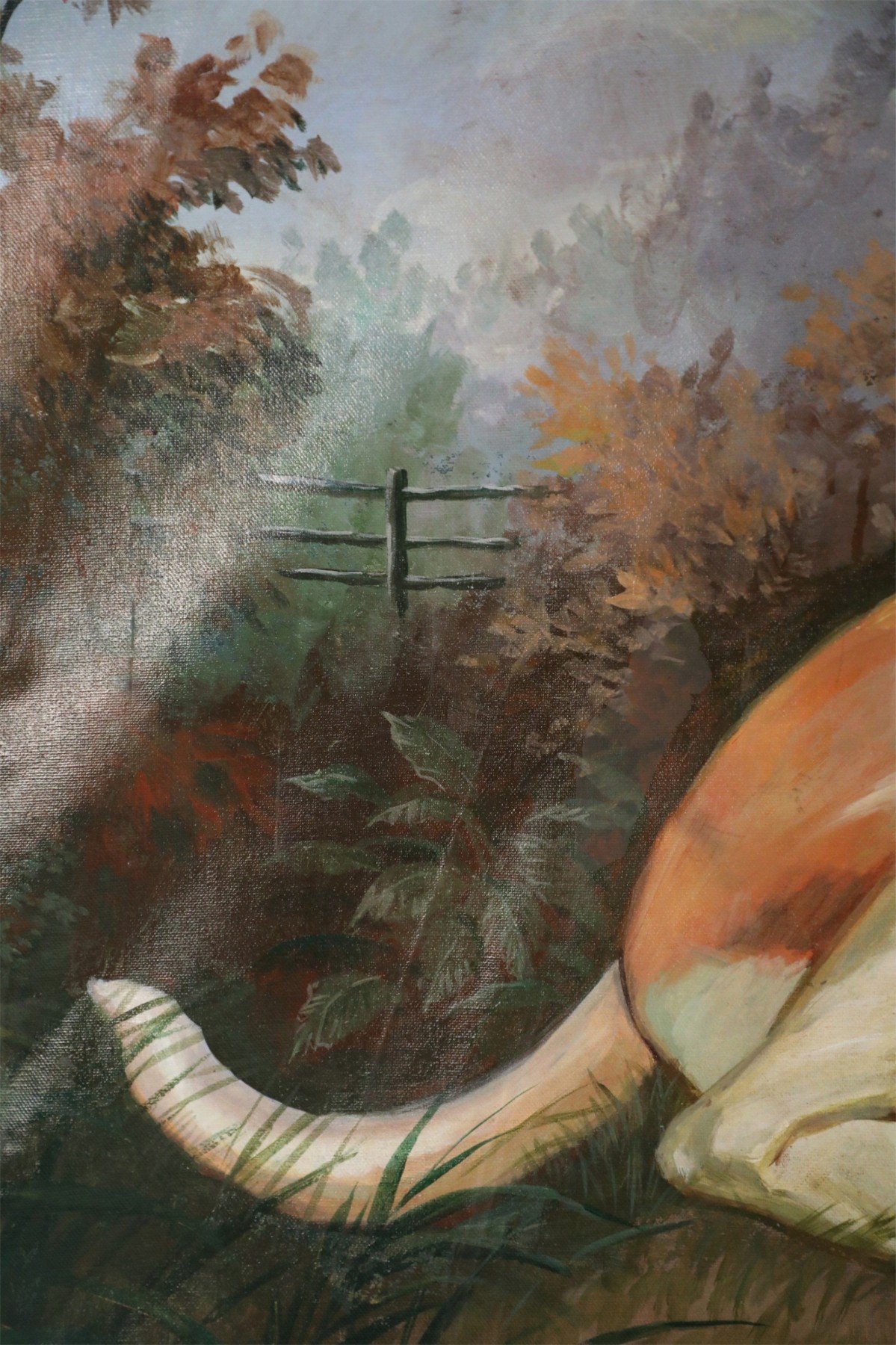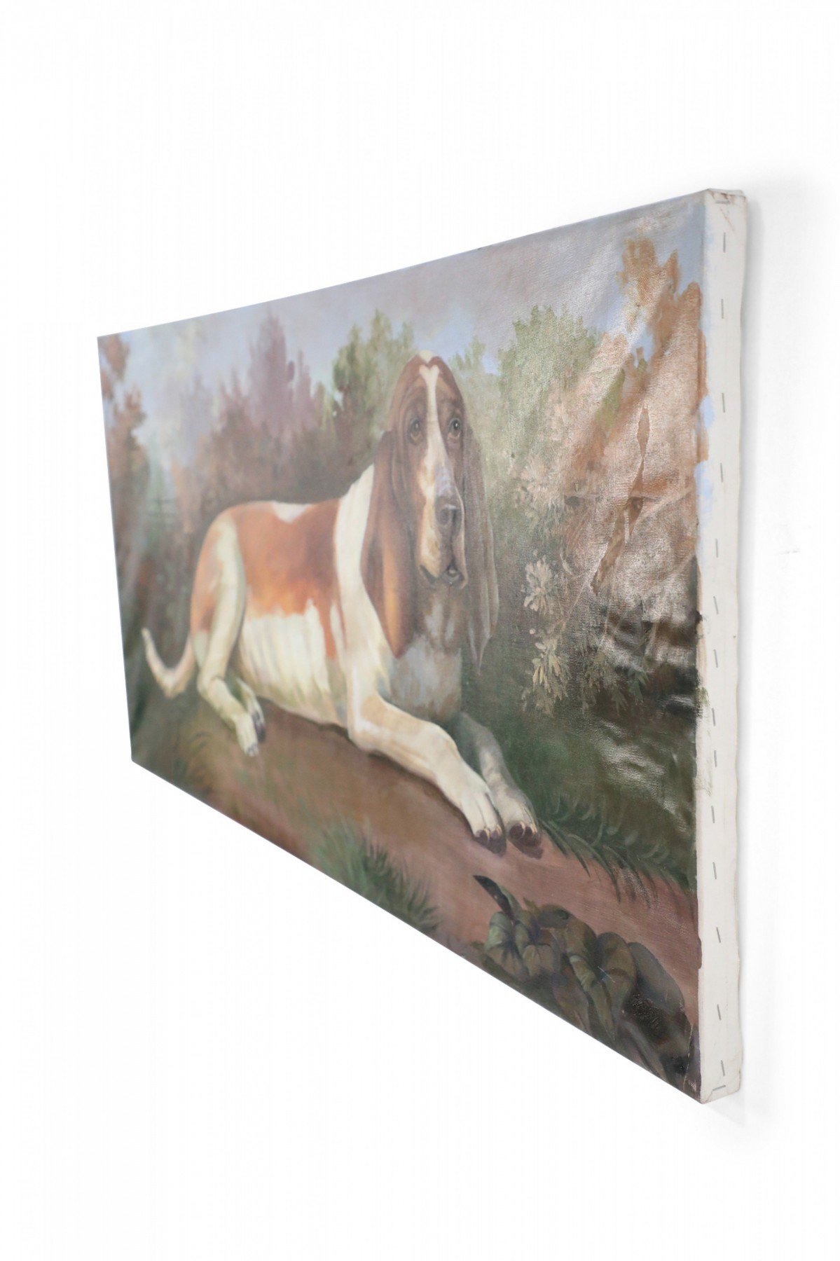 English Victorian style portrait of a brown and white basset hound captured on a path amid grasses and autumnal plants and trees, on a large rectangular unframed canvas (Similar copies with slight variations: NWL2274B, NWL2274C).