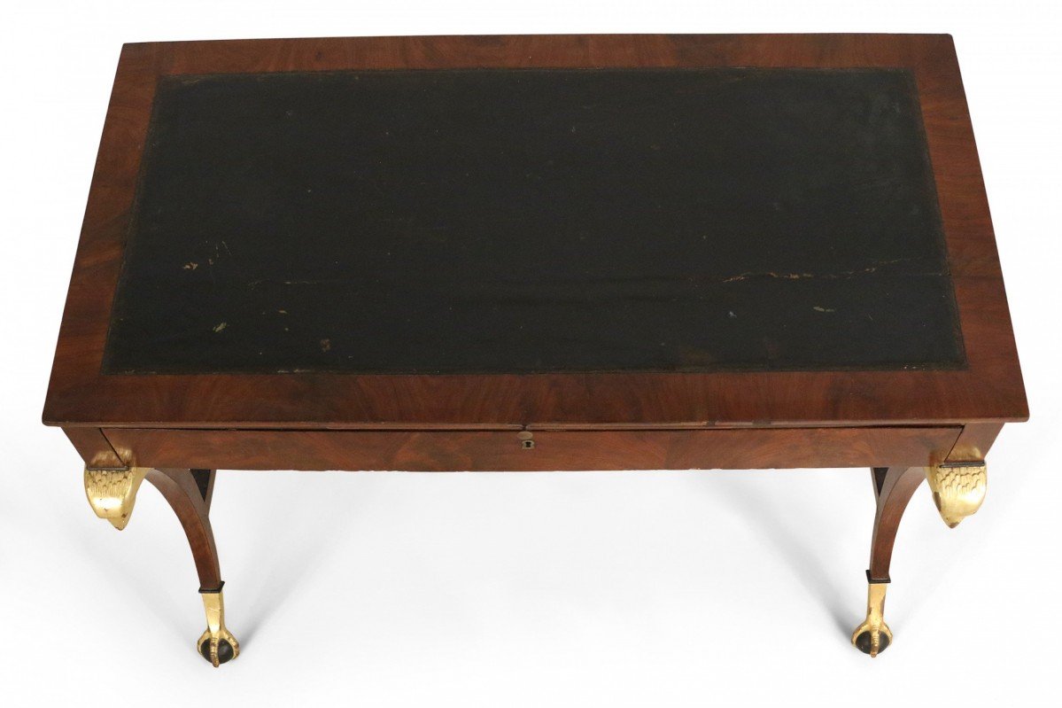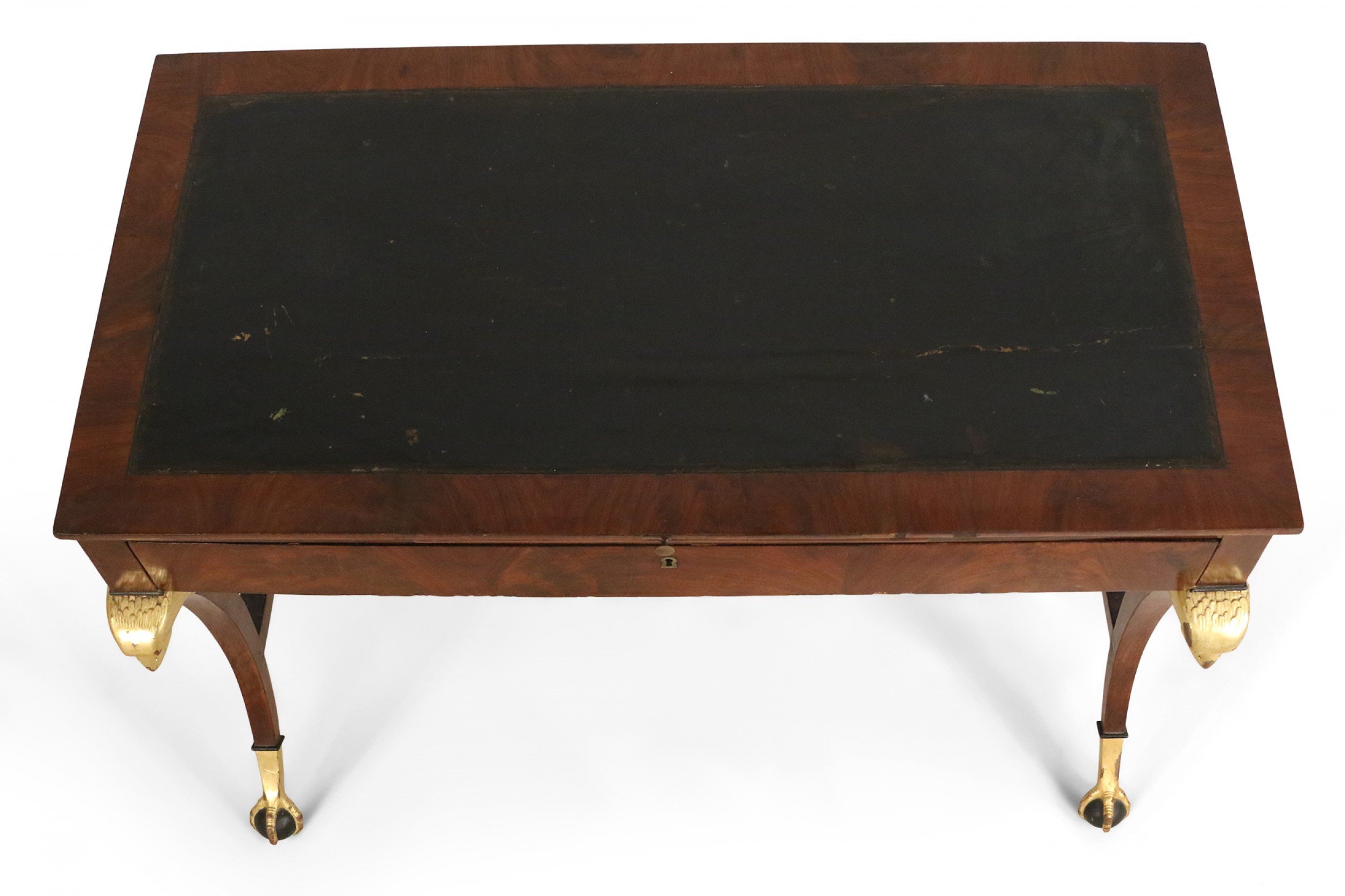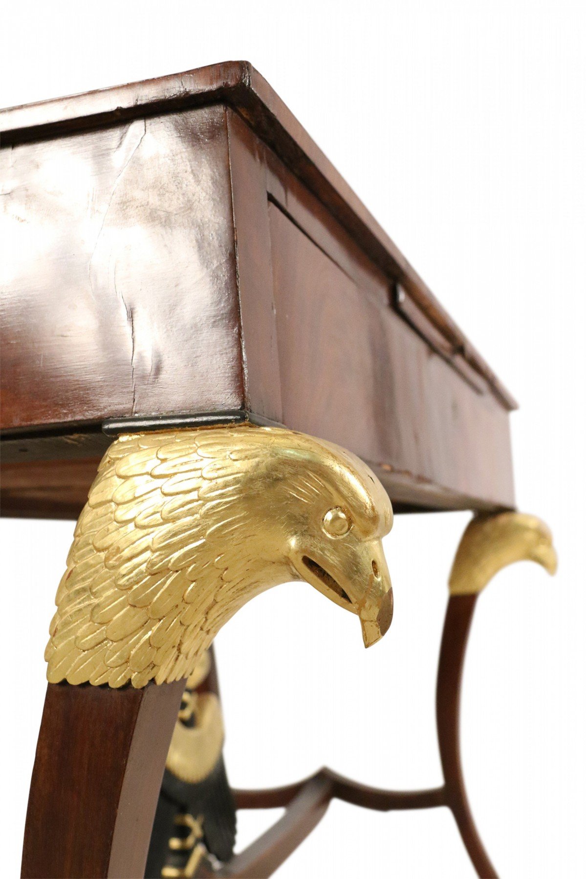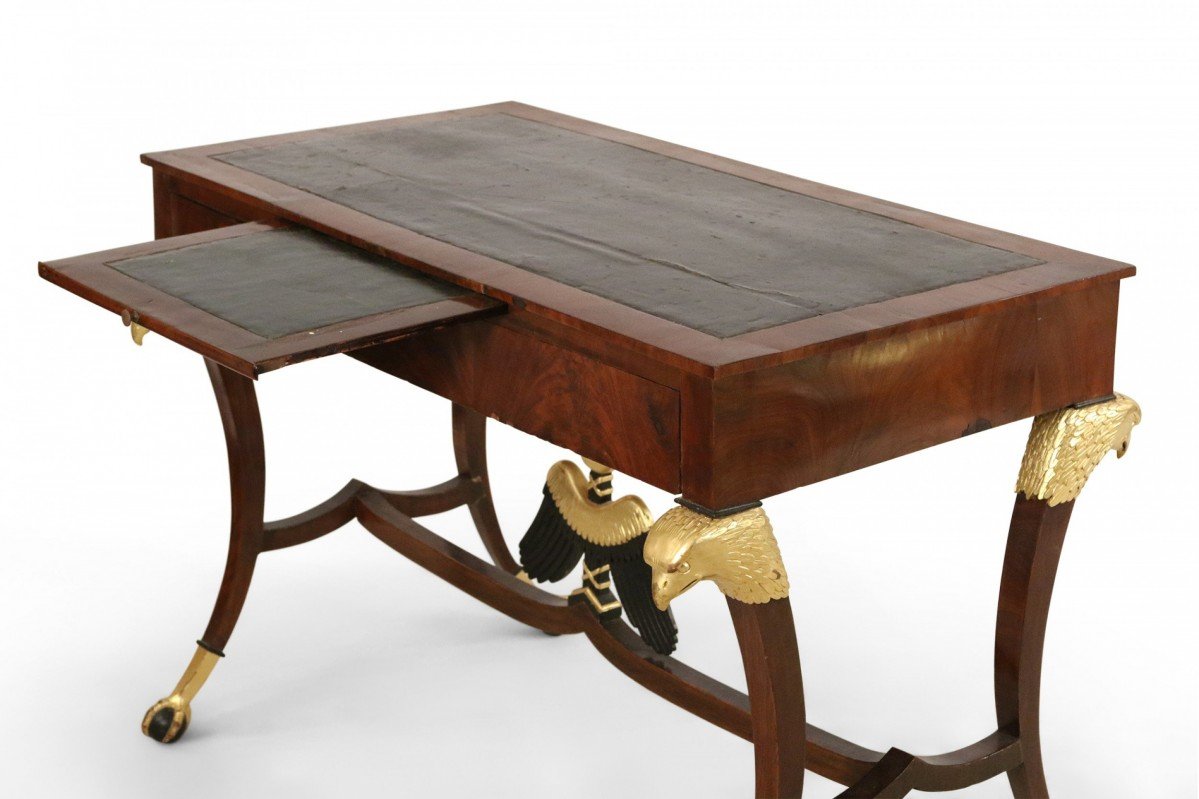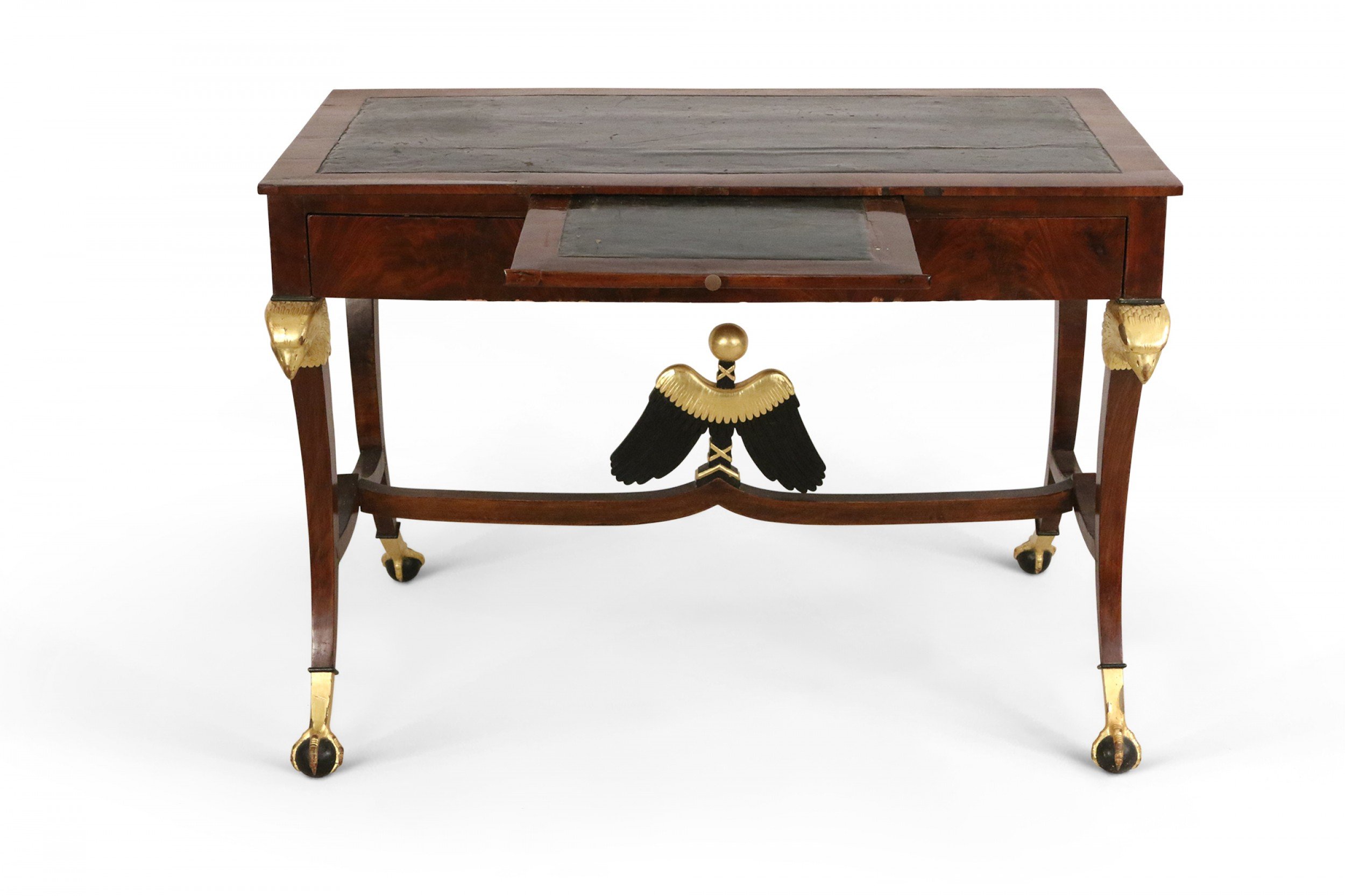 Russian (19th Century) mahogany desk with inset black leather top, key-locked drawer & pull out writing tray with a stretcher having a centered black & gilt eagle connecting 4 saber legs with gilt eagle heads and talon claw & ball feet.